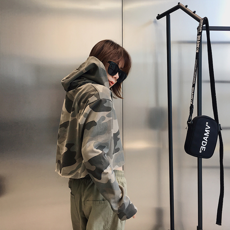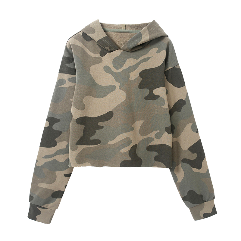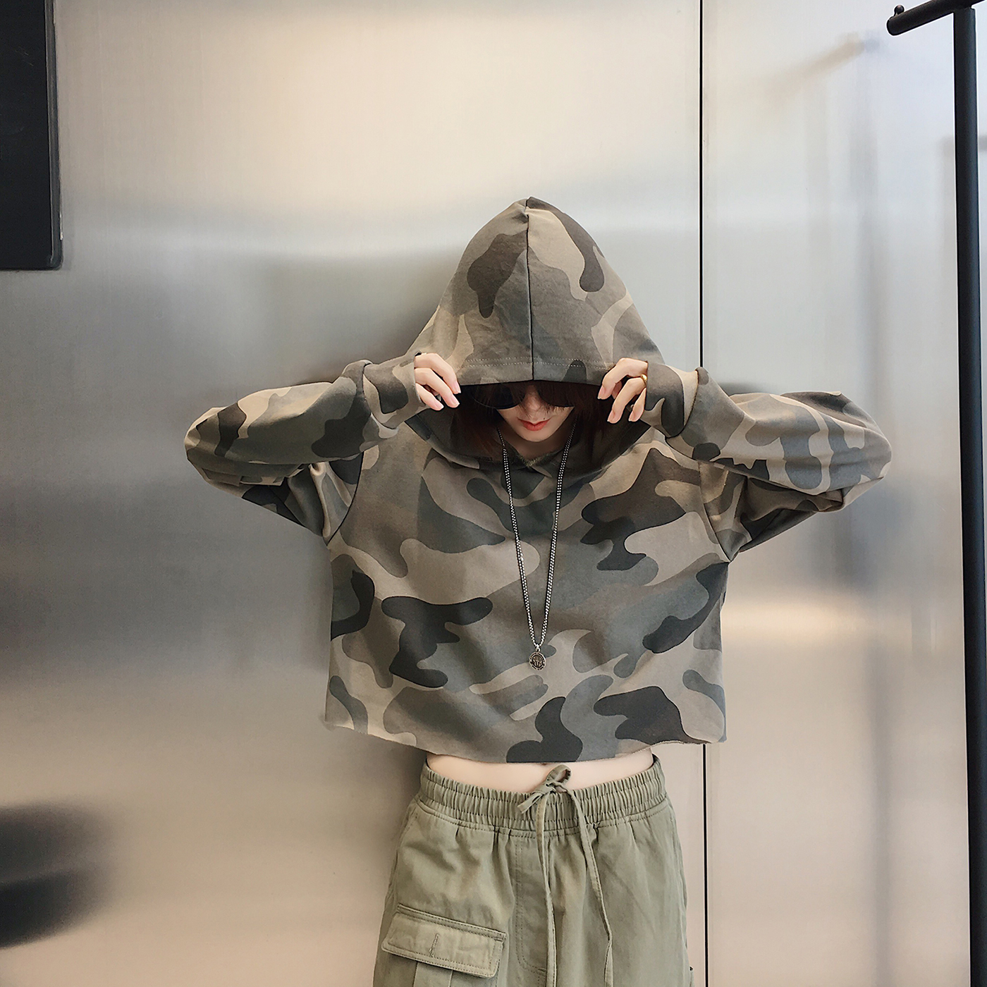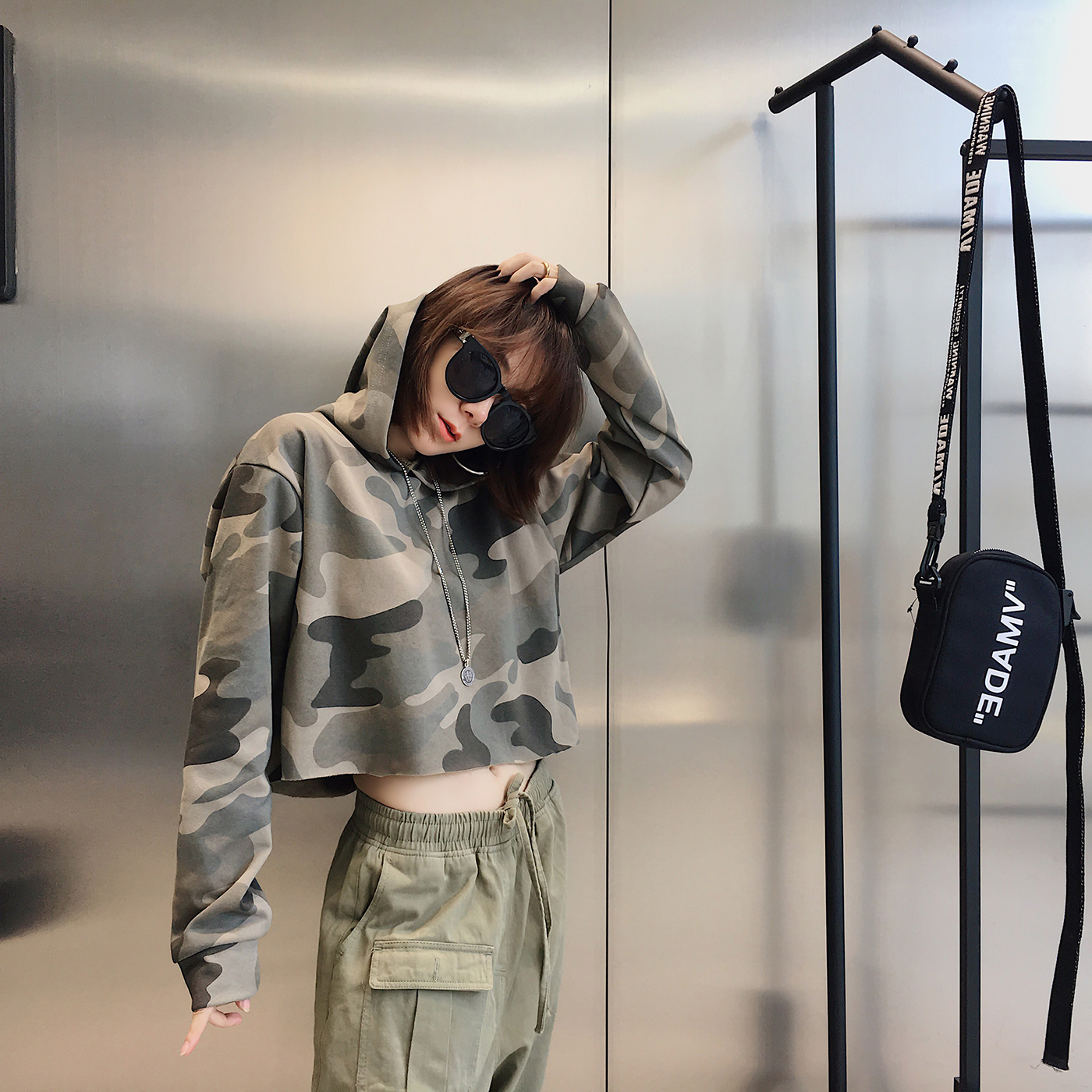 超短款露臍高腰連帽迷彩衛衣女BF風寬鬆百搭長袖舞蹈上衣帥酷外套
