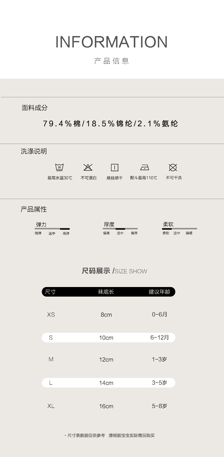 童袜尺码 XS码0-6个月,S码6-12个月,M码1-3岁,L码3-5岁,XL码5-8岁