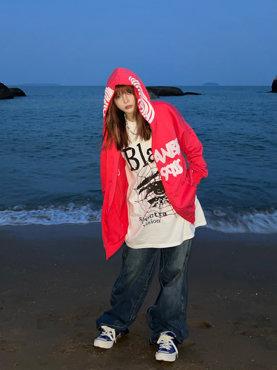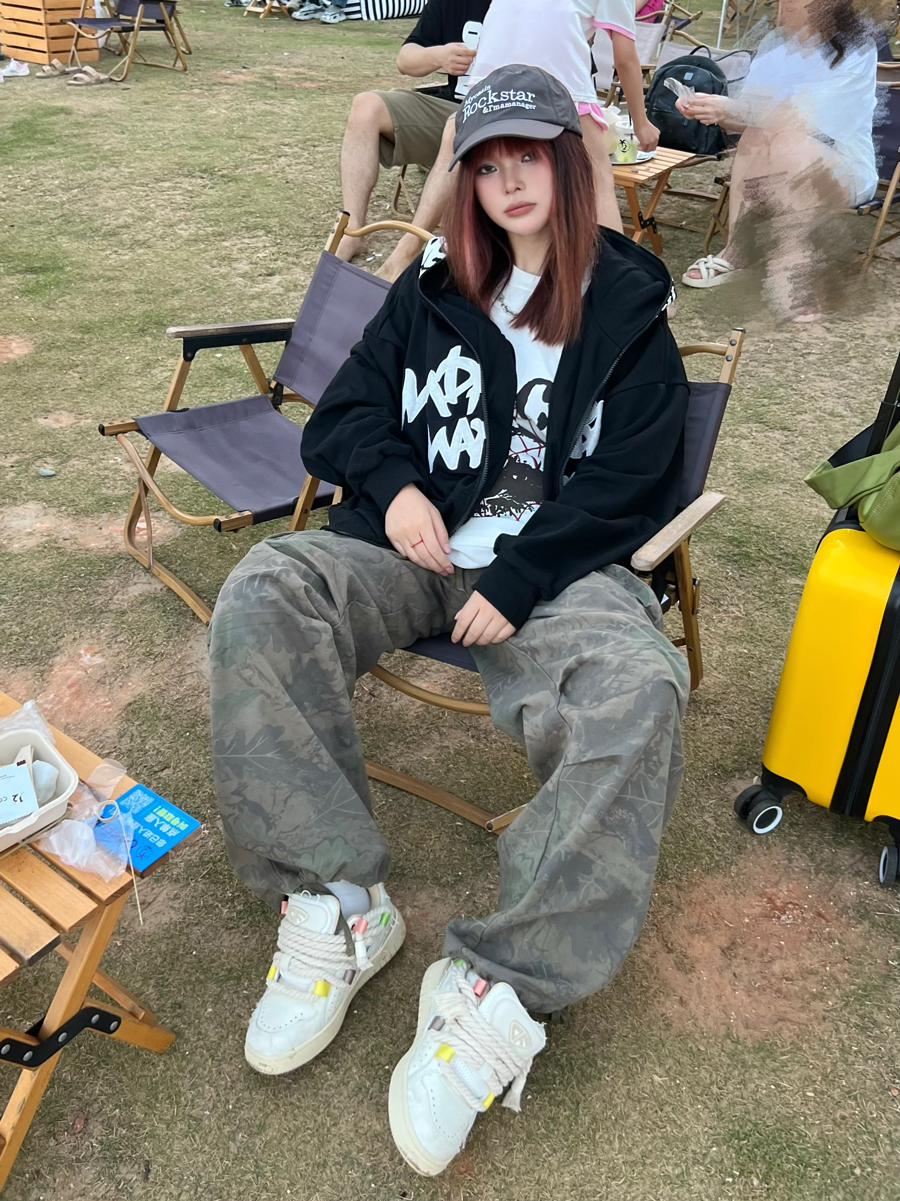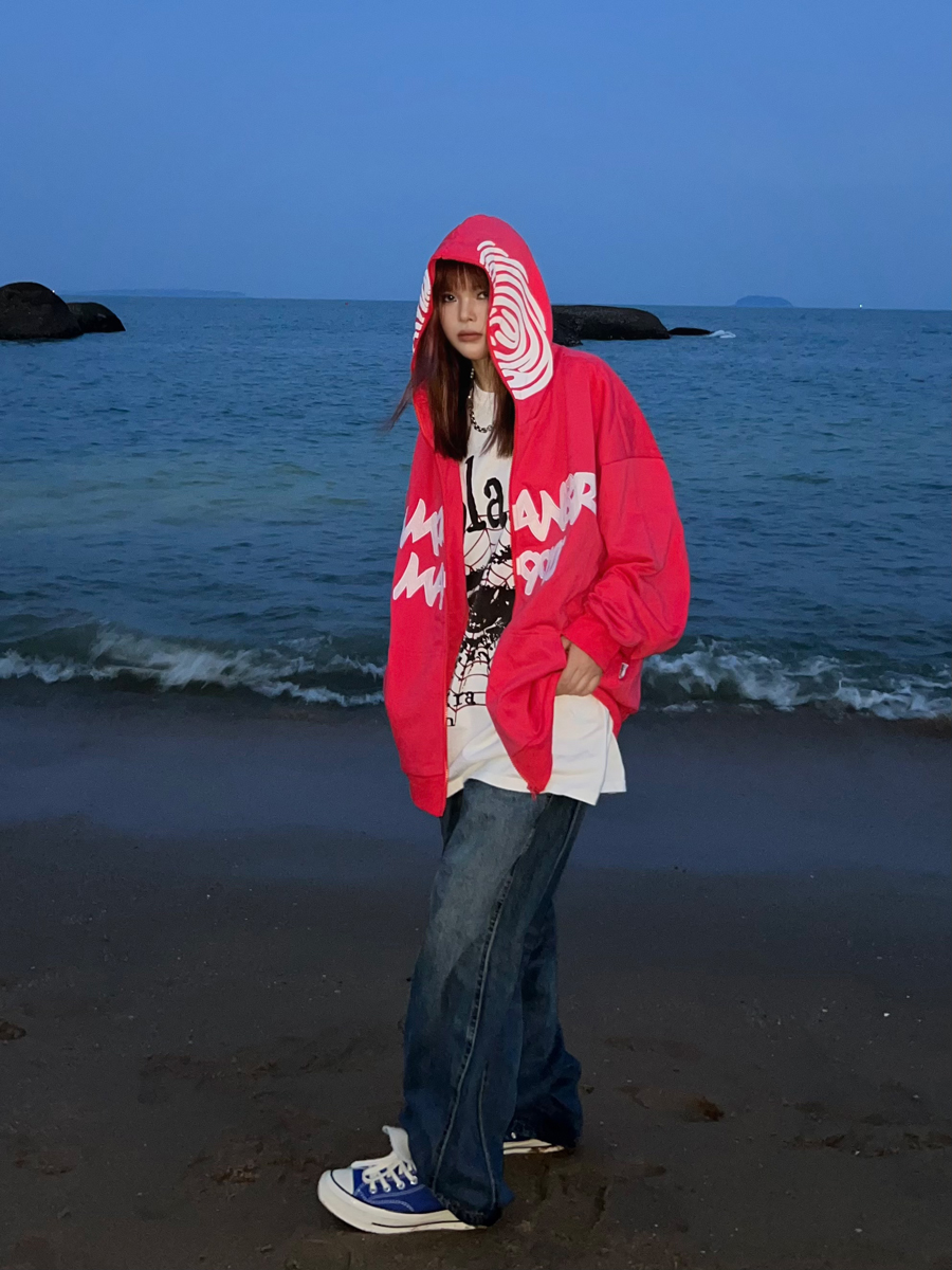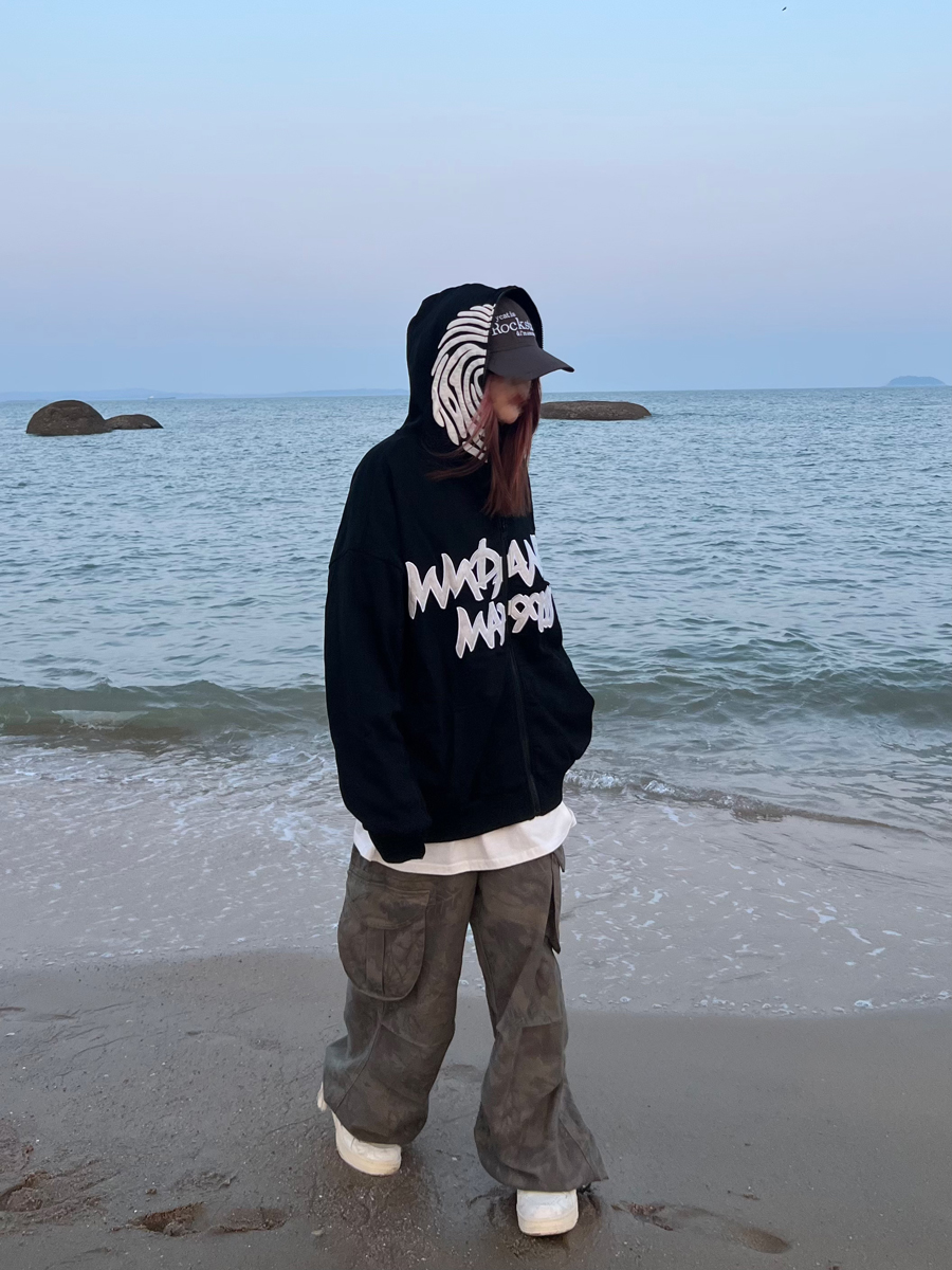 JU403 原創美式街頭字母連帽運動衫小眾情侶寬鬆休閒拉鍊開衫外套潮