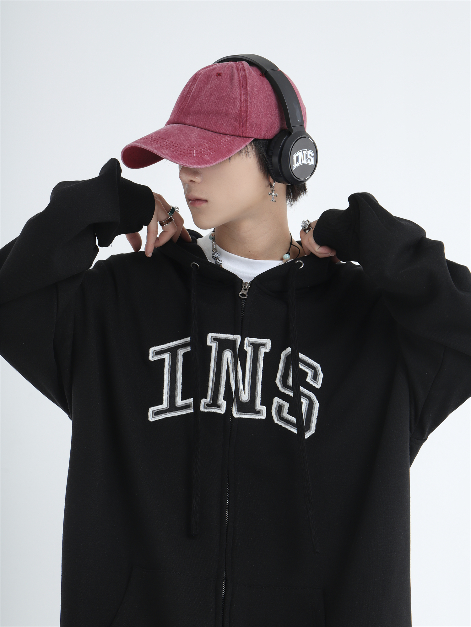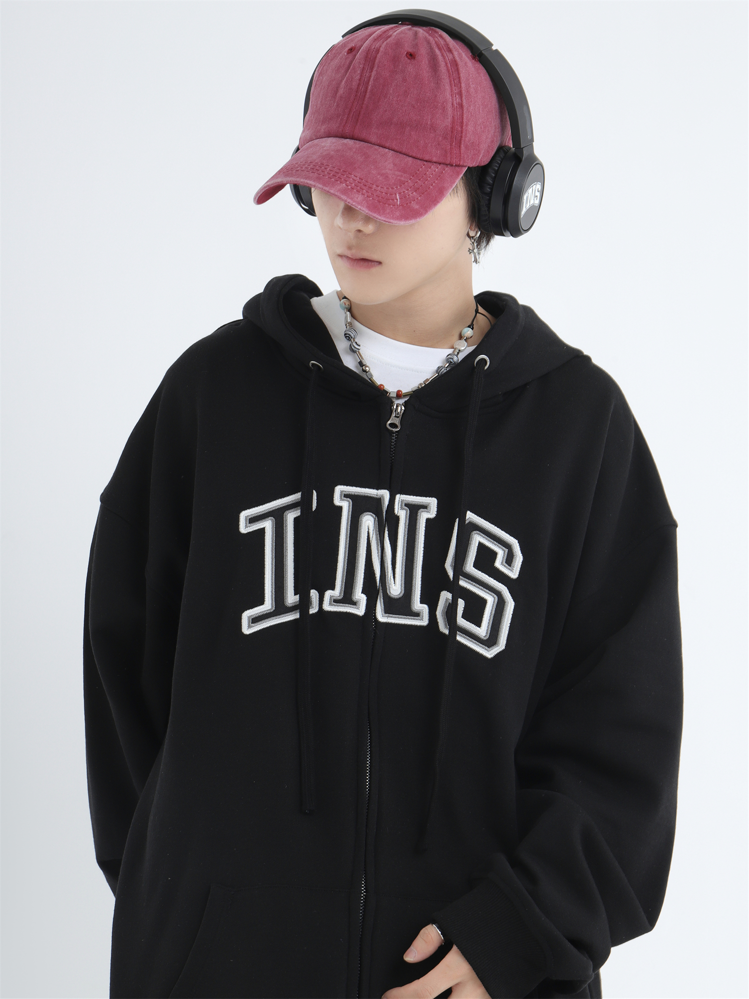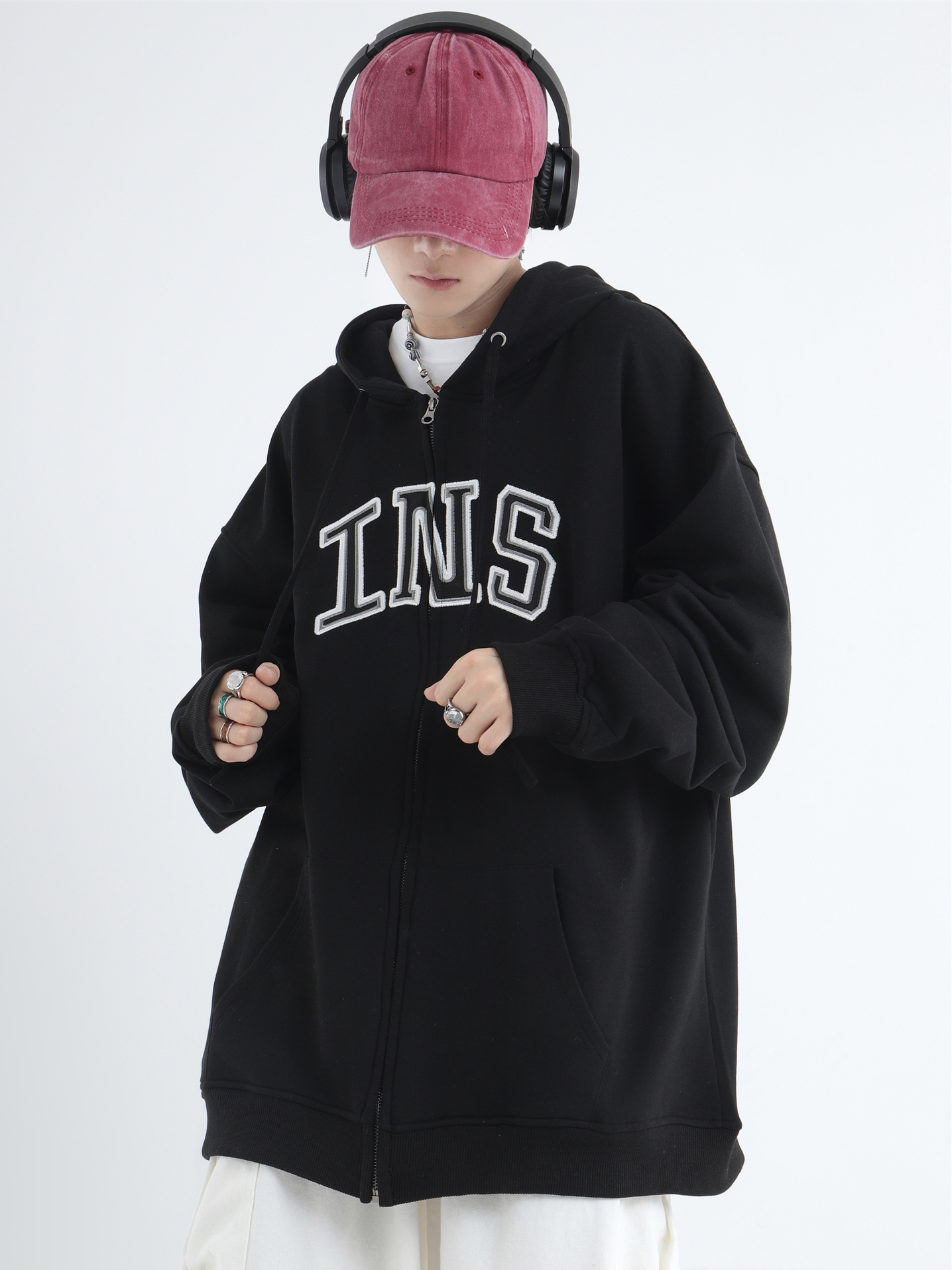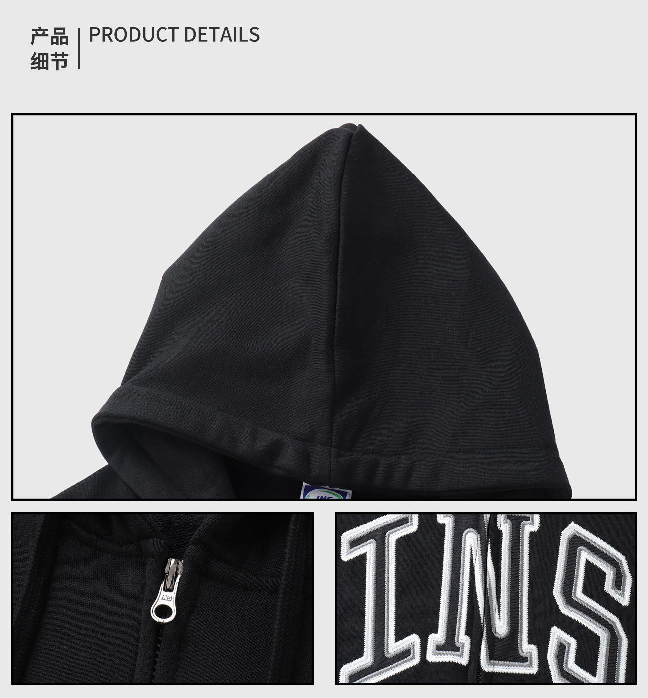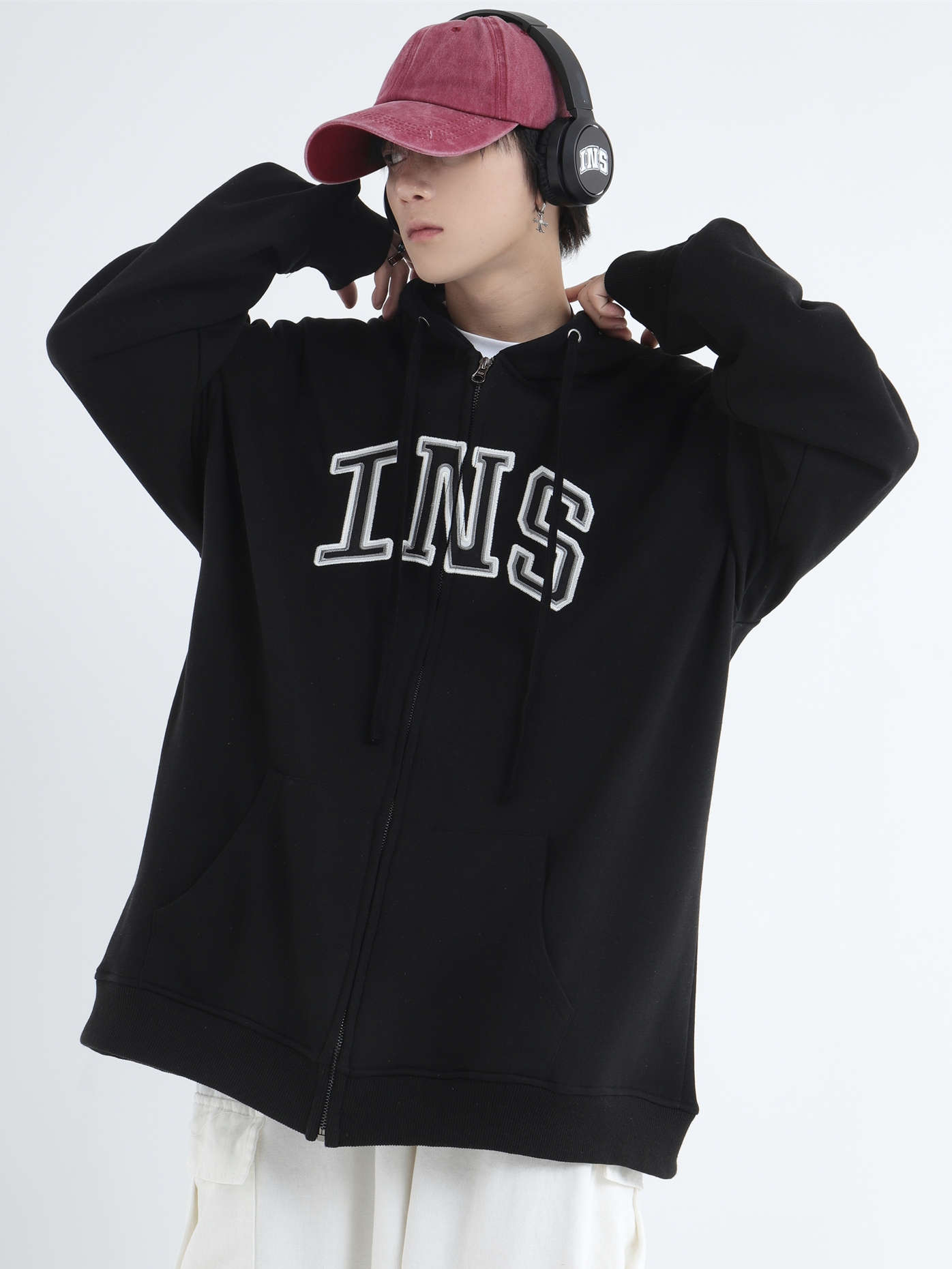 INSstudios 布貼繡LOGO開衫厚棉T自制國潮情侶百搭拉鍊連帽外套男