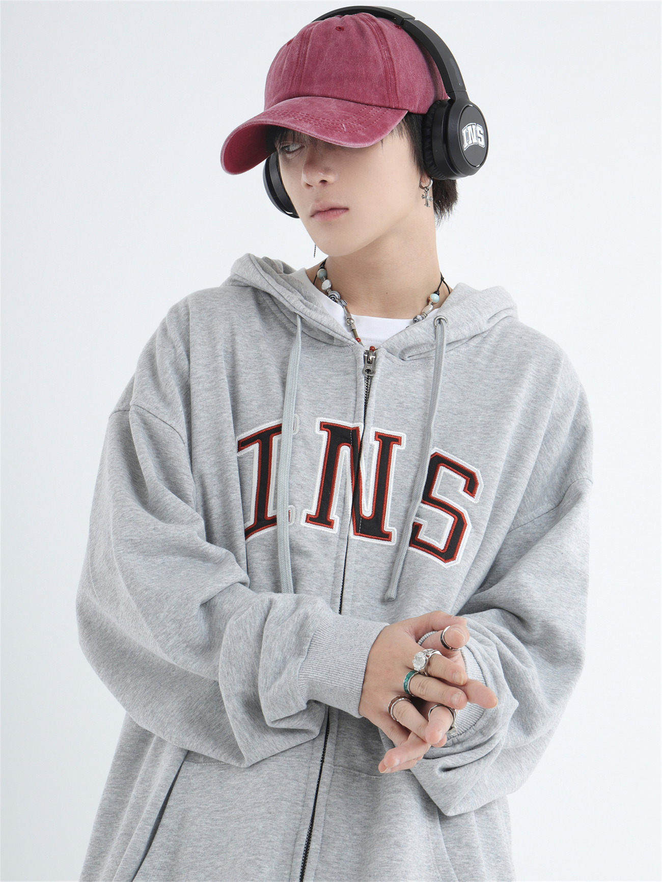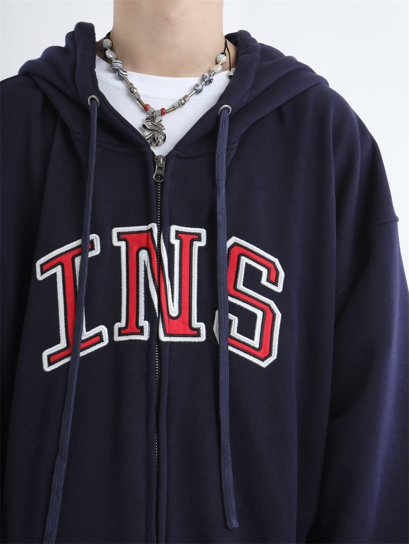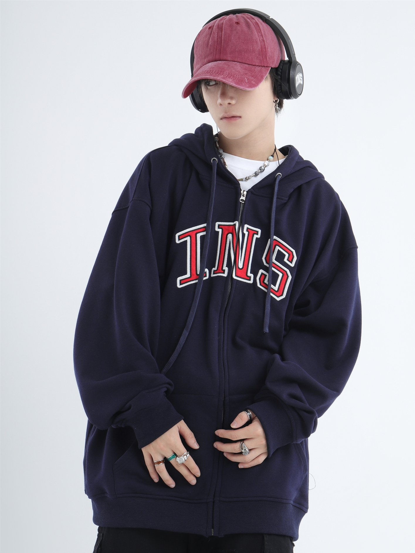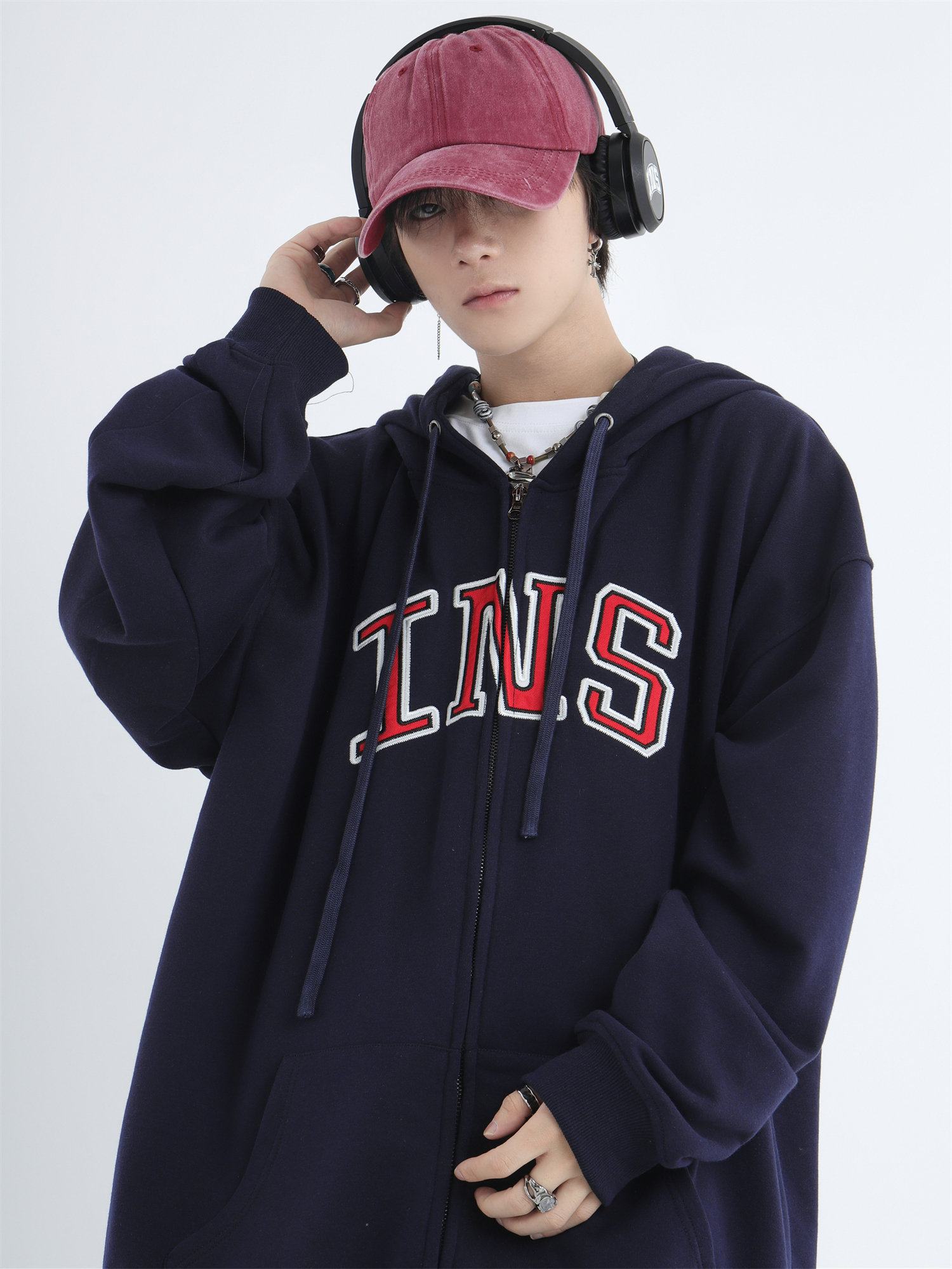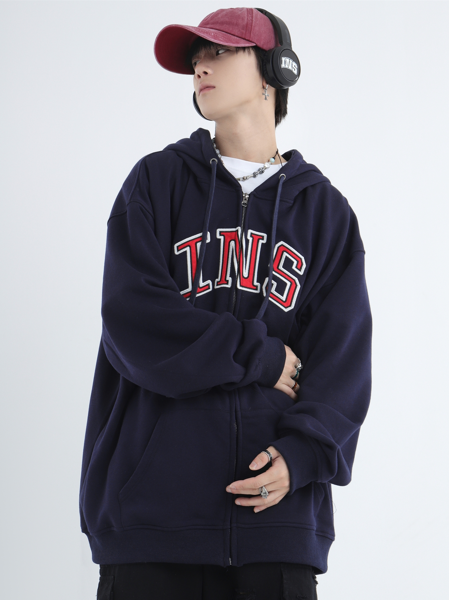 INSstudios 布貼繡LOGO開衫厚棉T自制國潮情侶百搭拉鍊連帽外套男