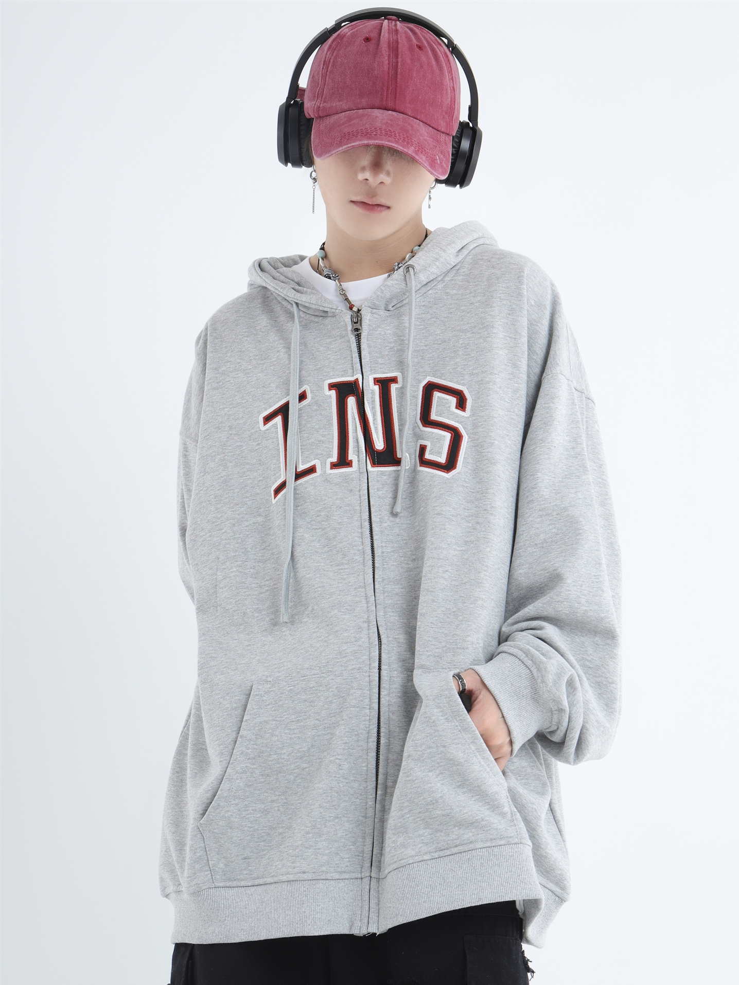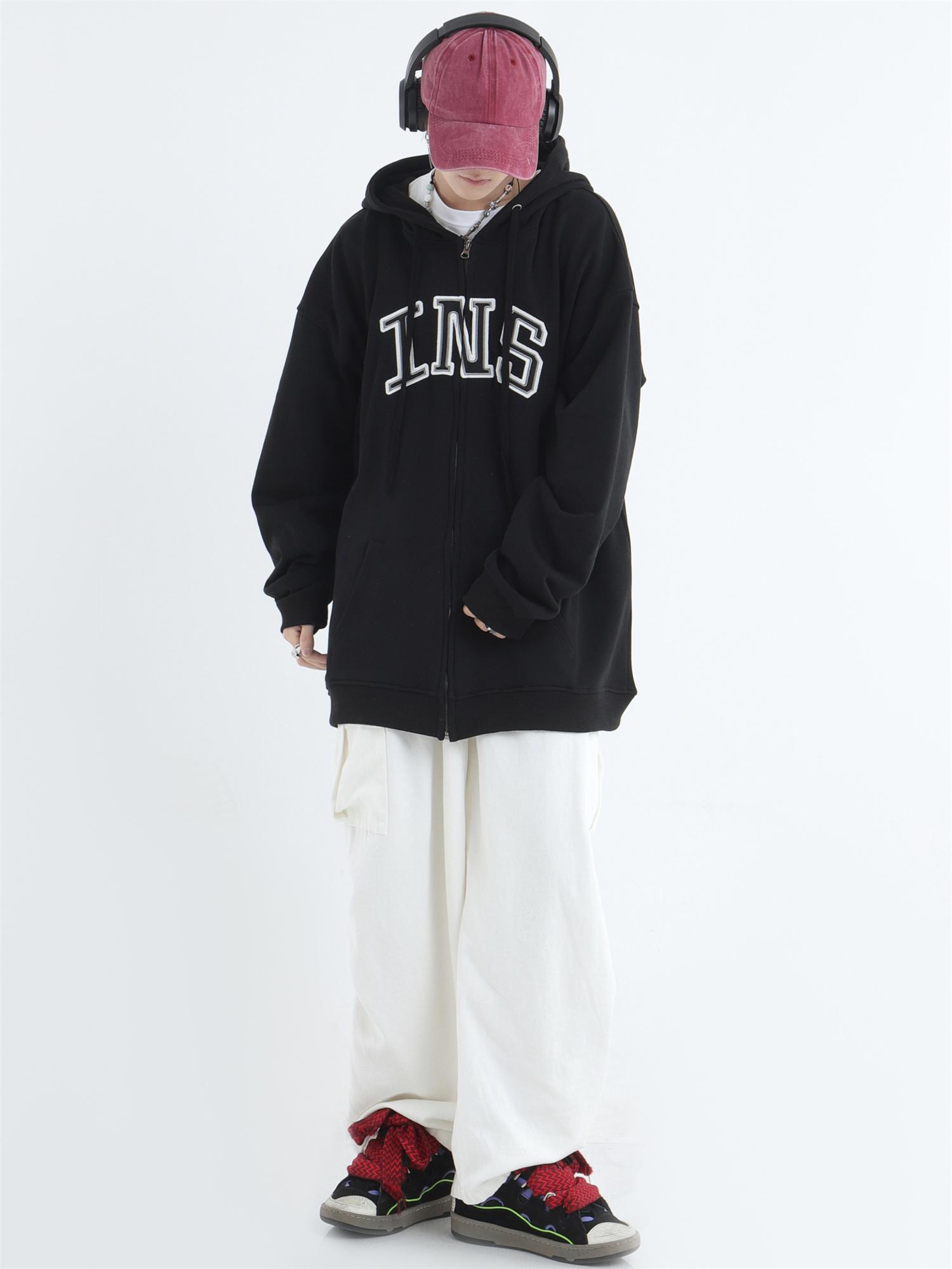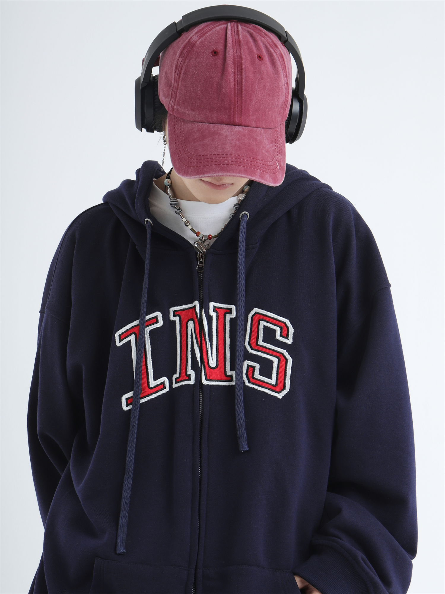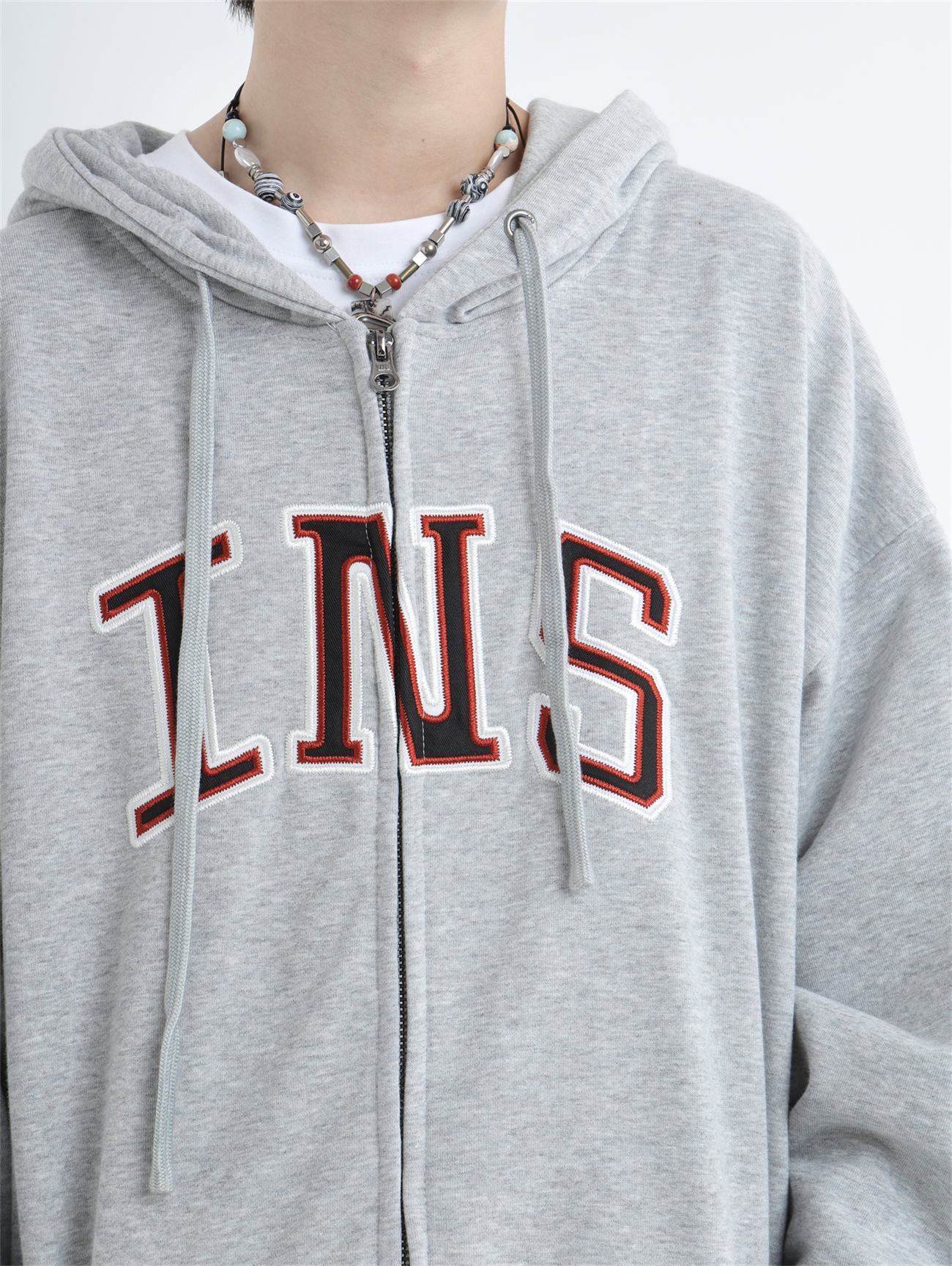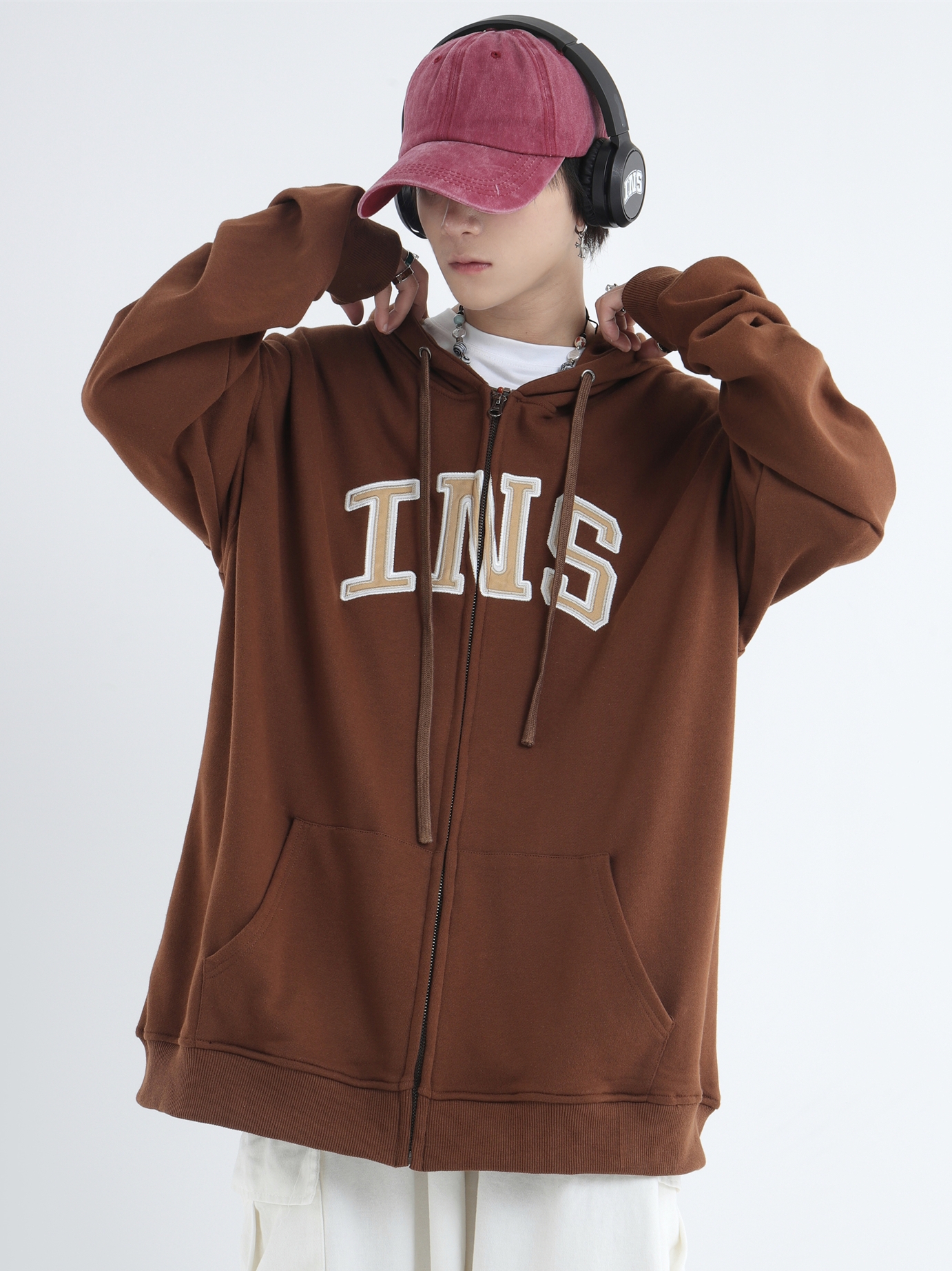 INSstudios 布貼繡LOGO開衫厚棉T自制國潮情侶百搭拉鍊連帽外套男