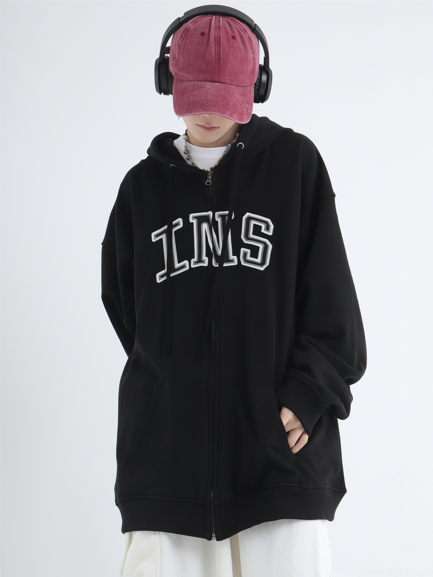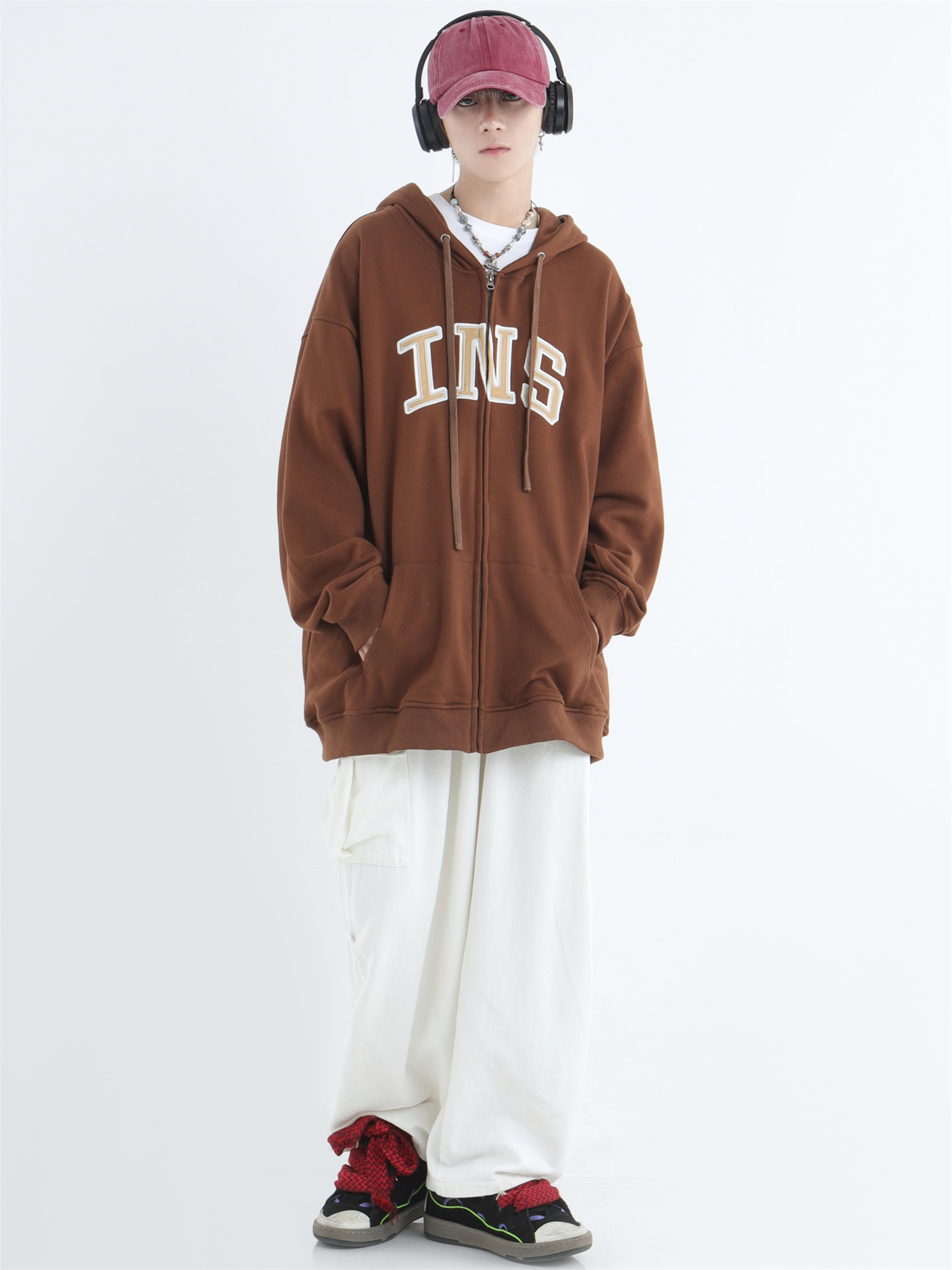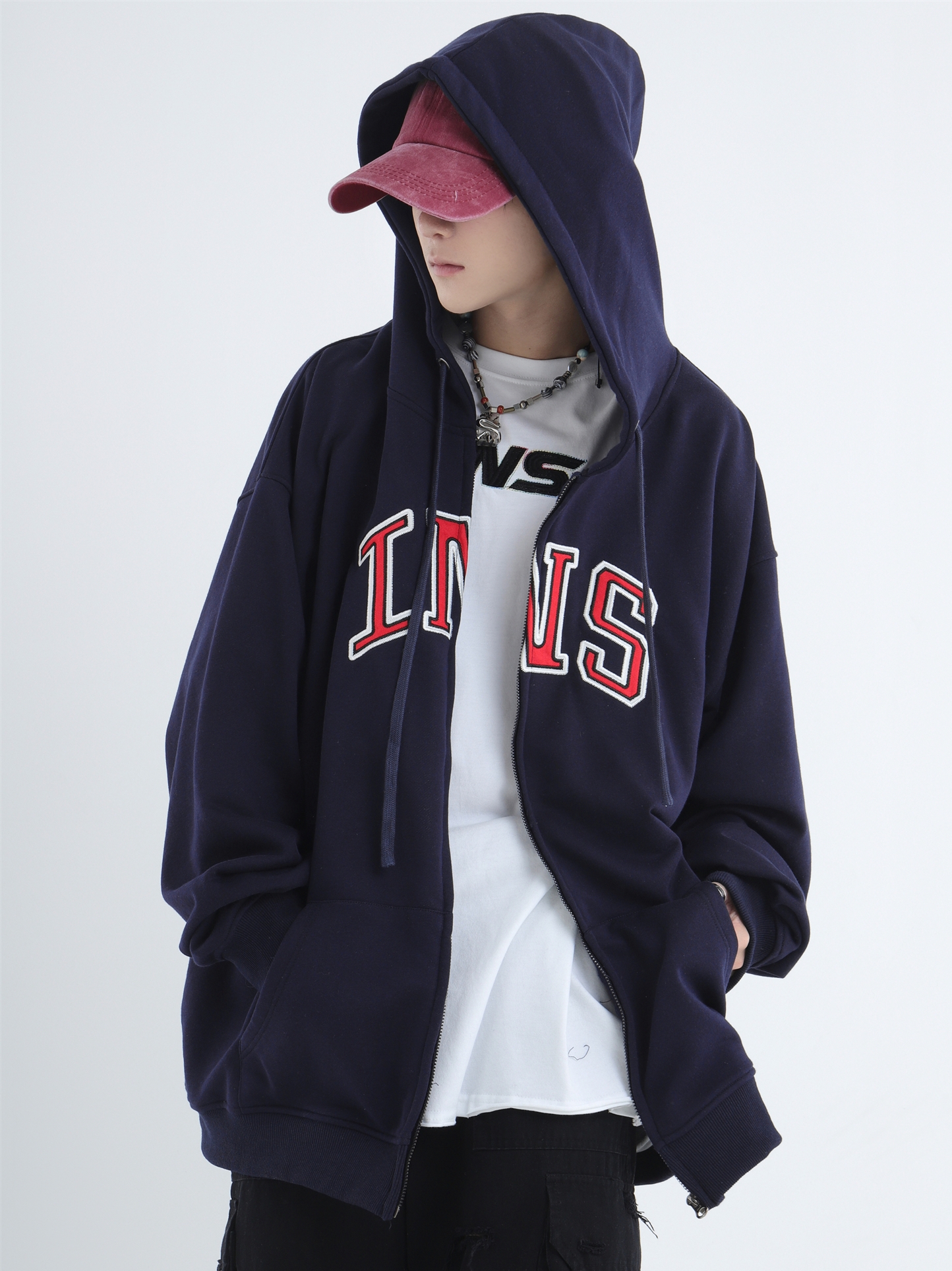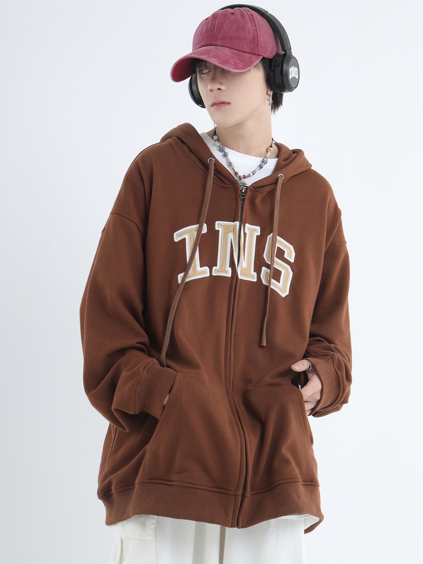 INSstudios 布貼繡LOGO開衫厚棉T自制國潮情侶百搭拉鍊連帽外套男