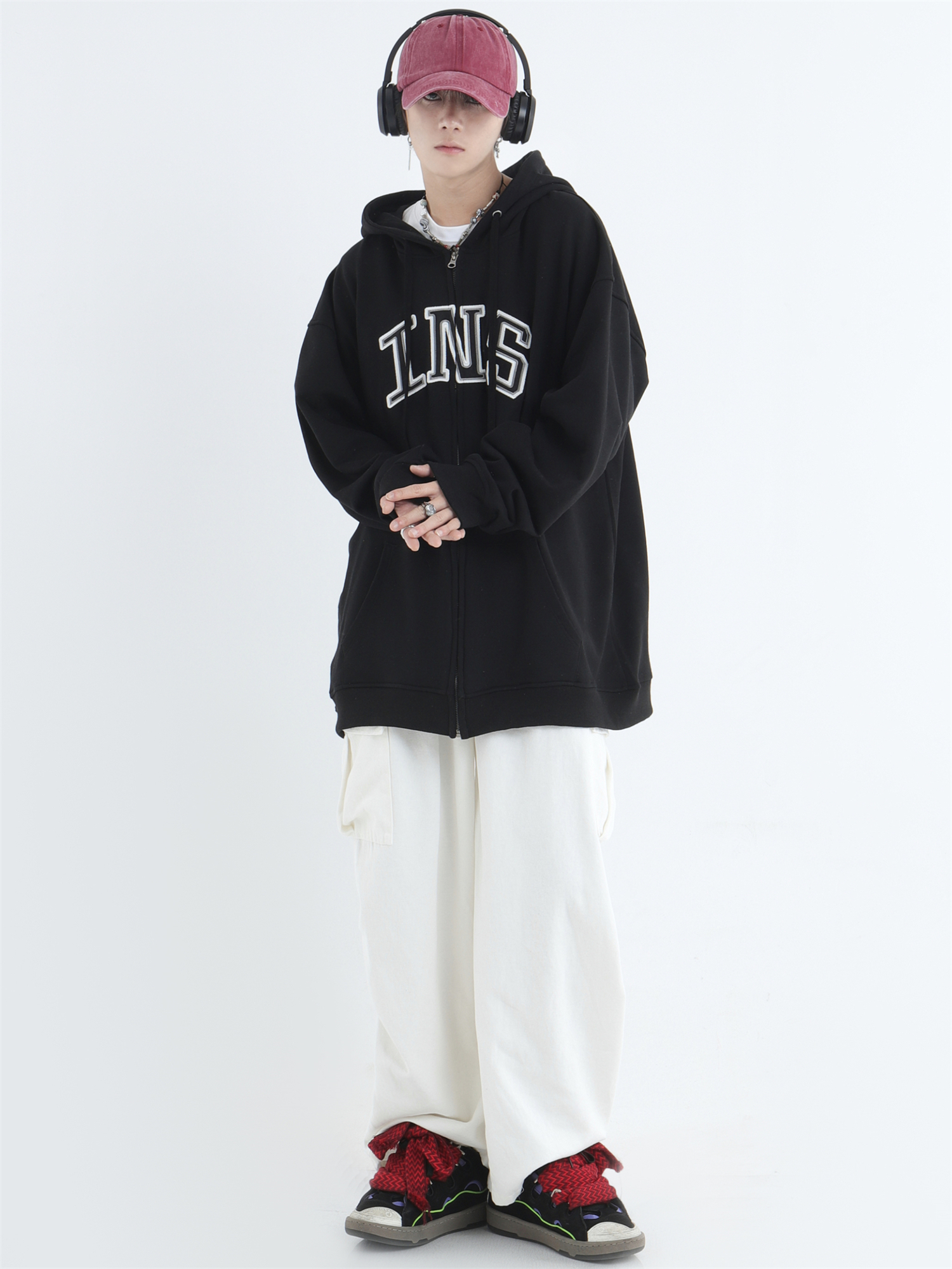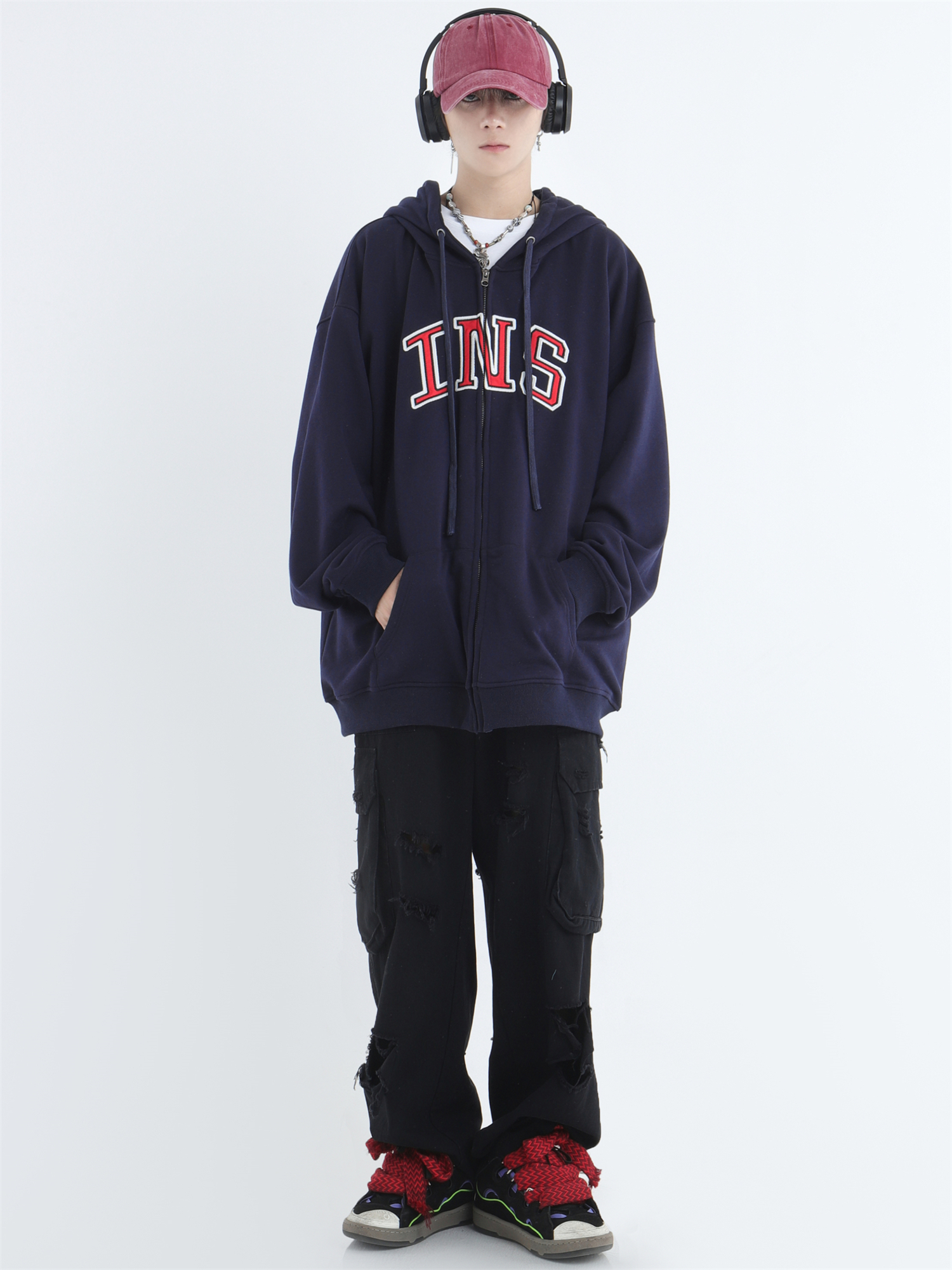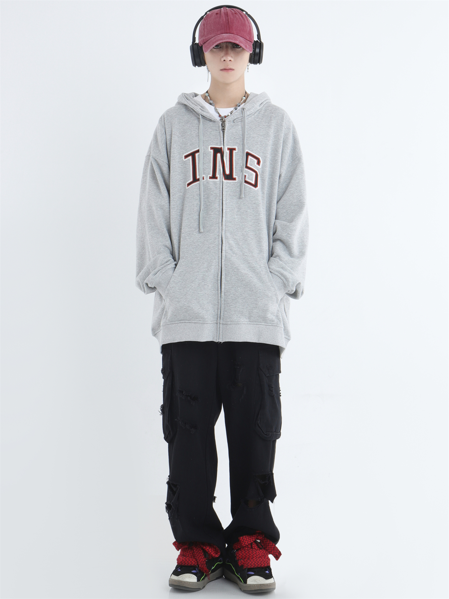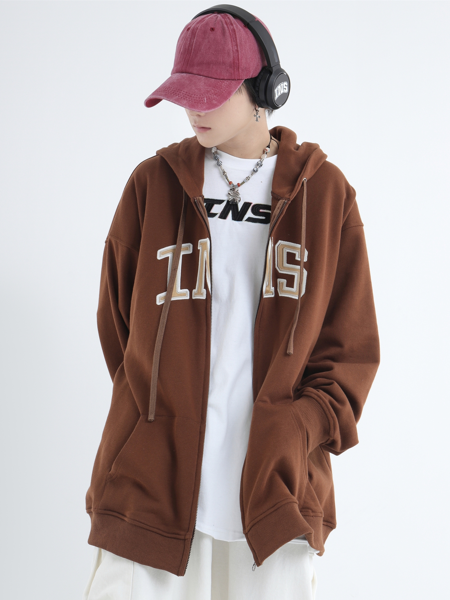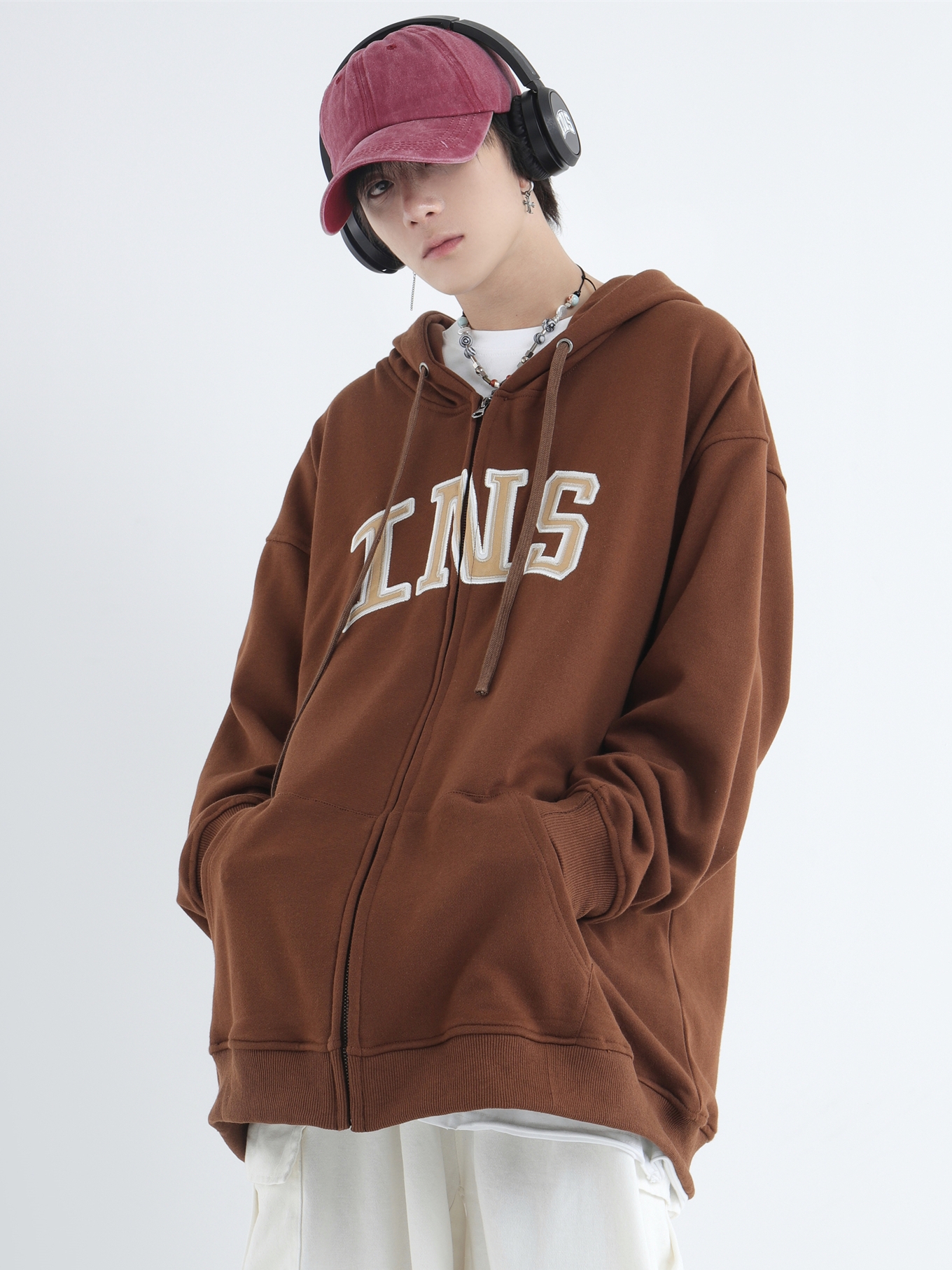 INSstudios 布貼繡LOGO開衫厚棉T自制國潮情侶百搭拉鍊連帽外套男