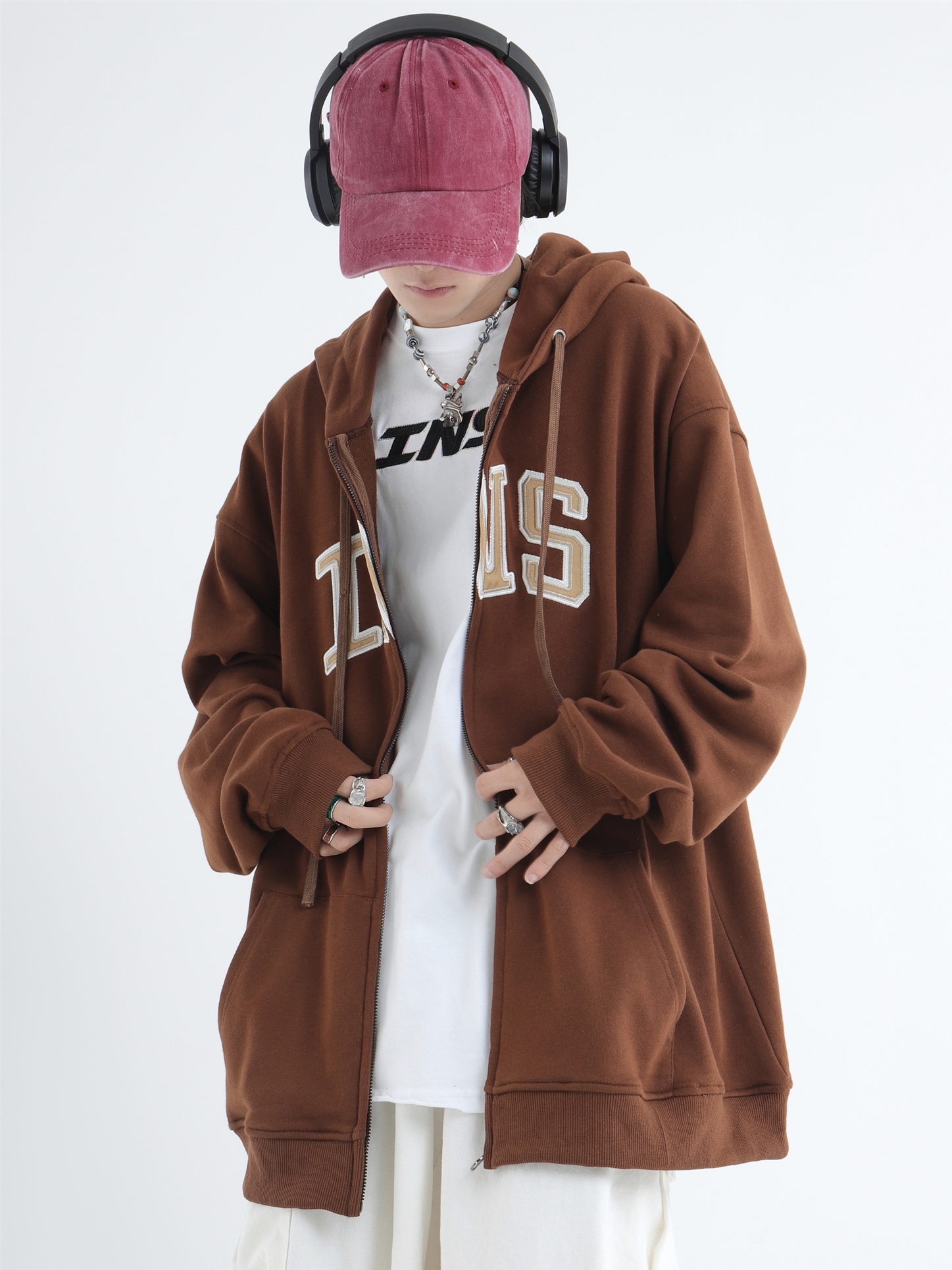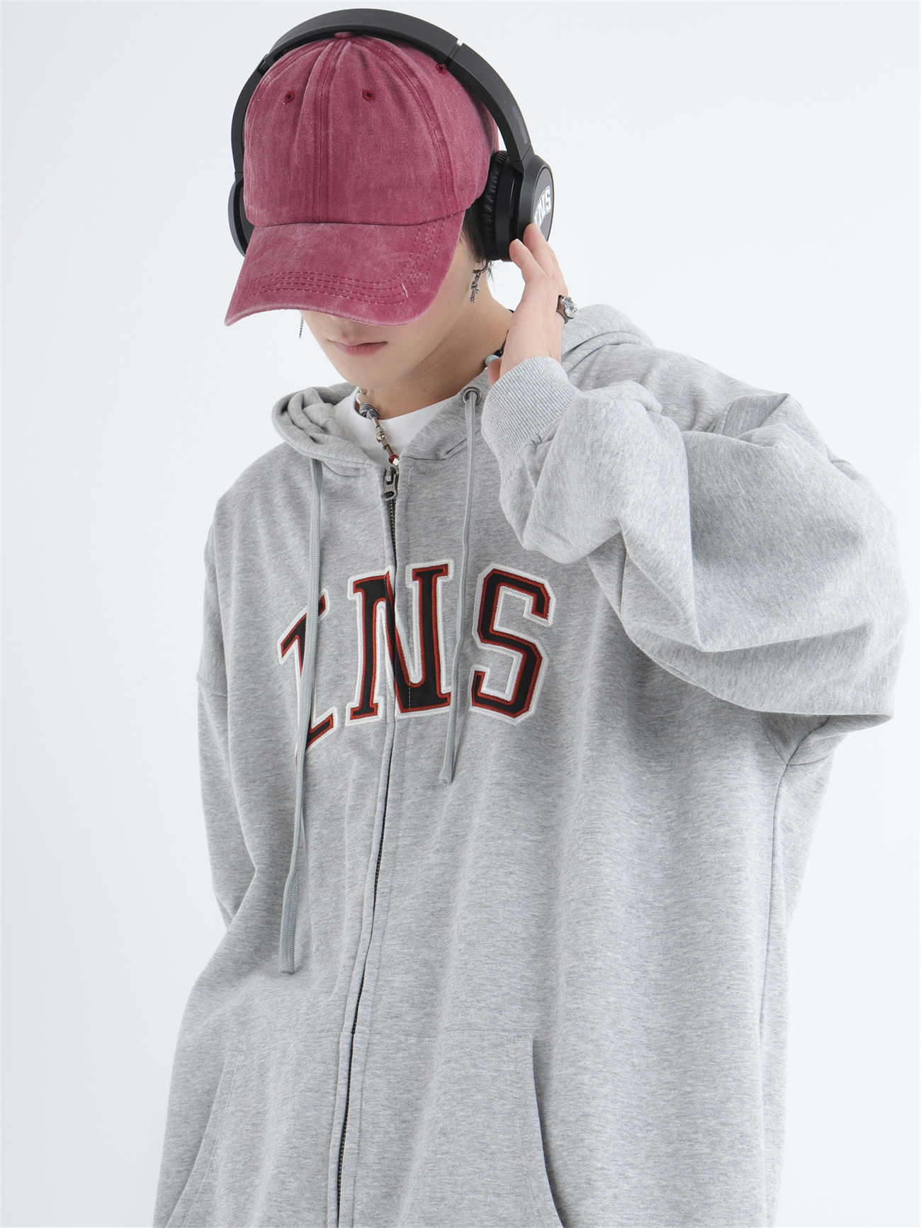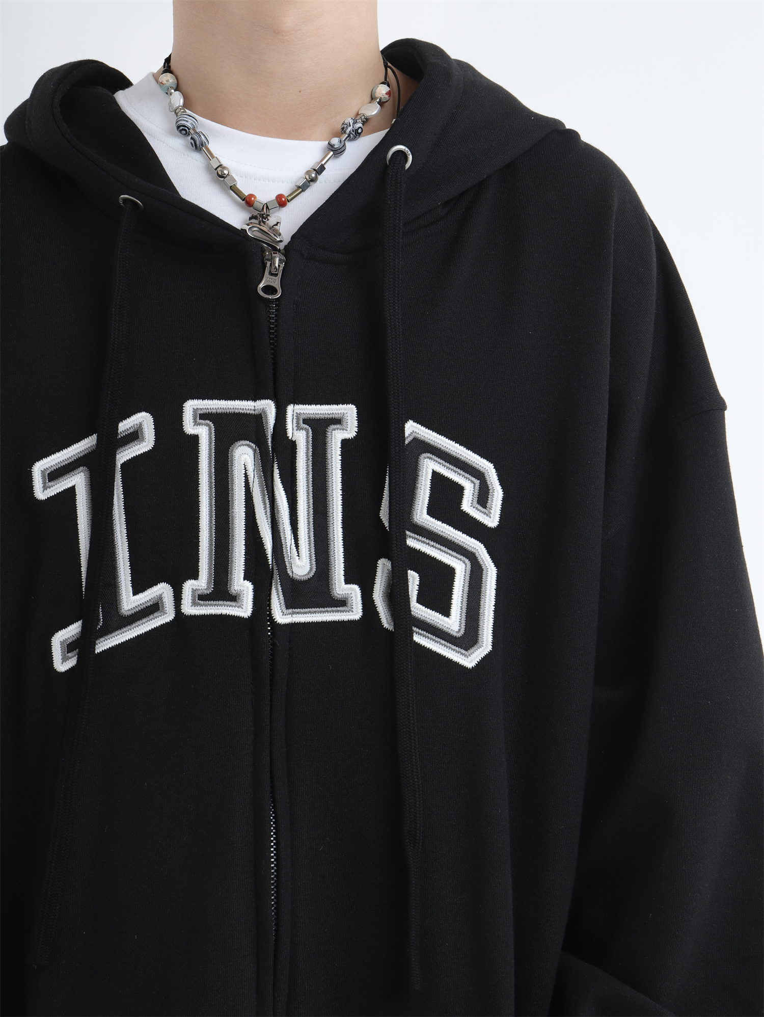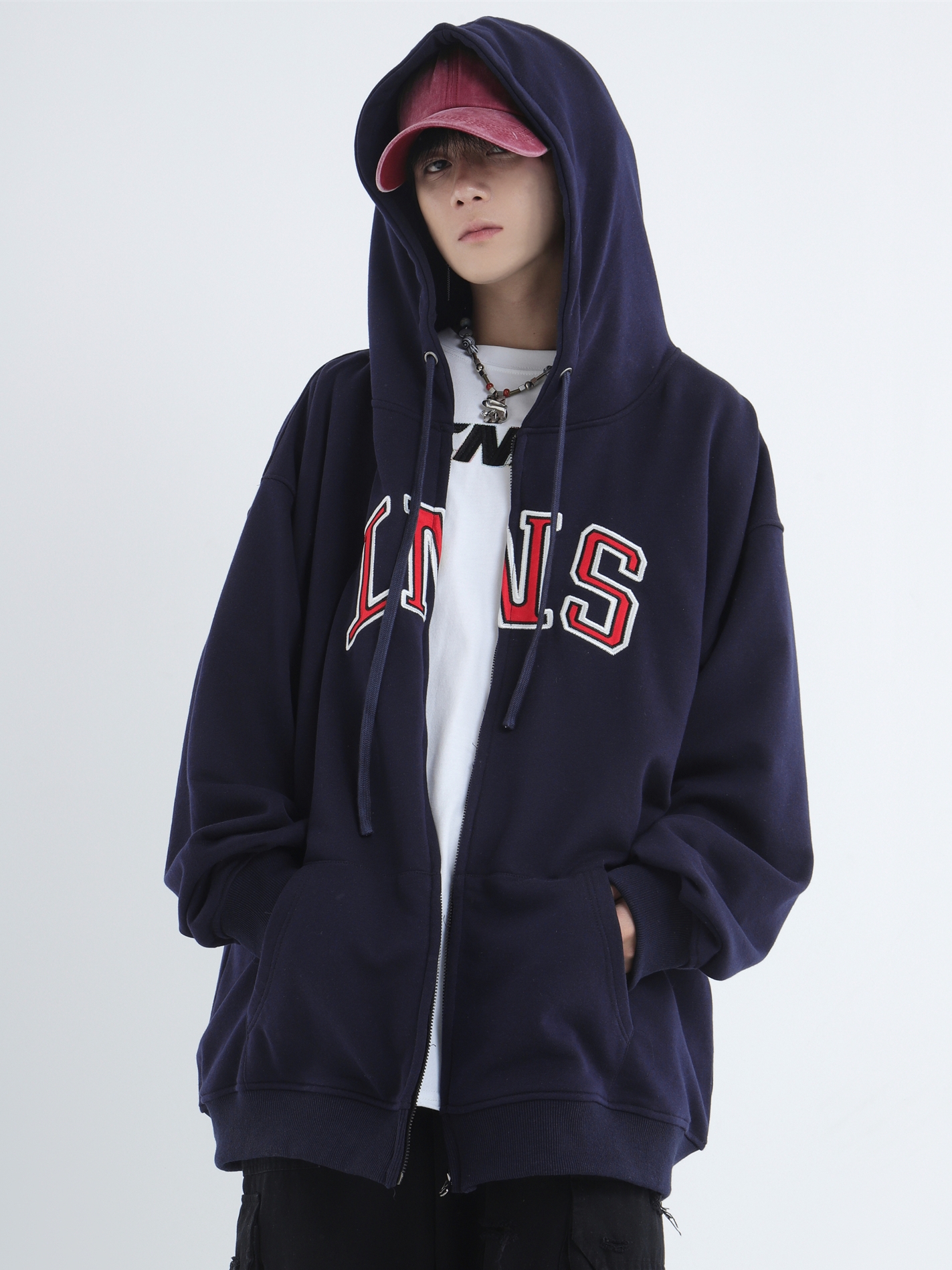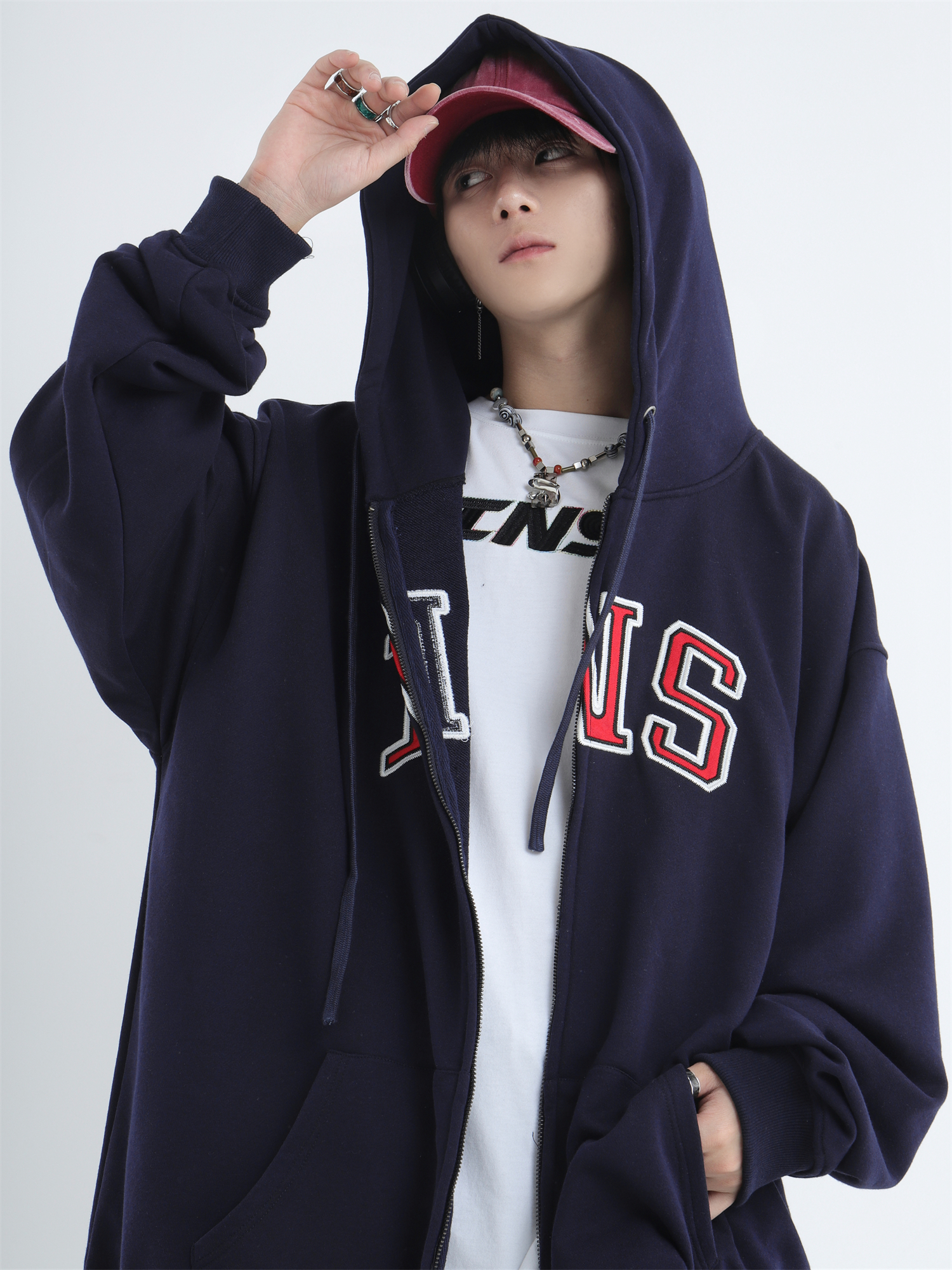 INSstudios 布貼繡LOGO開衫厚棉T自制國潮情侶百搭拉鍊連帽外套男