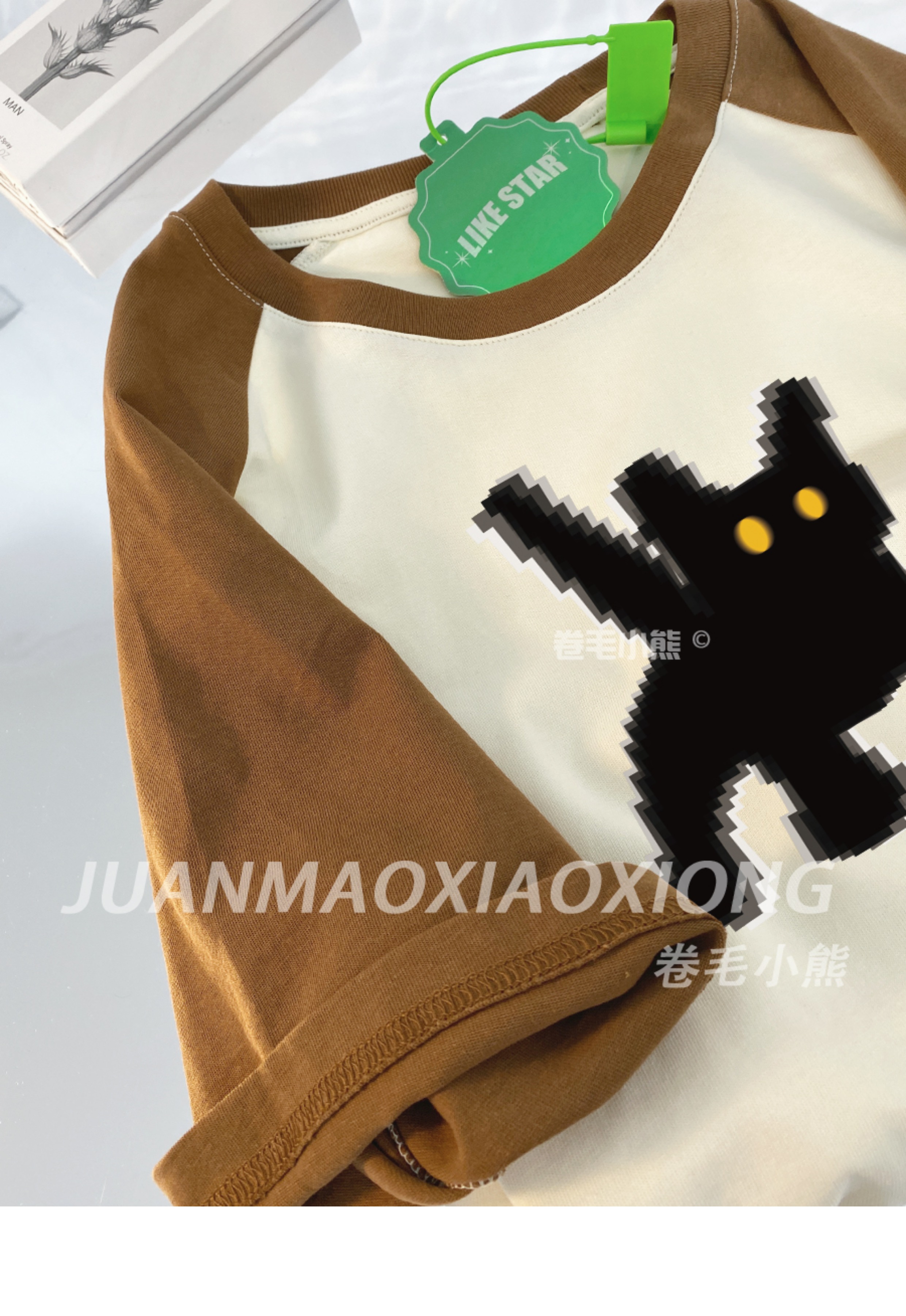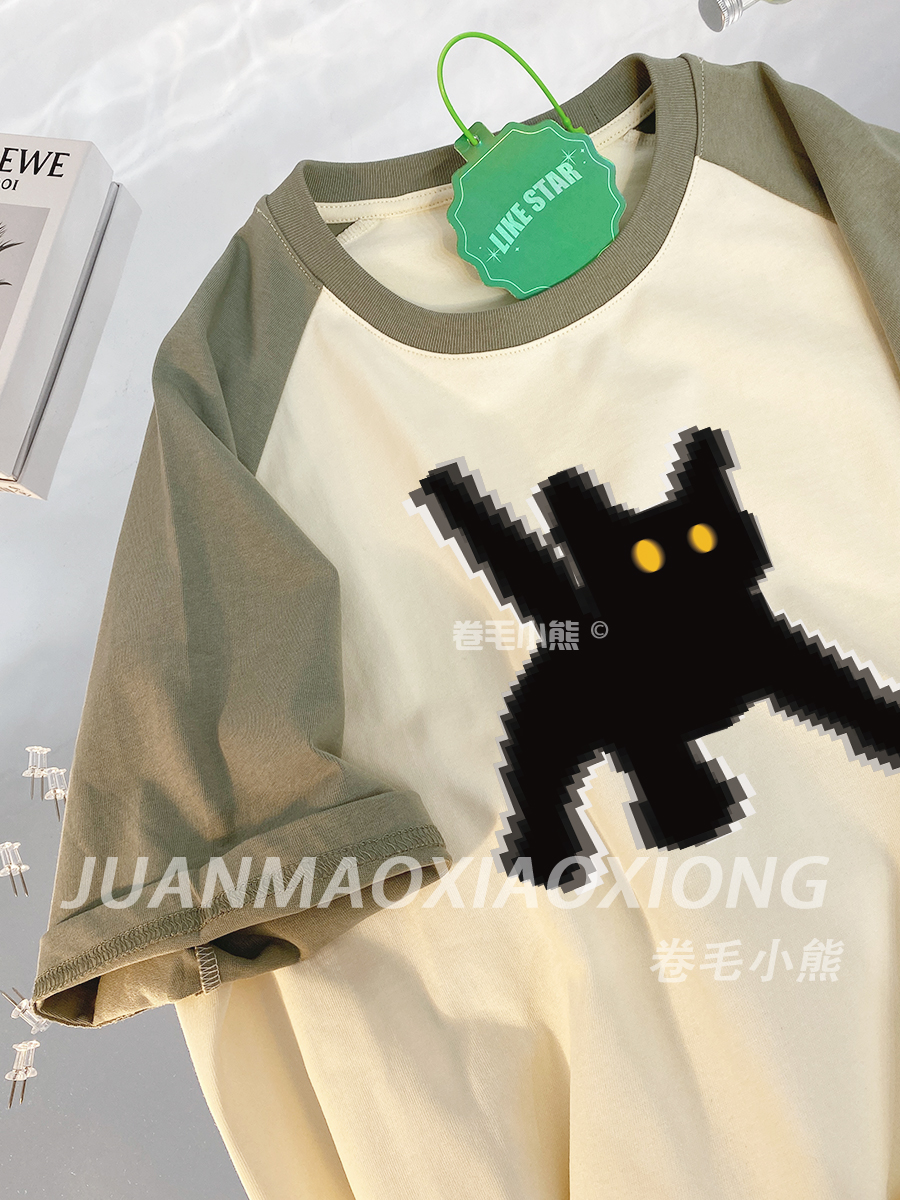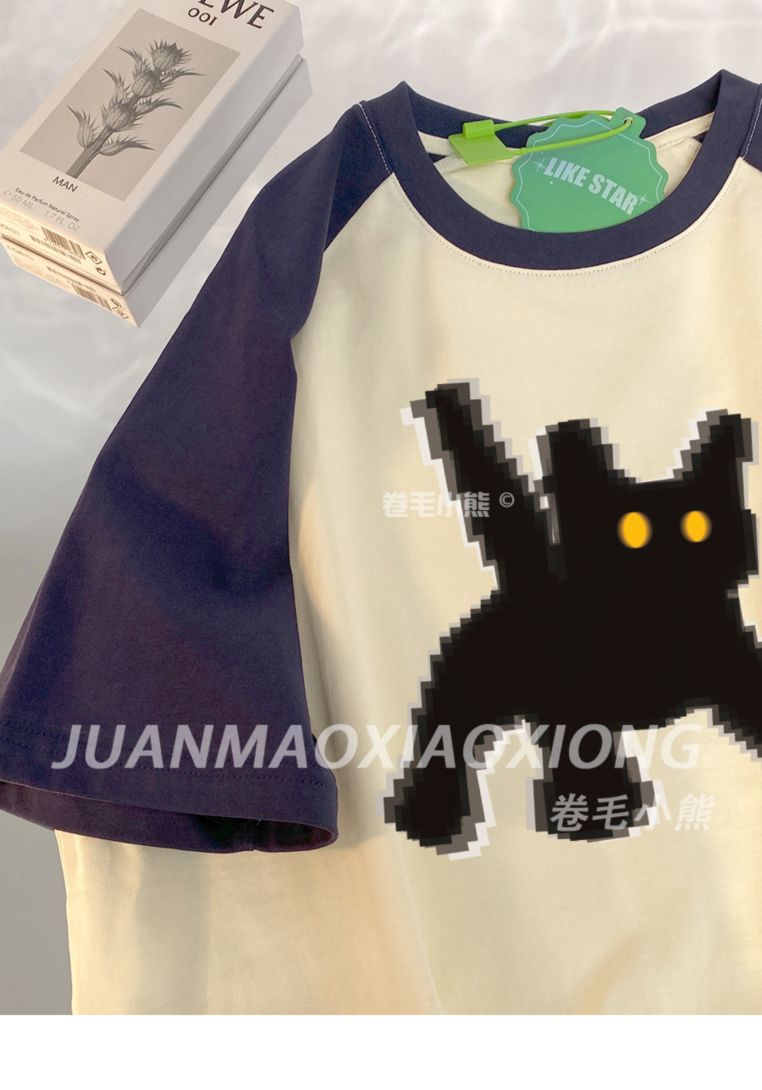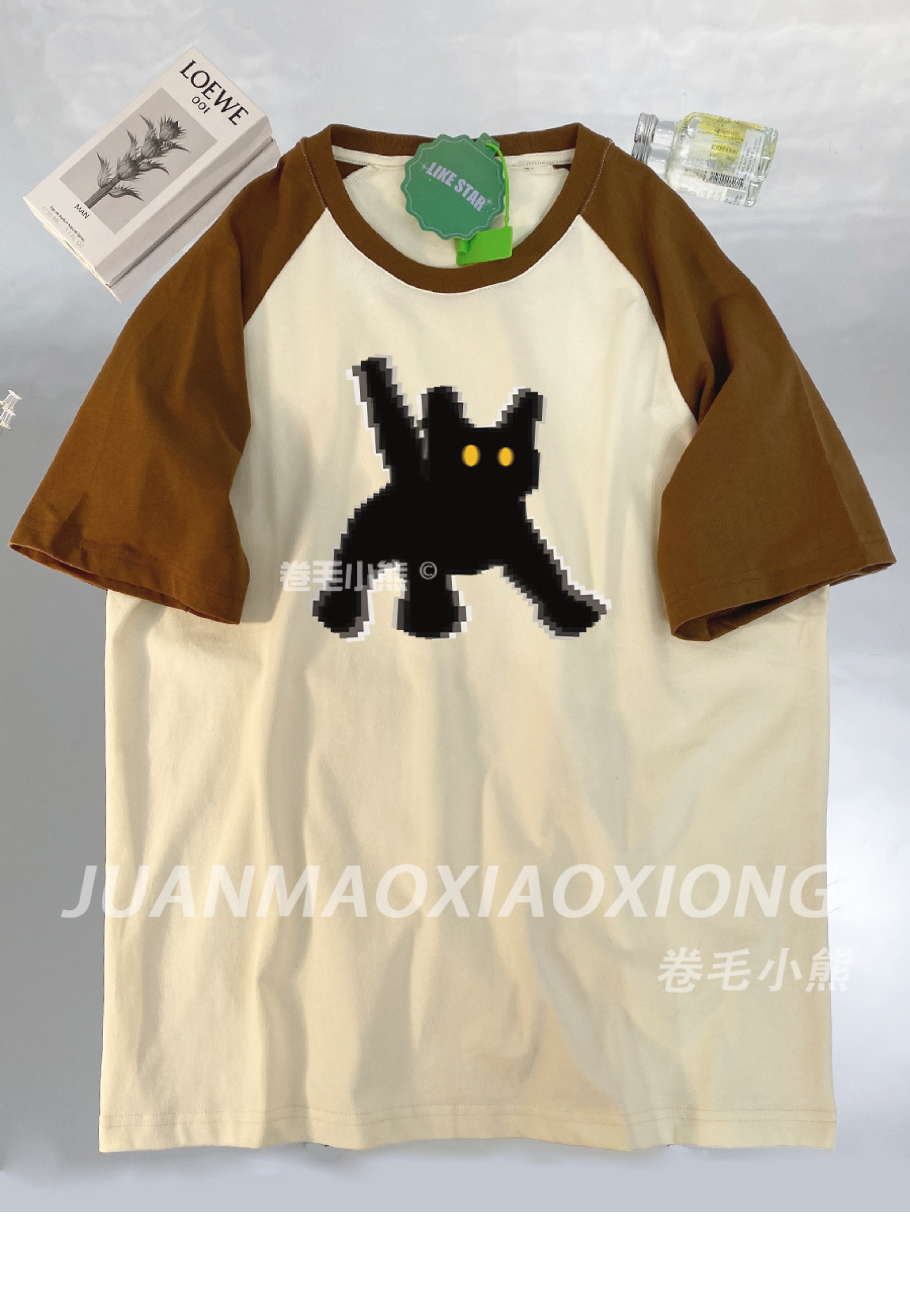 小黑mao 純棉插肩袖拼接撞色短袖T恤女夏季卡通印花寬鬆情侶上衣