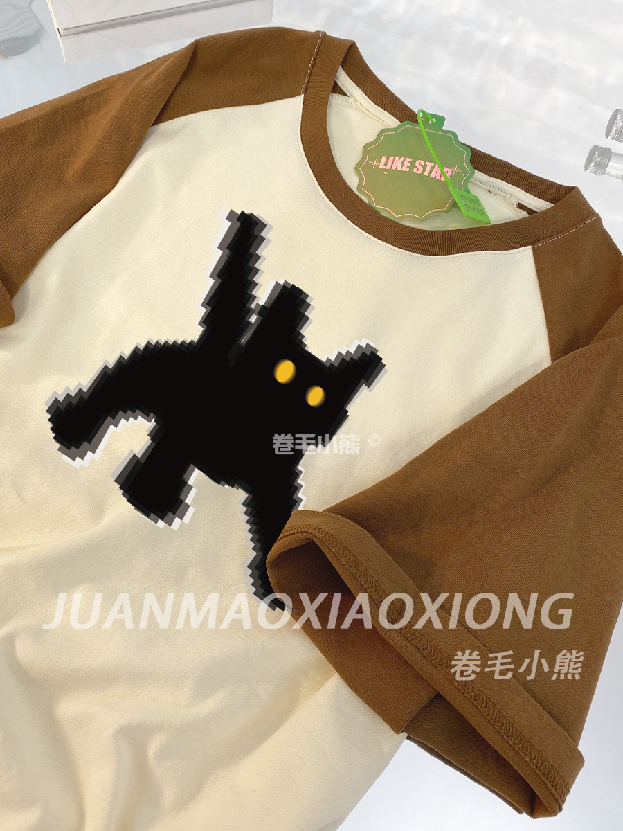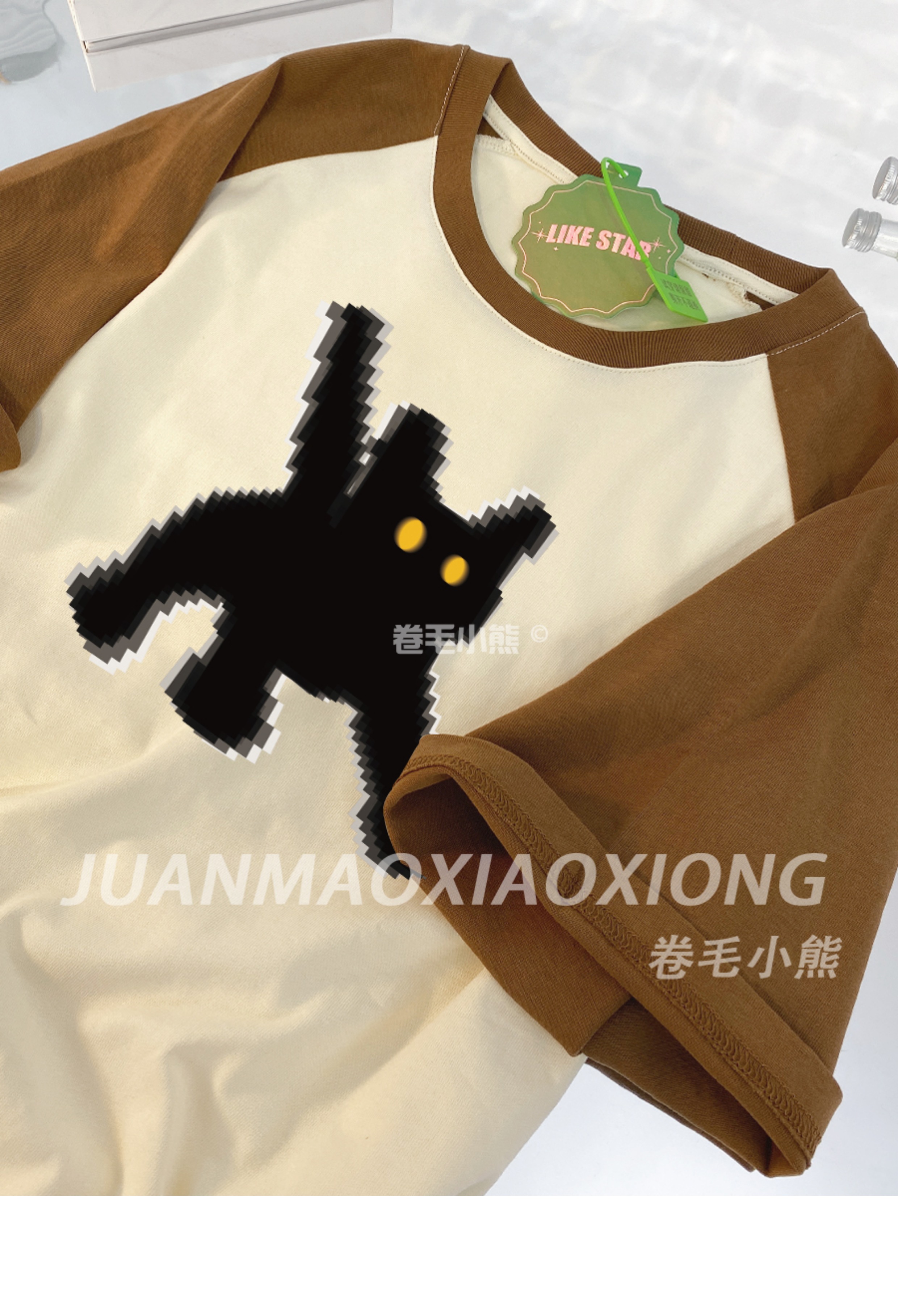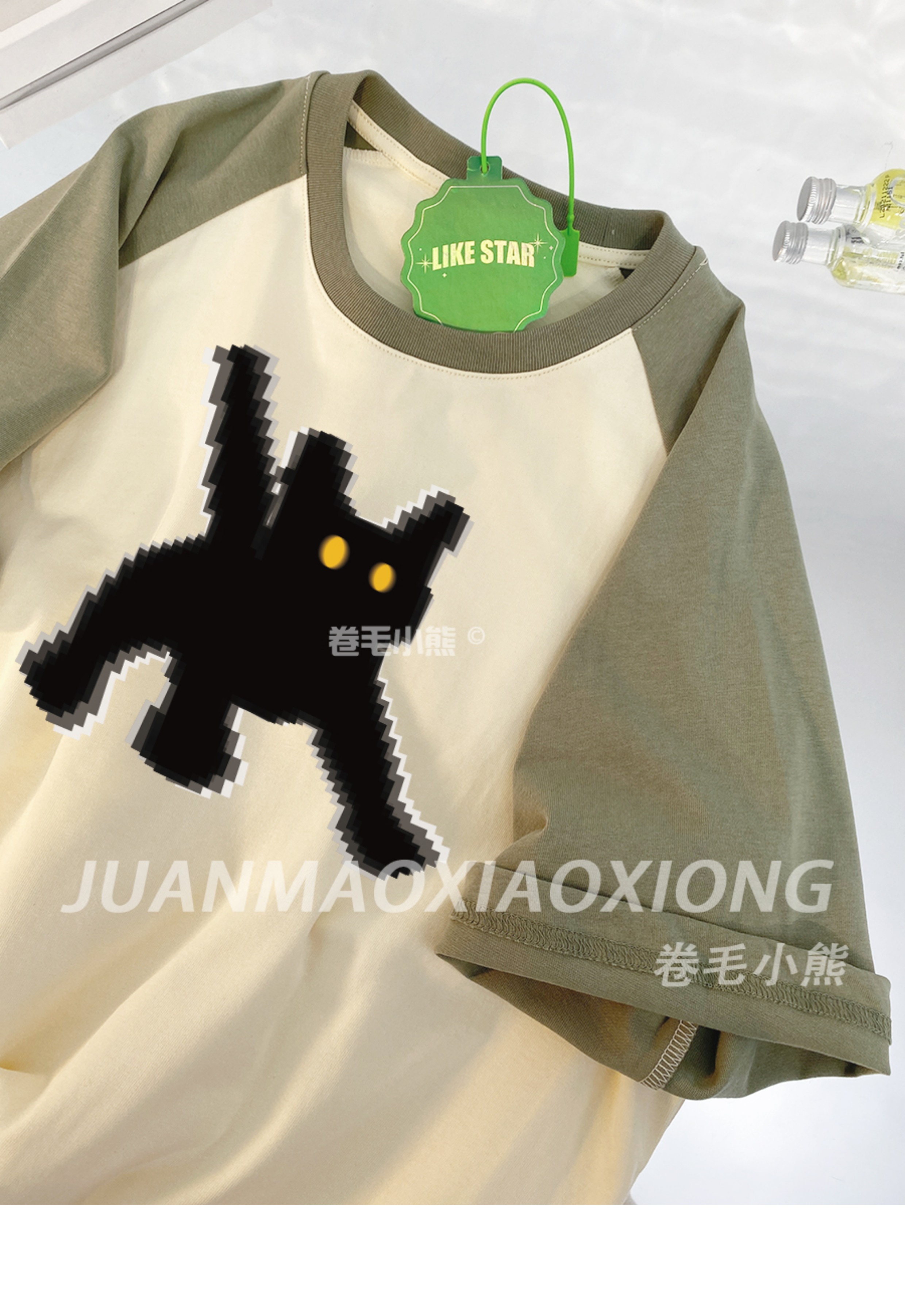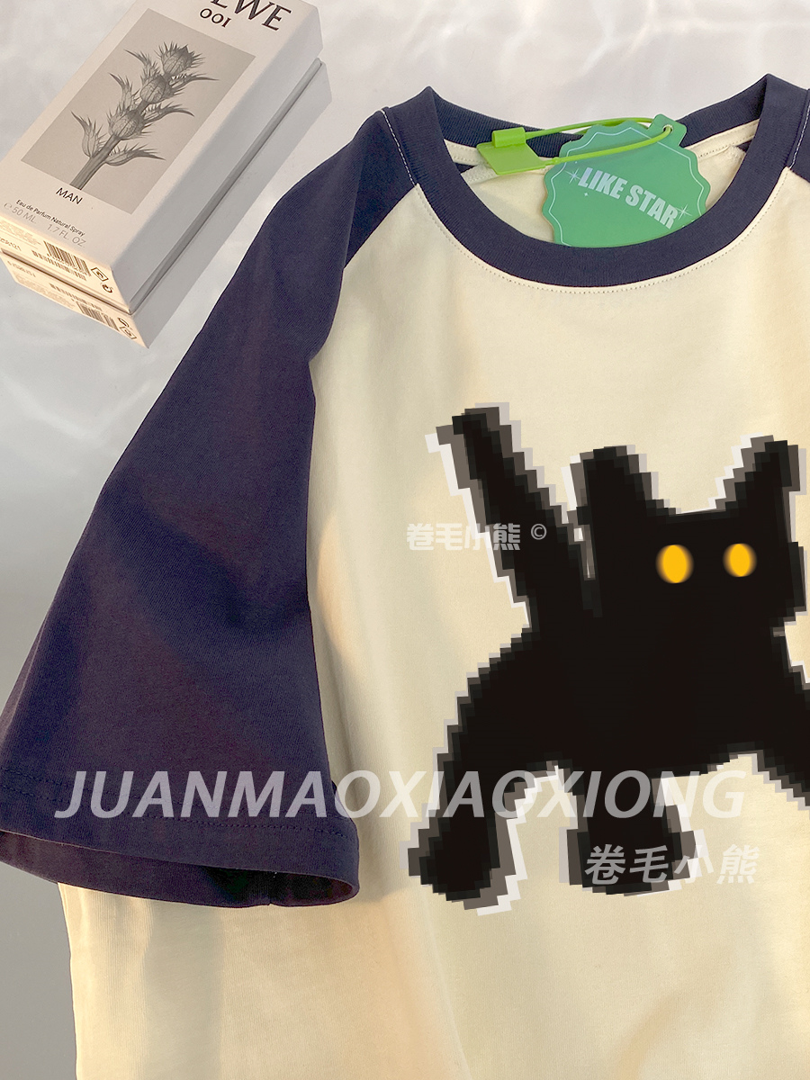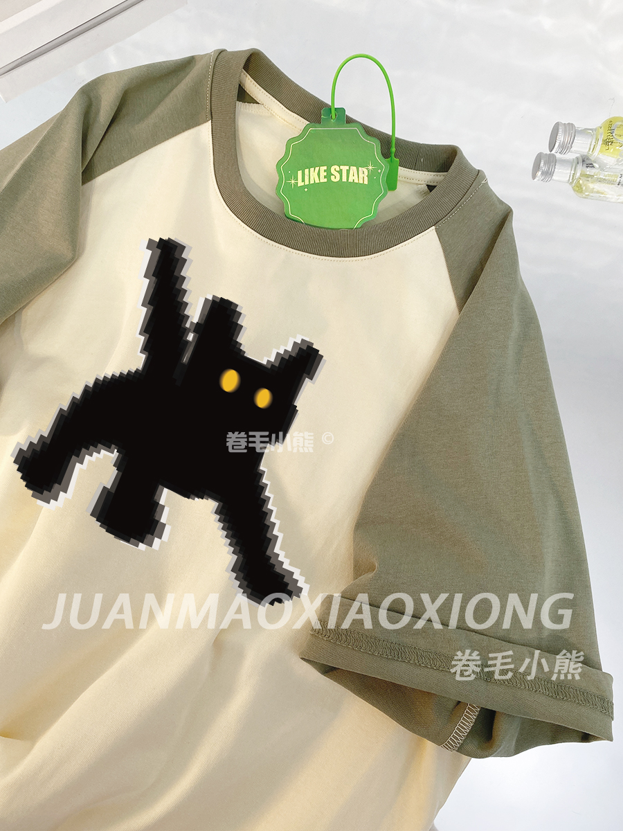 小黑mao 純棉插肩袖拼接撞色短袖T恤女夏季卡通印花寬鬆情侶上衣