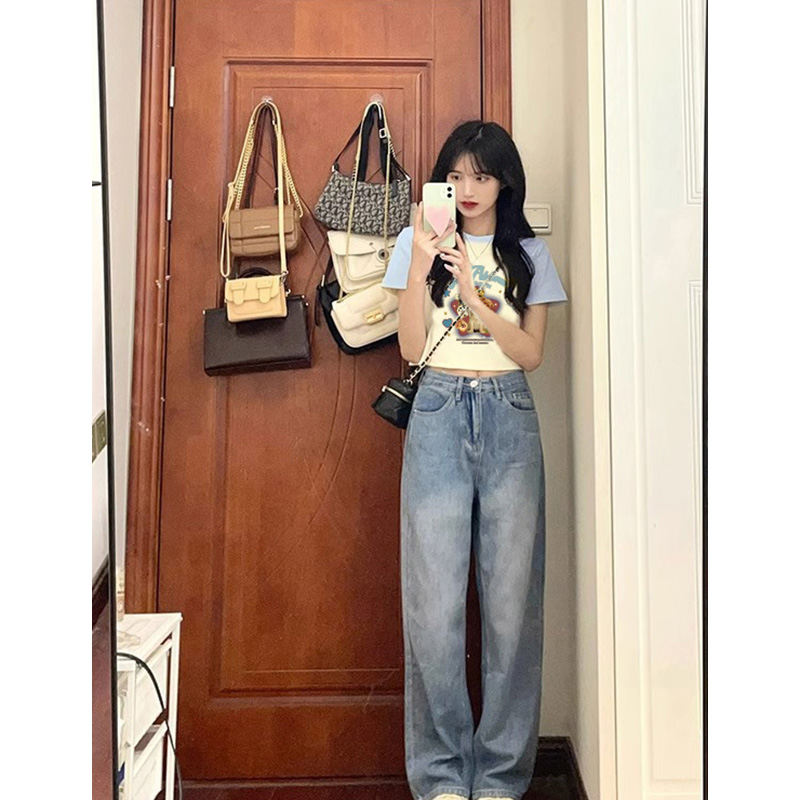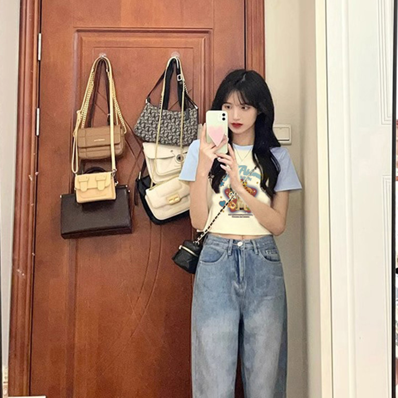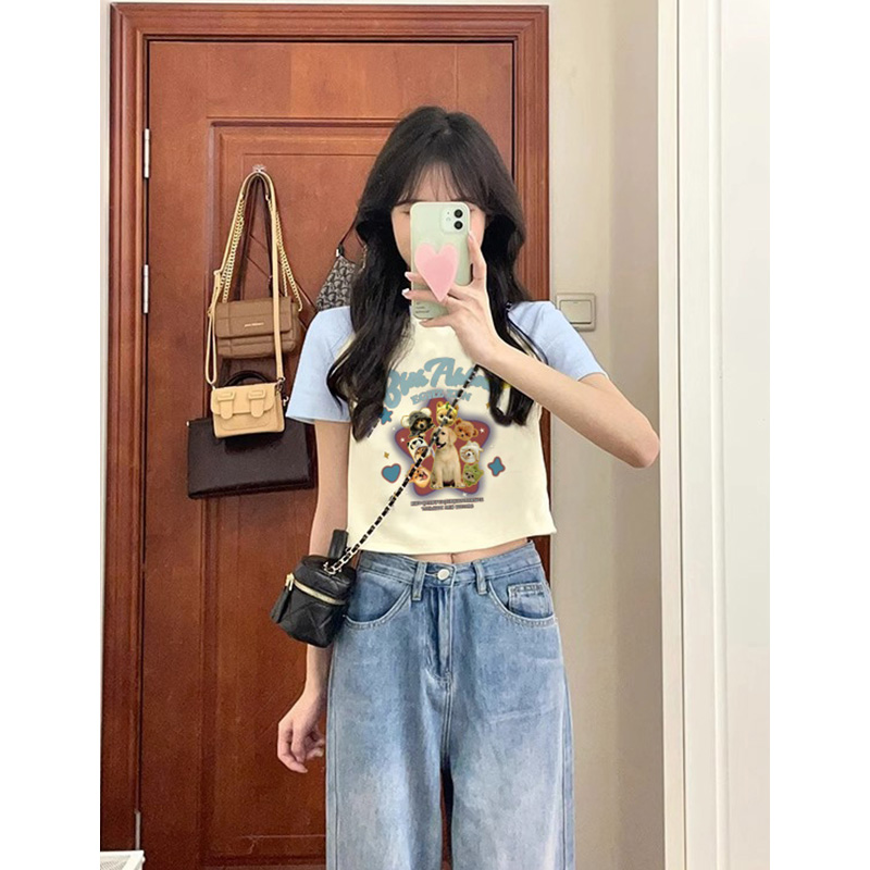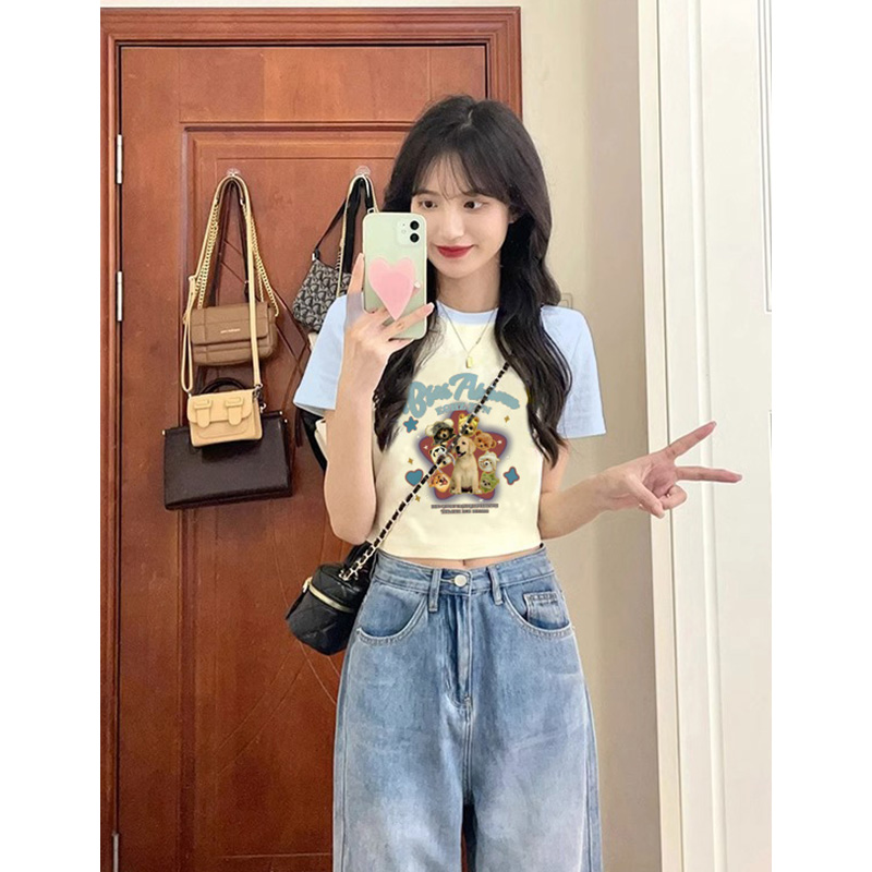 淺藍拼接插肩袖短袖女夏季辣妹短款正肩小眾別致減齡純欲風T恤ins