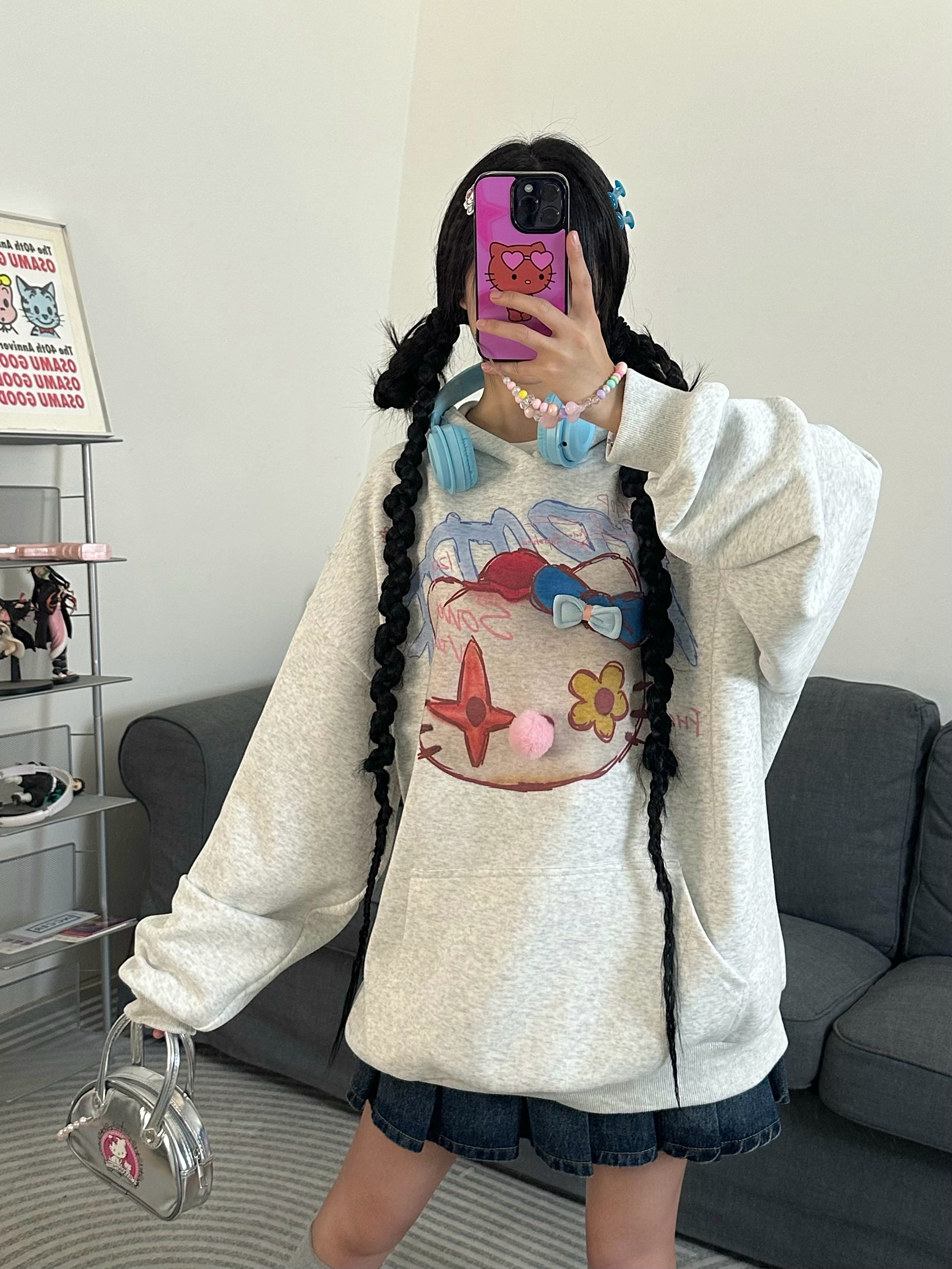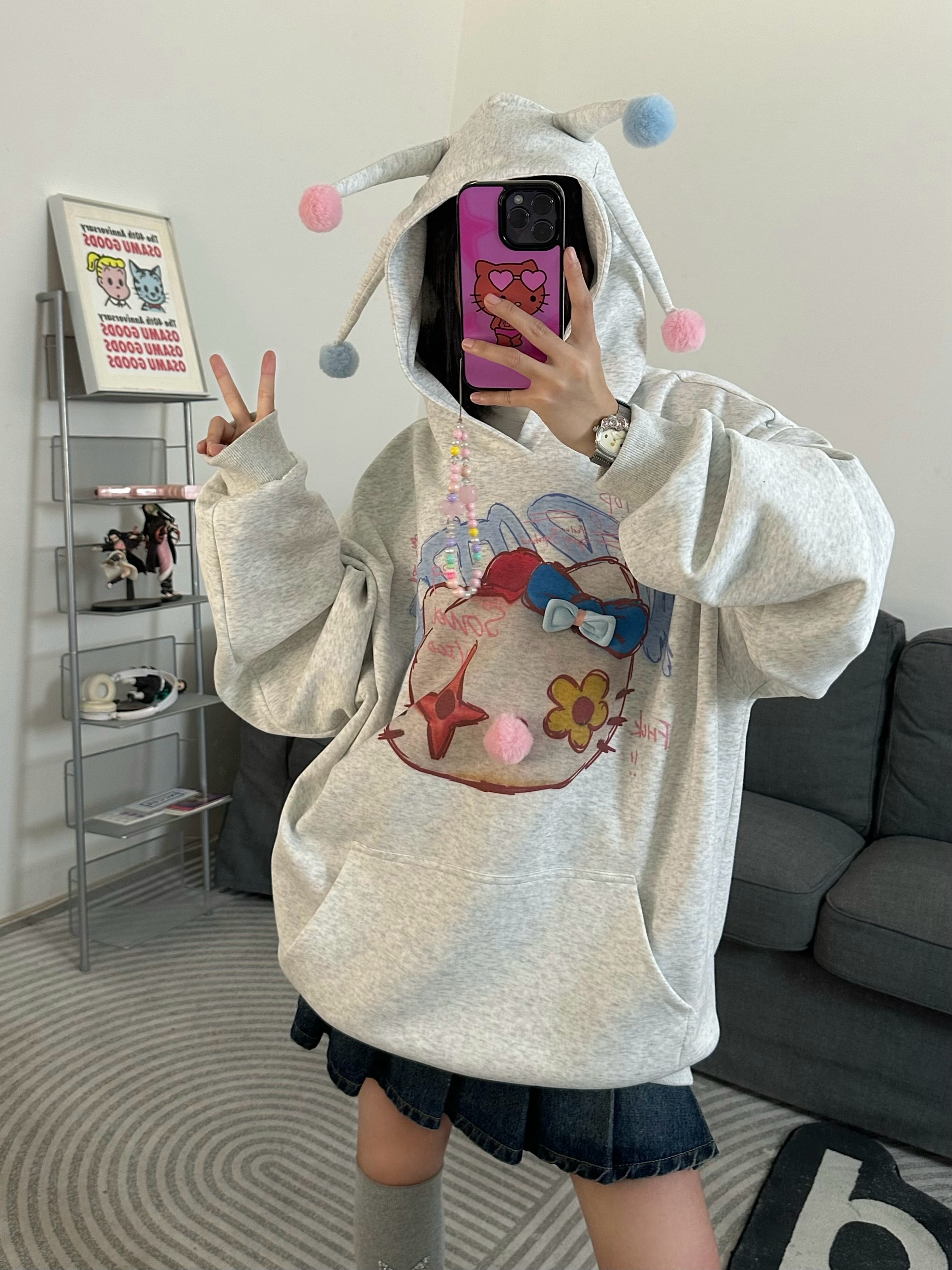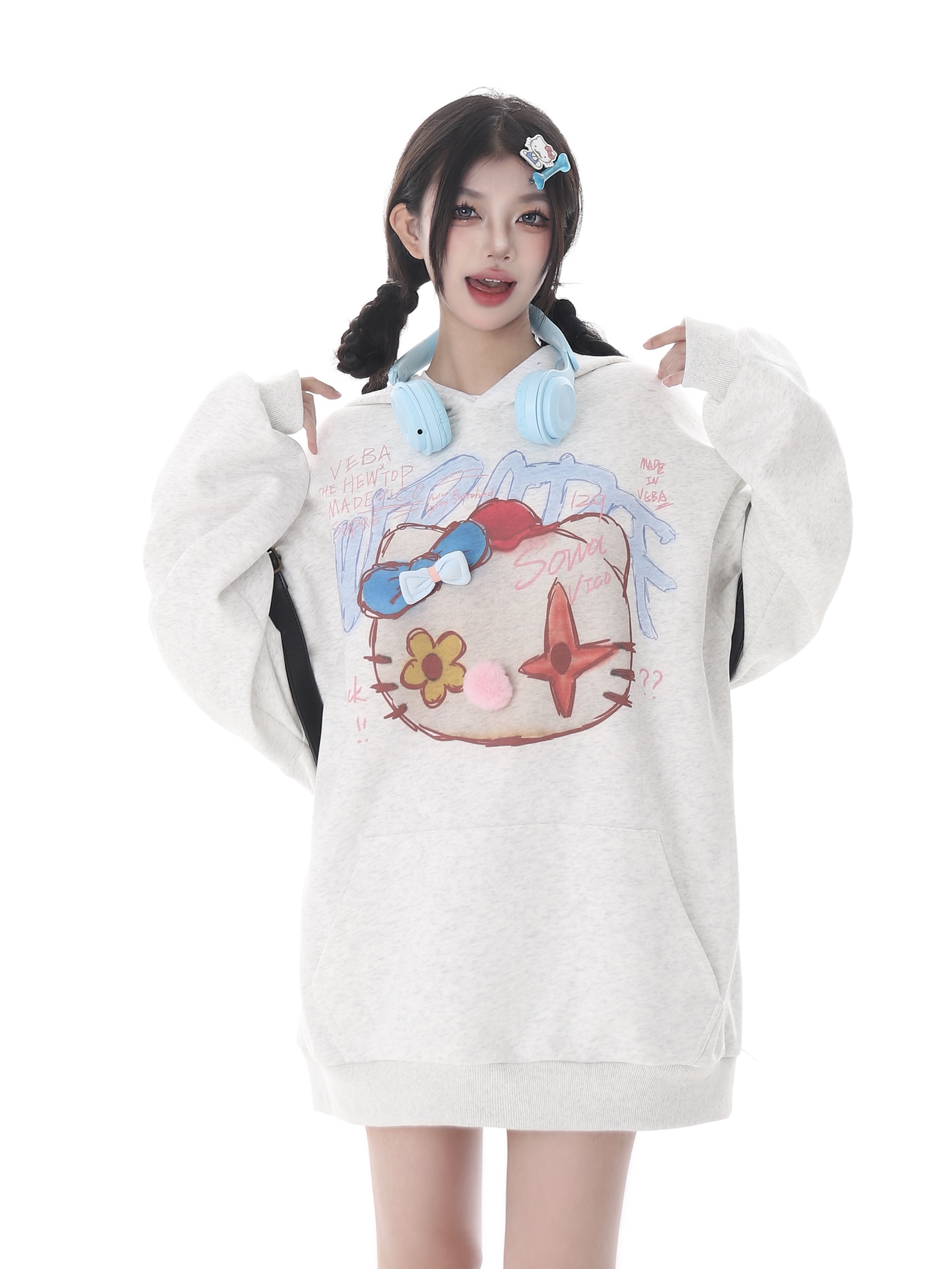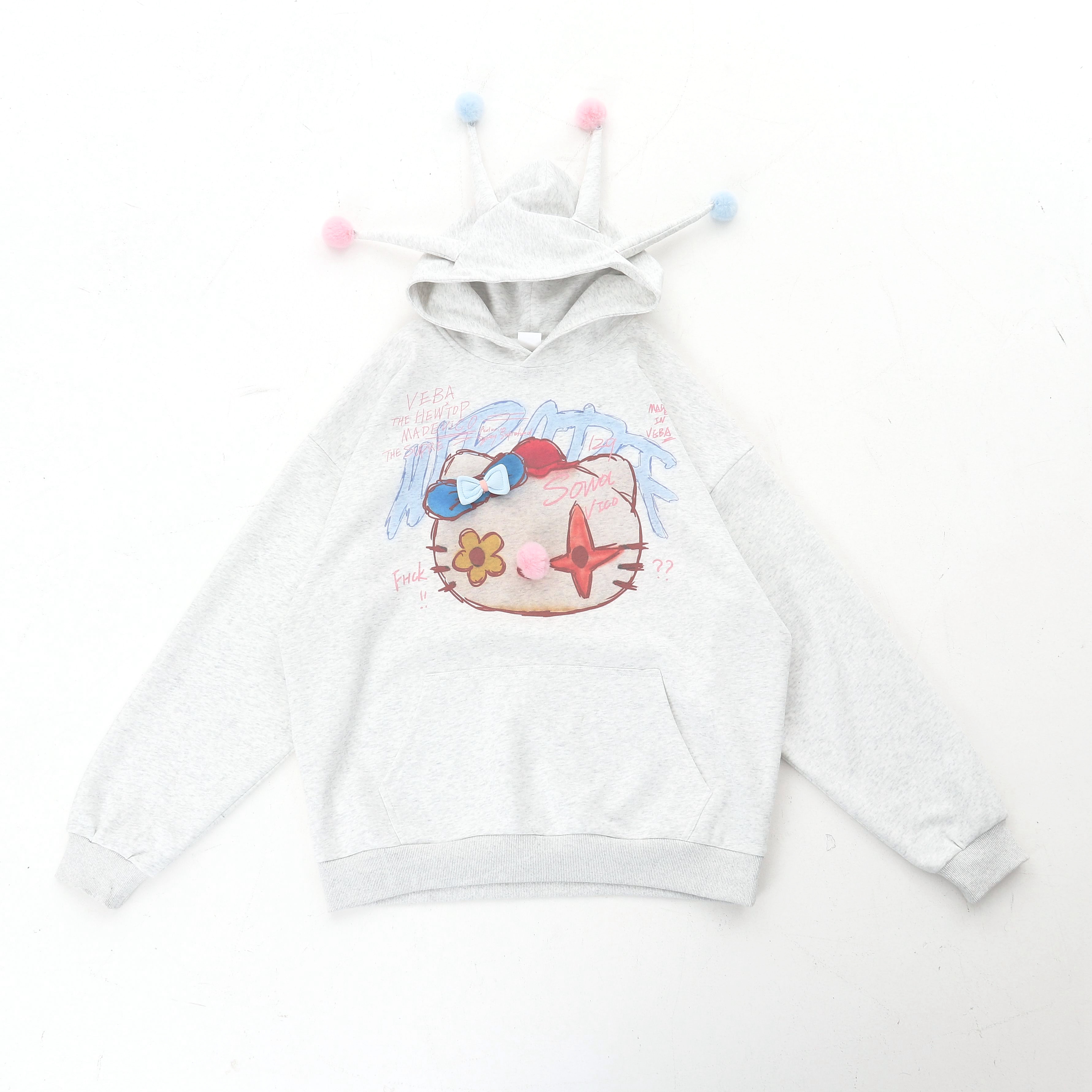 x不是好人 亞文化HelloKitty印花連帽運動衫女秋季復古慵懶通風球衫潮