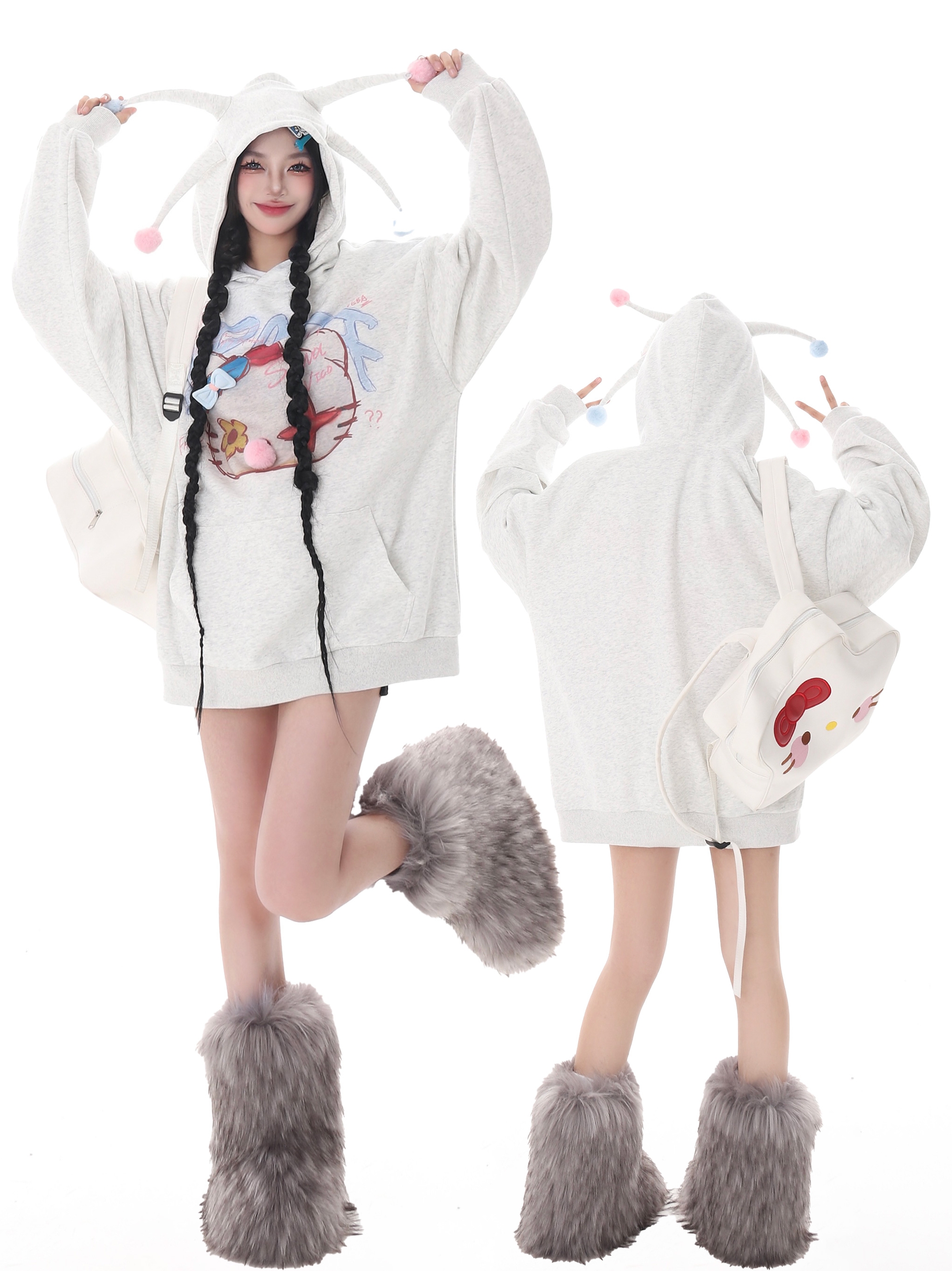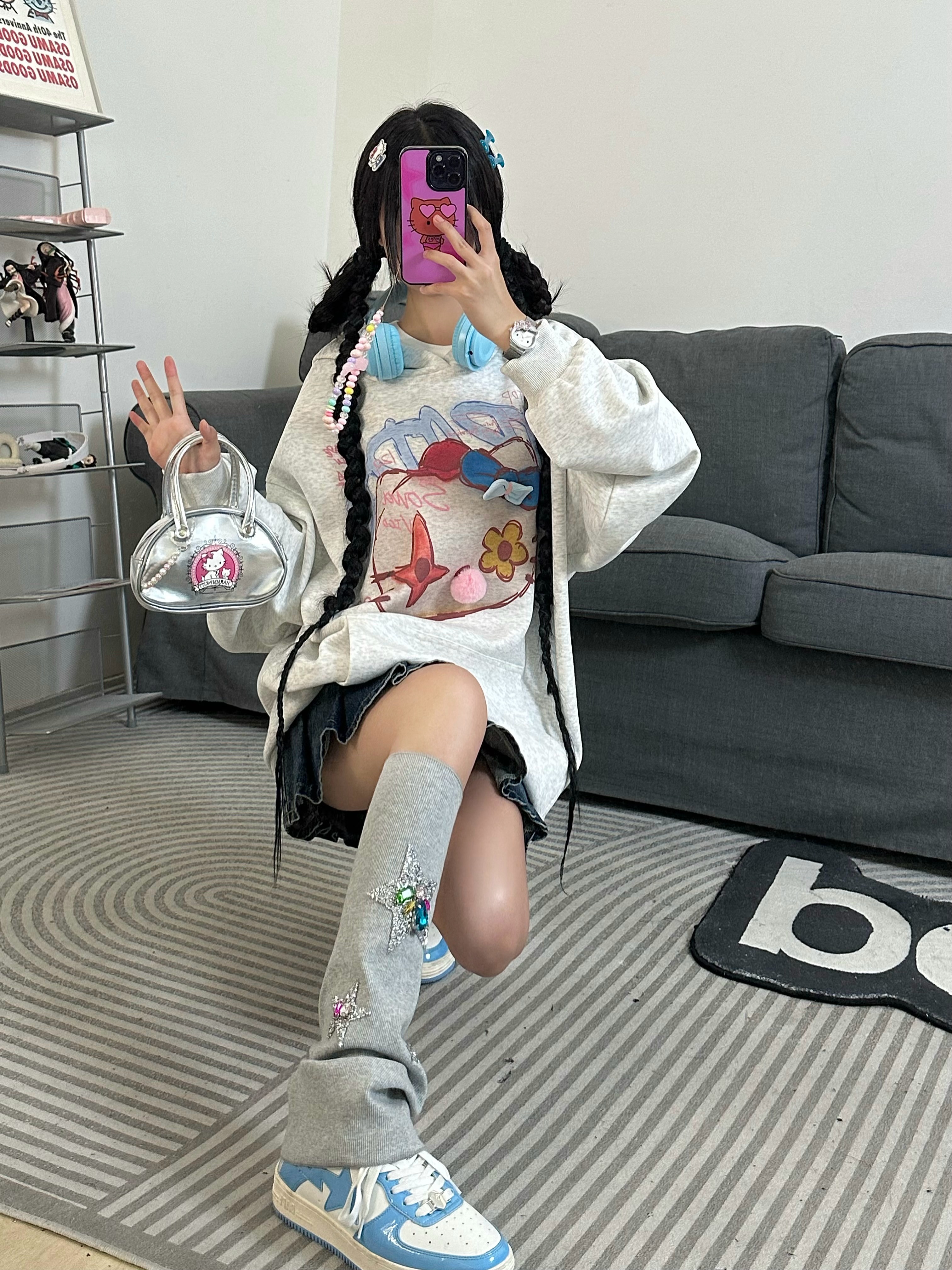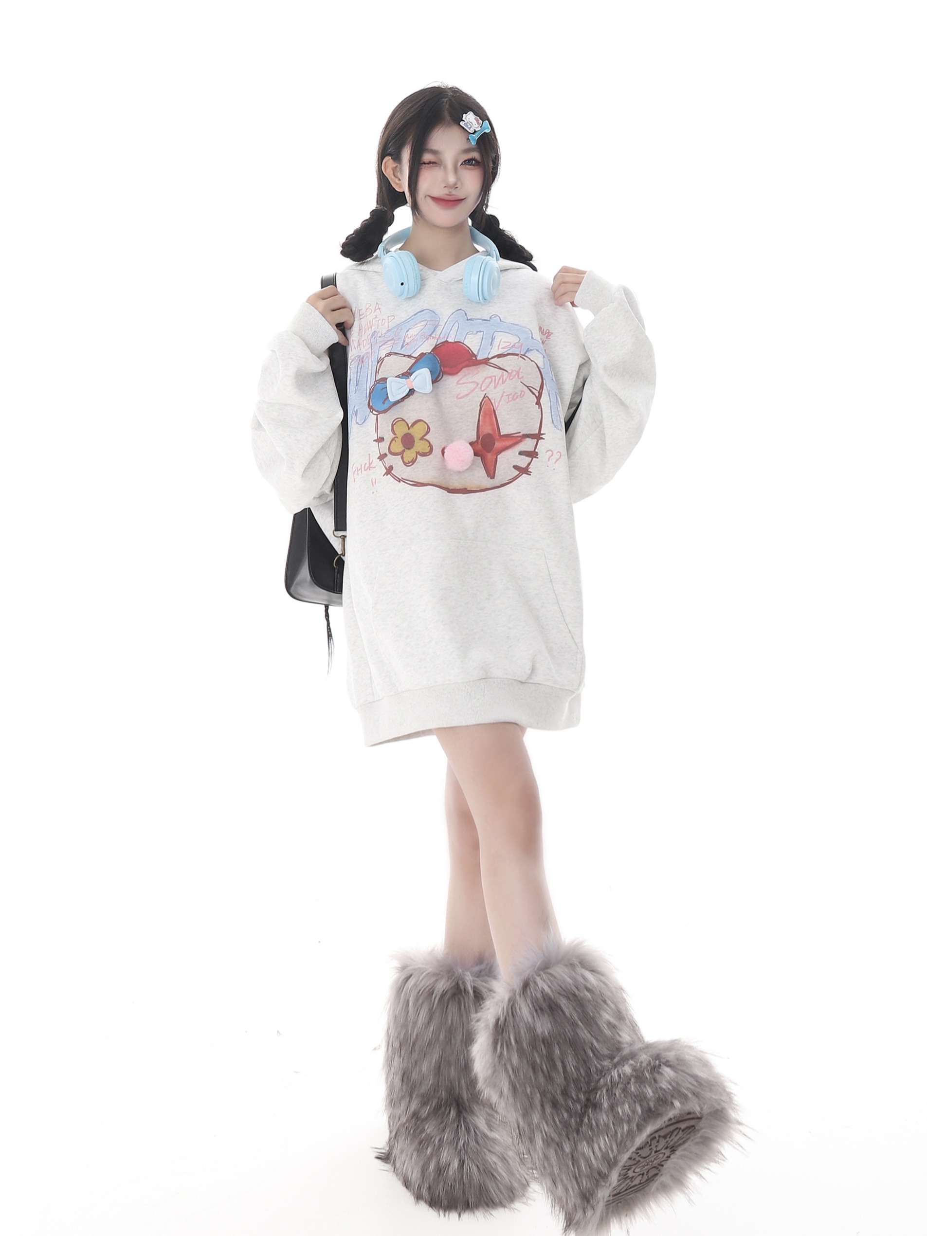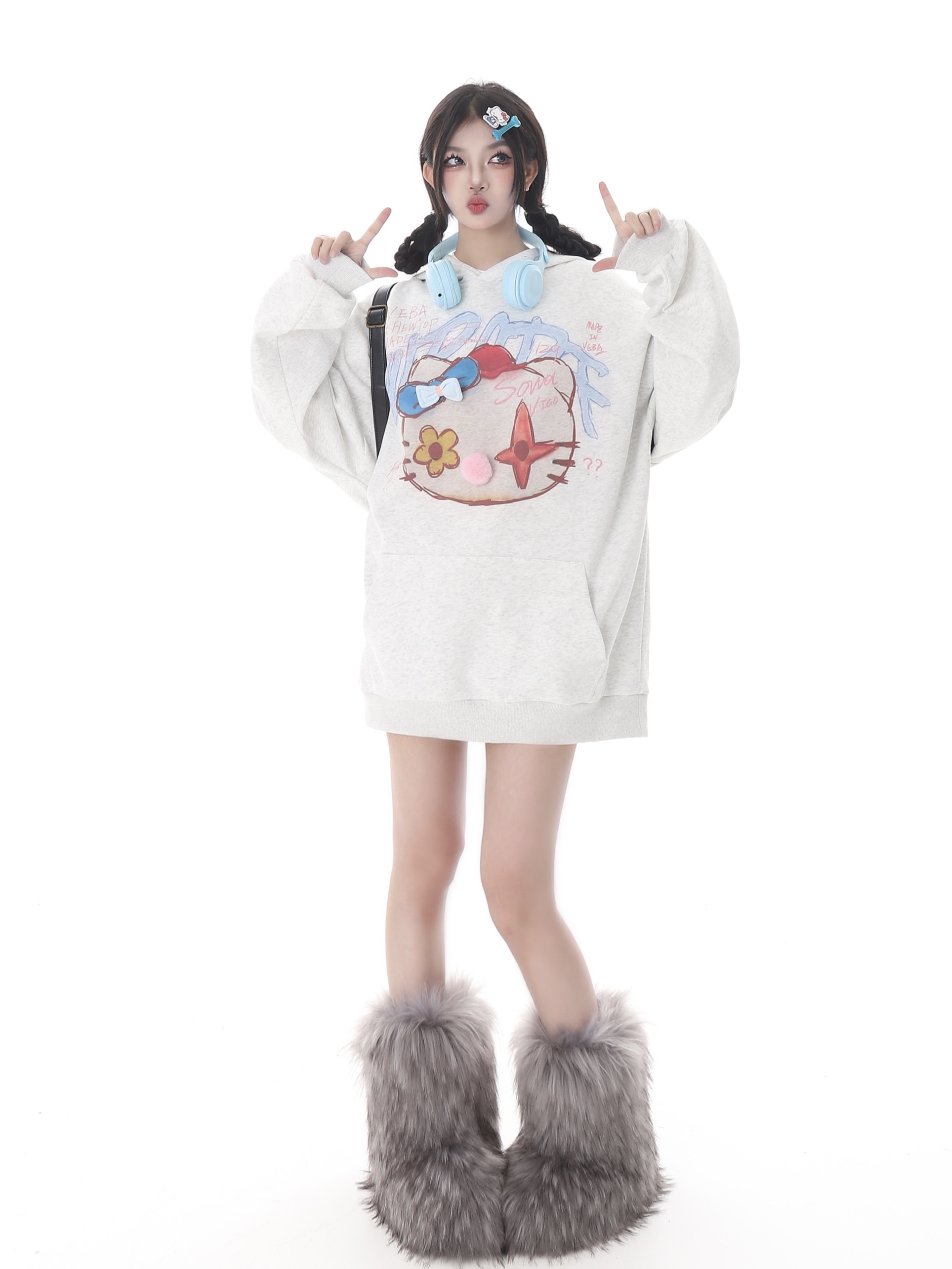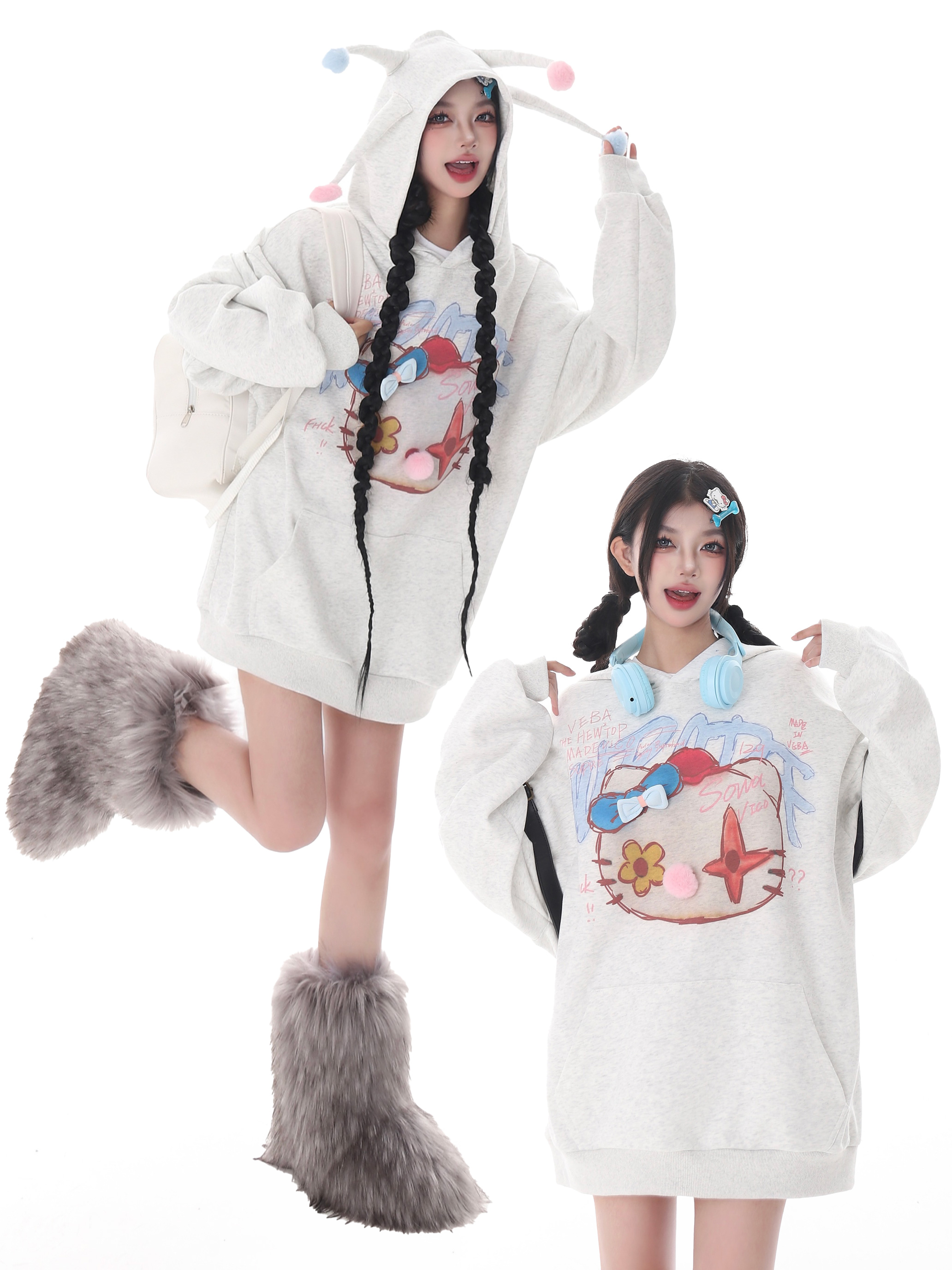 x不是好人 亞文化HelloKitty印花連帽運動衫女秋季復古慵懶通風球衫潮