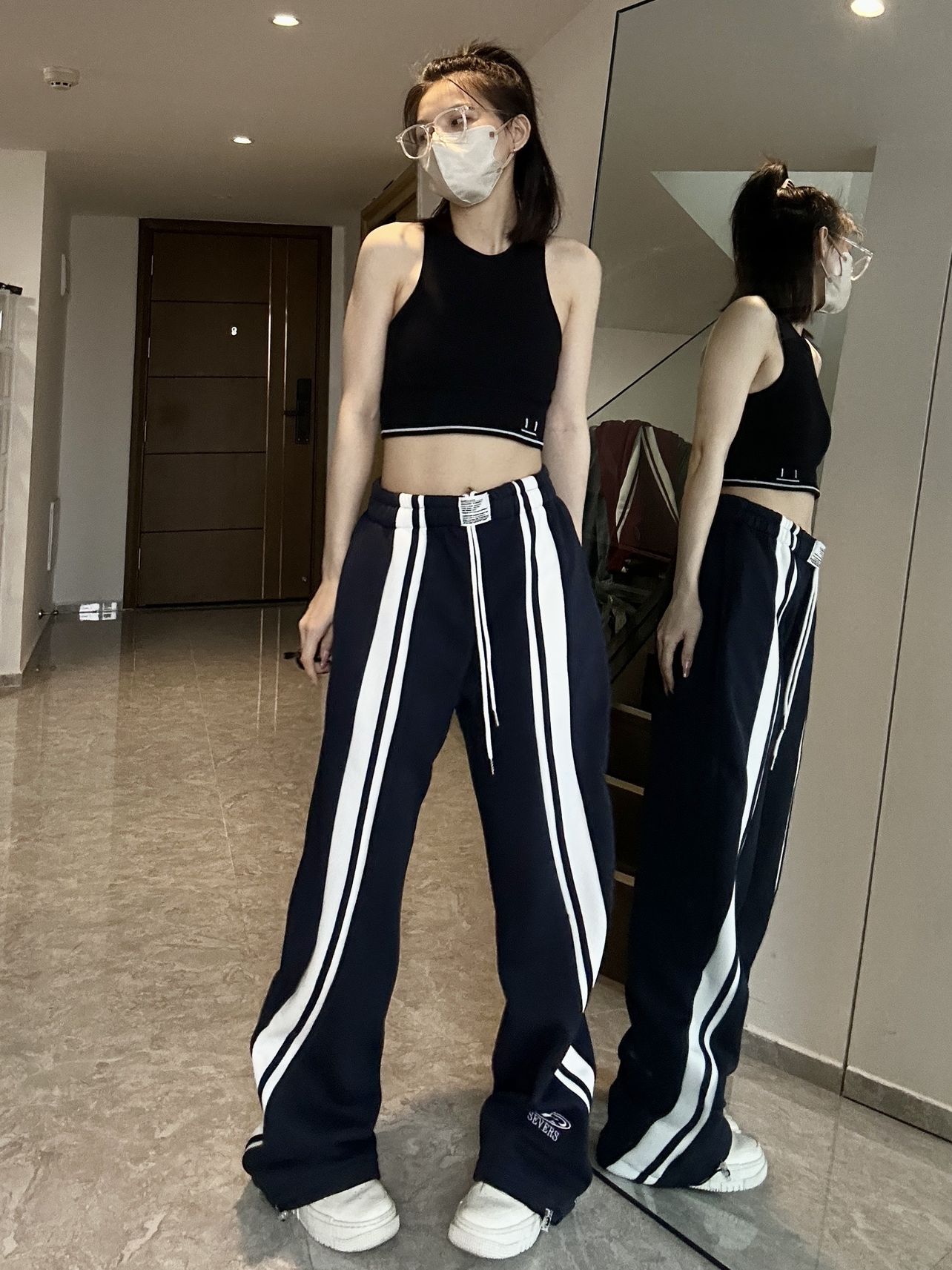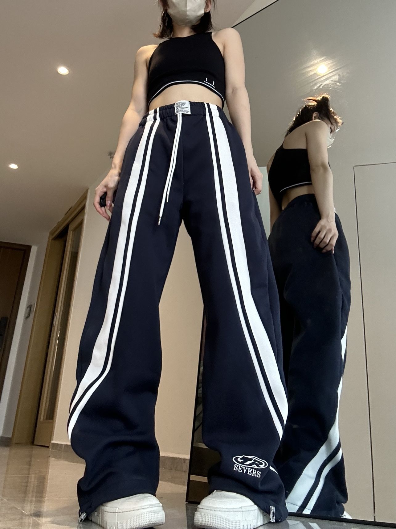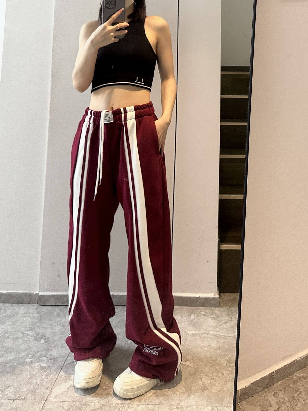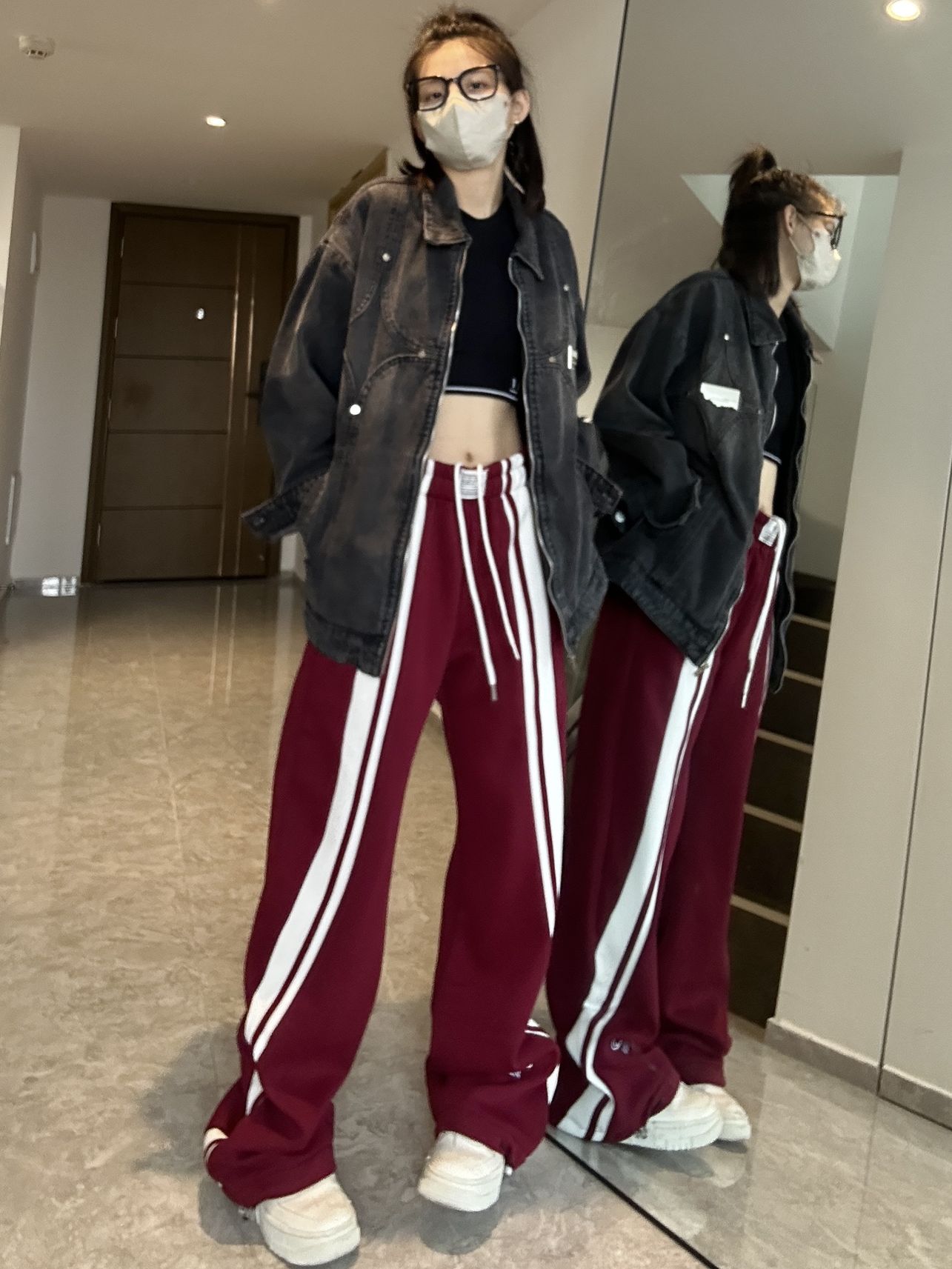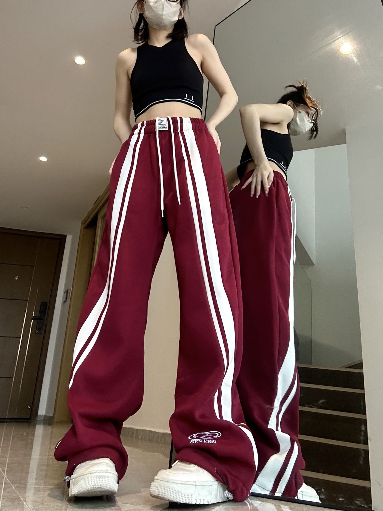 設計感美式抽繩運動厚棉褲女夏季薄款潮牌紅色闊腿直筒垂感休閒褲子
