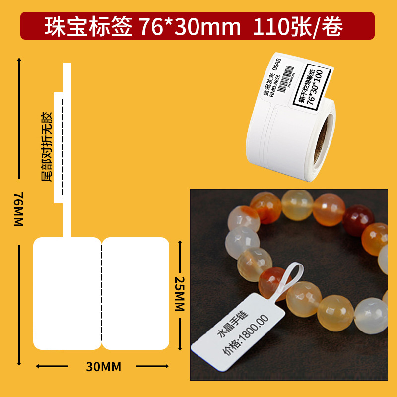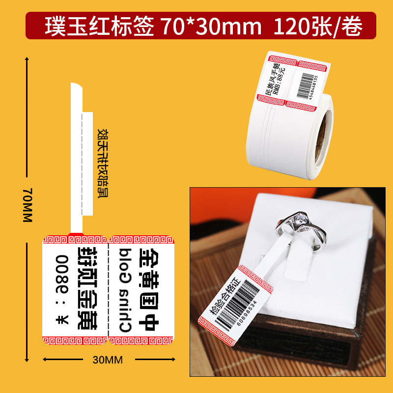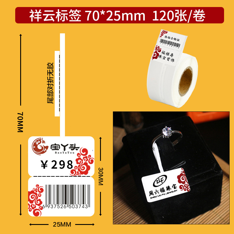 颜色 祥云标签70*25【100张/卷】,璞玉红标签70*30【120张/卷】,珠宝标签76*30【110张/卷】,珠宝标签70*25【120张/卷】,珠宝标签(带孔)50X15【400张/卷】,珠宝标签50X26【280张/卷】,珠宝F型透明胶套【侧开口】500个,珠宝T型透明胶套【上开口】500个,线缆标签纸【25*78】红色/l蓝色/绿色,烟草标签纸【50*30-230】,烟草标签纸【50*30-220】,珠宝标签各种印刷定制【专拍】
