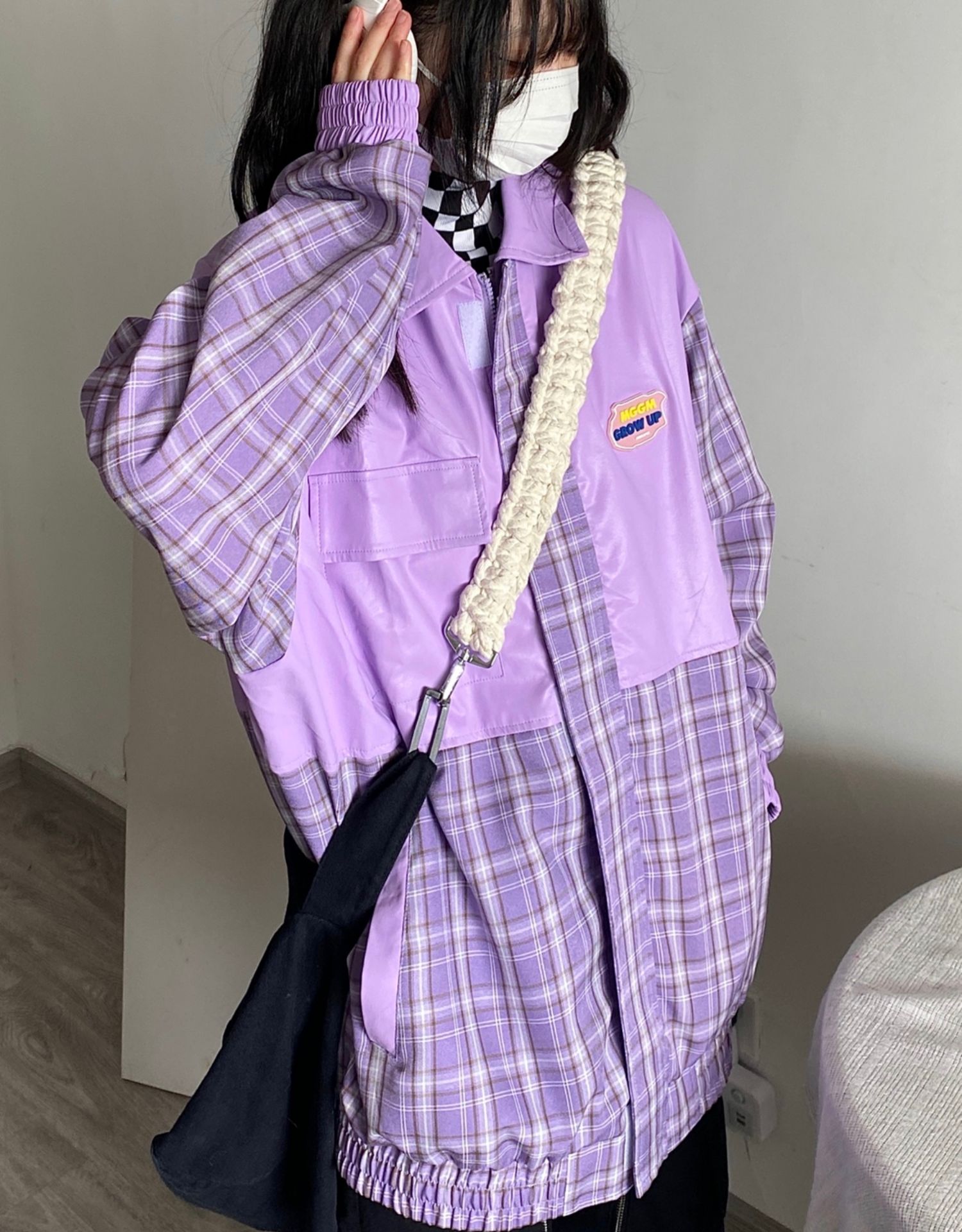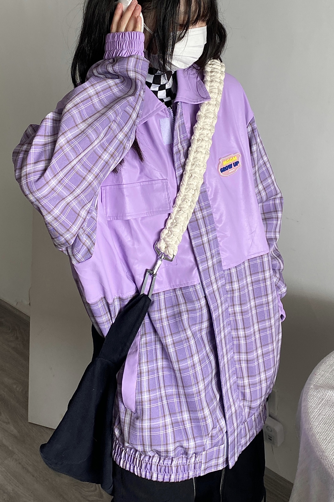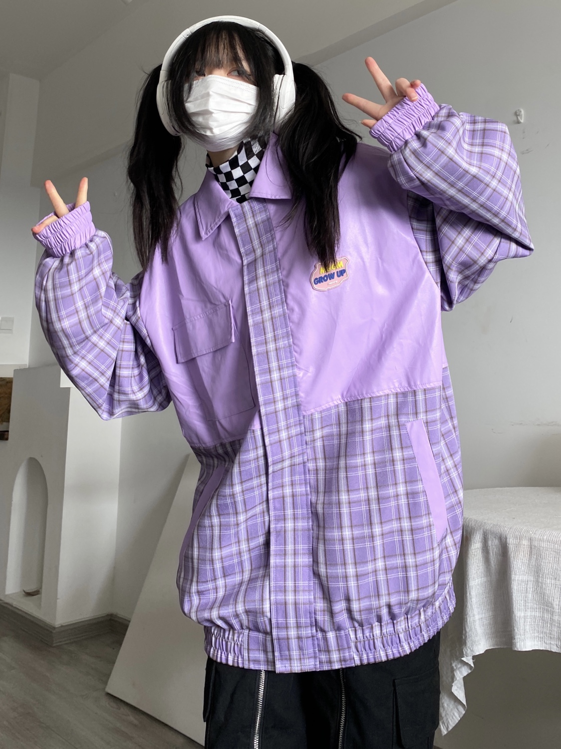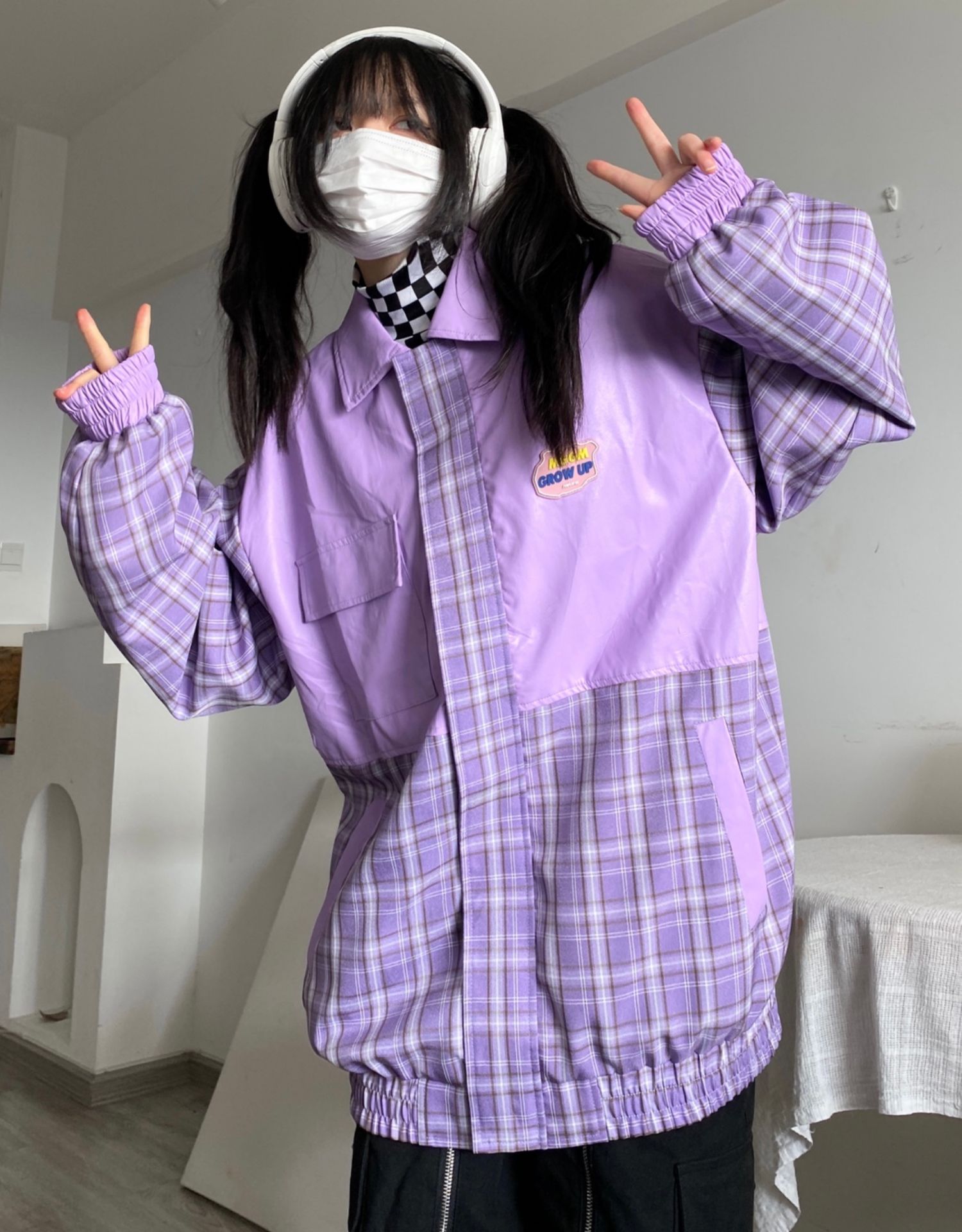 Takeoff咖哩人2022春格子拼接皮衣外套寬鬆男女潮夾克上衣百搭ins
