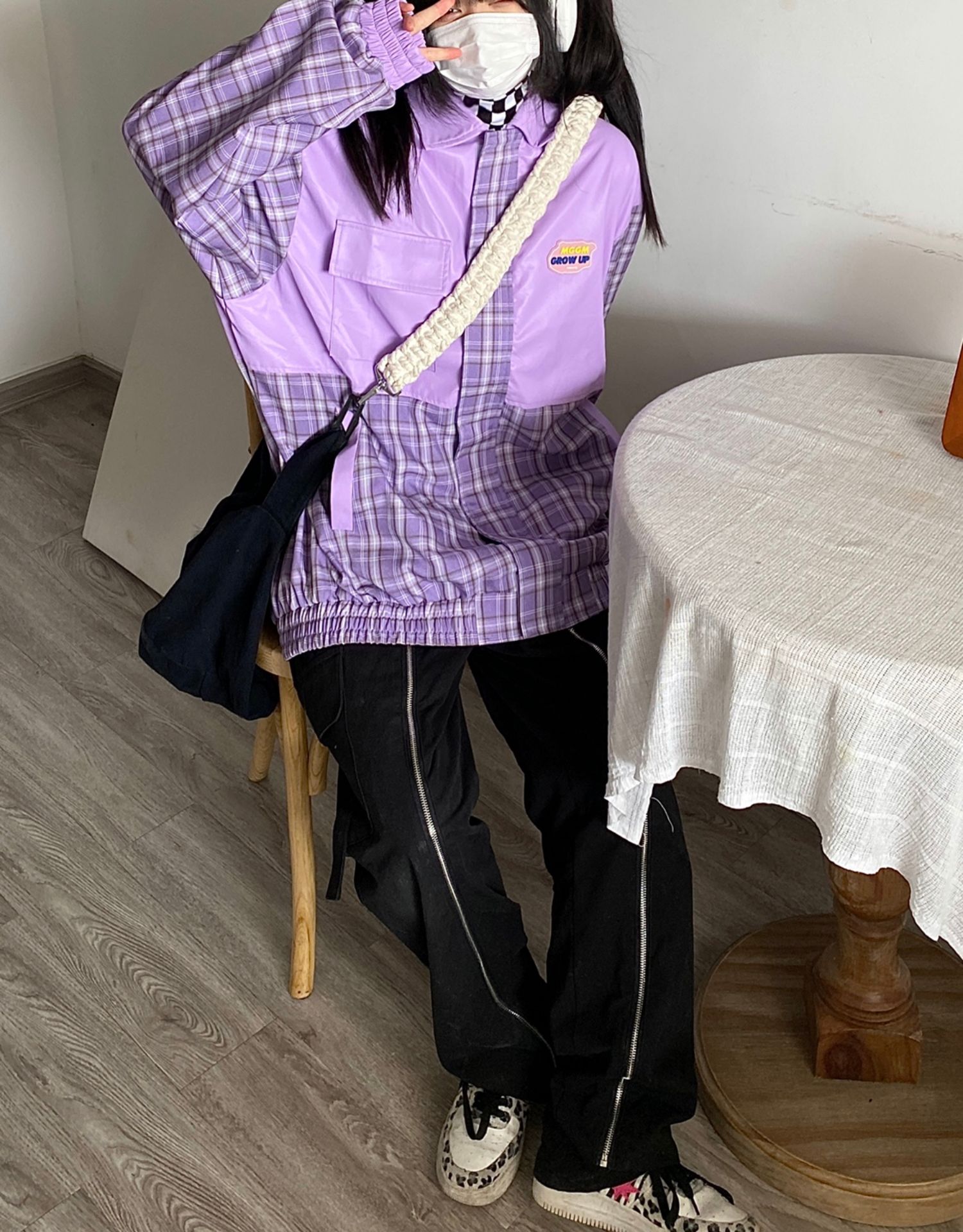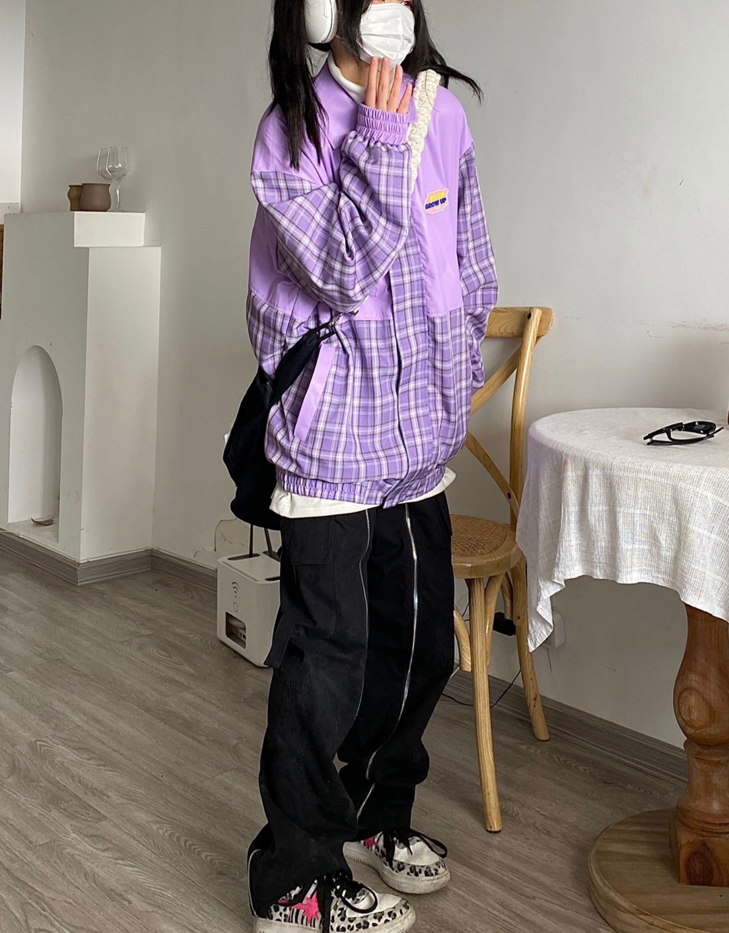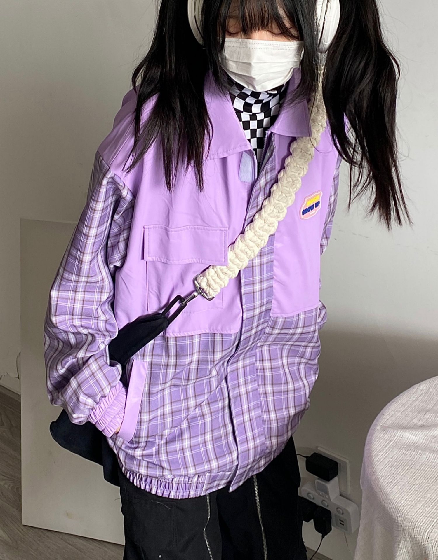 Takeoff咖哩人2022春格子拼接皮衣外套寬鬆男女潮夾克上衣百搭ins