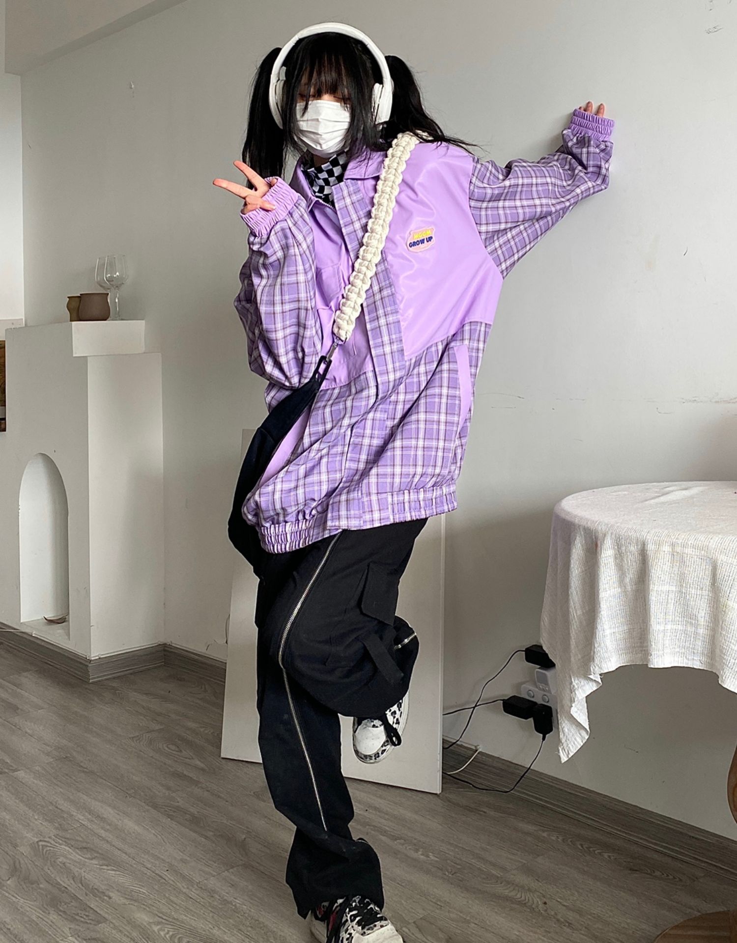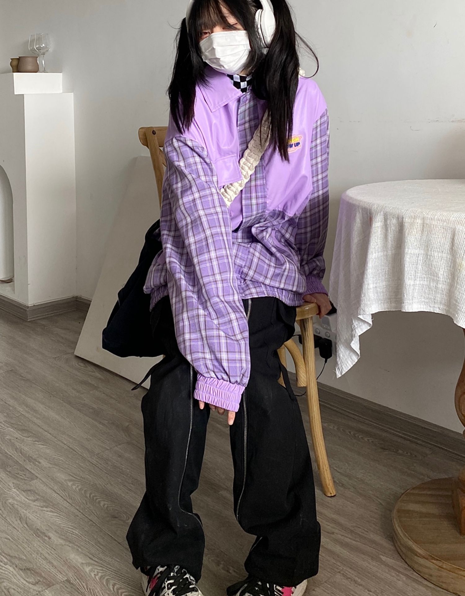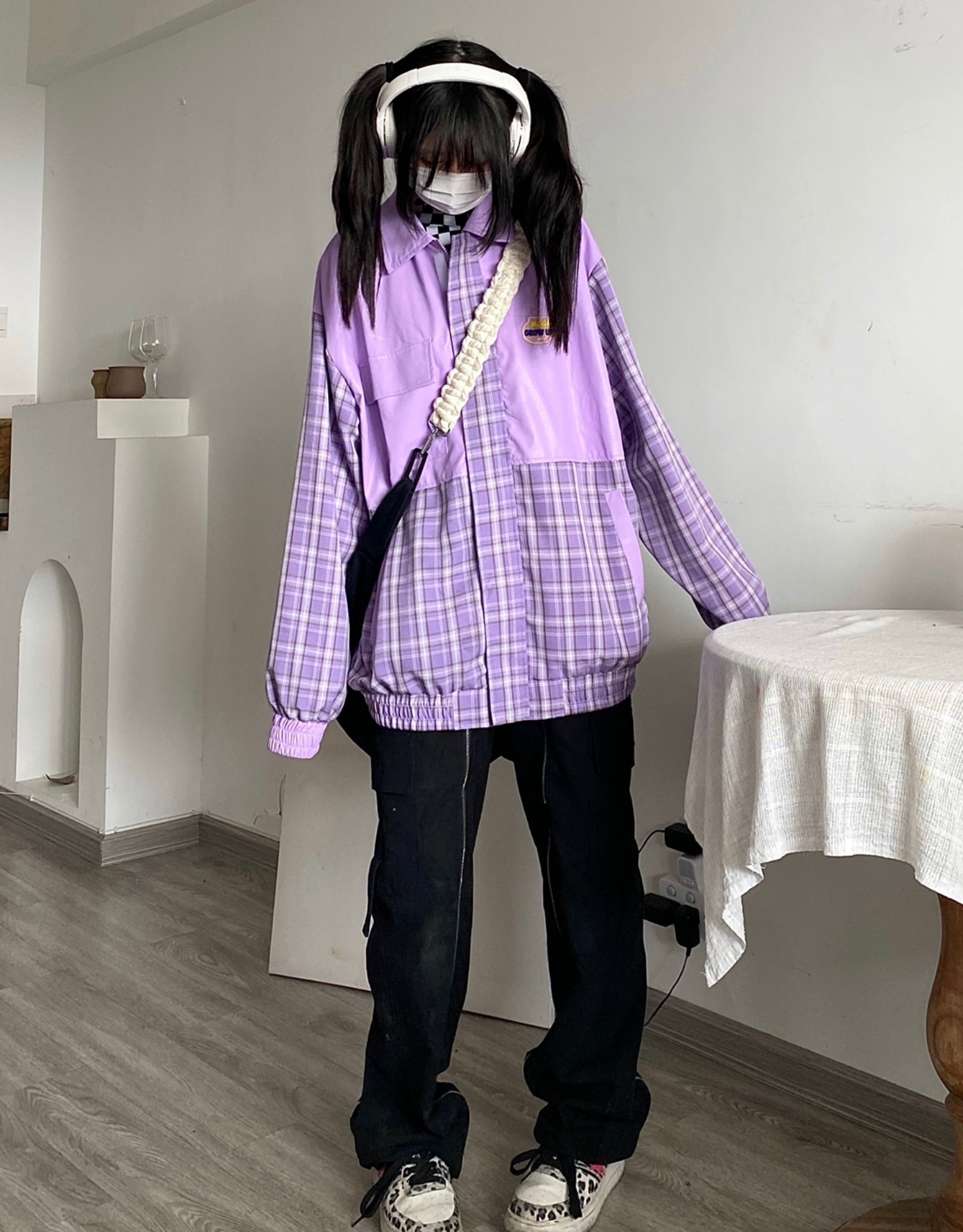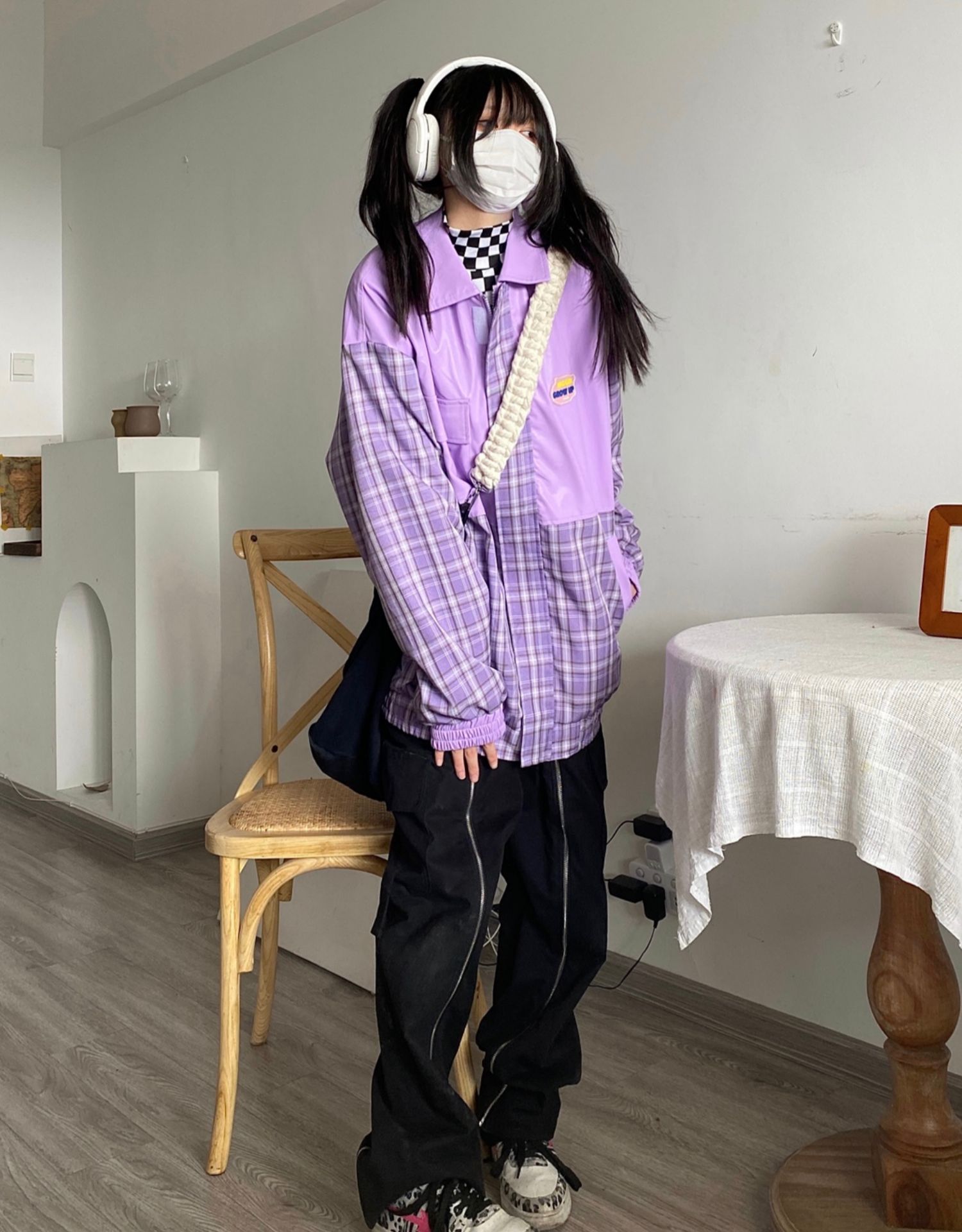 Takeoff咖哩人2022春格子拼接皮衣外套寬鬆男女潮夾克上衣百搭ins