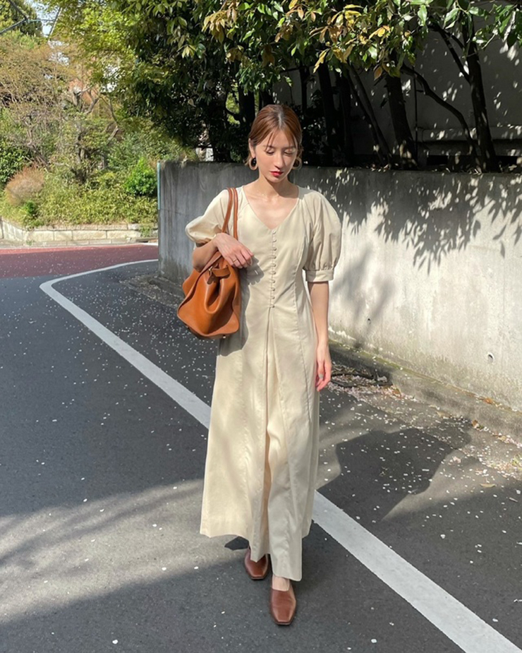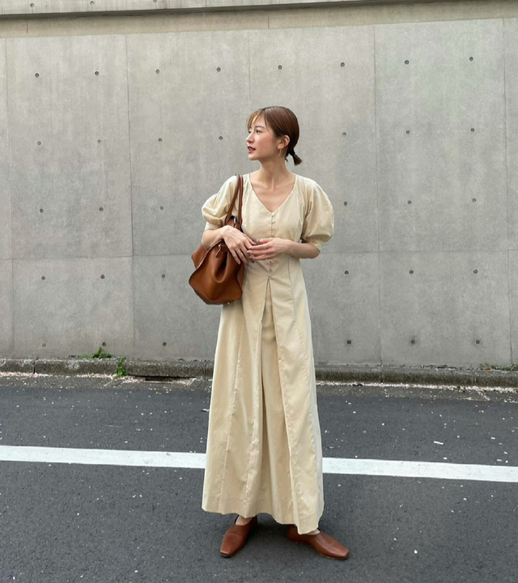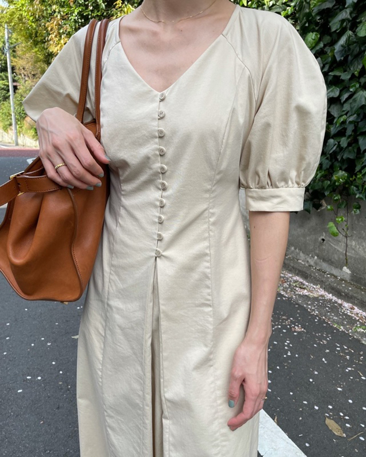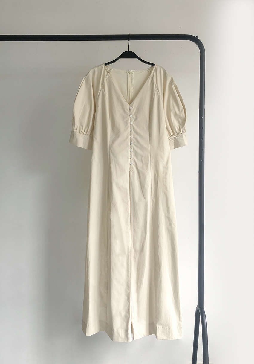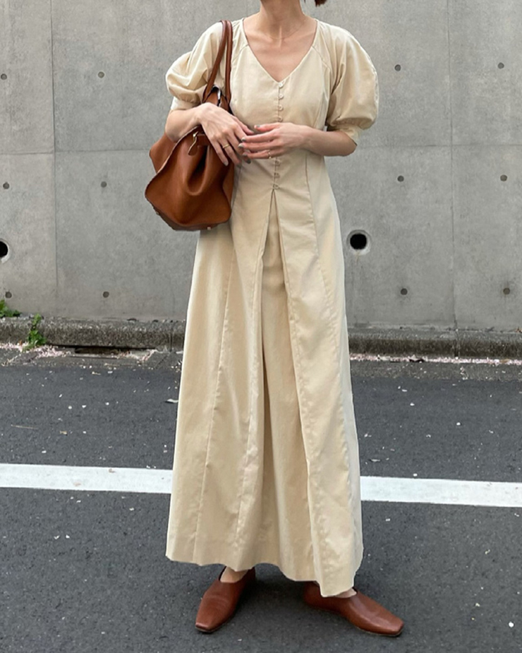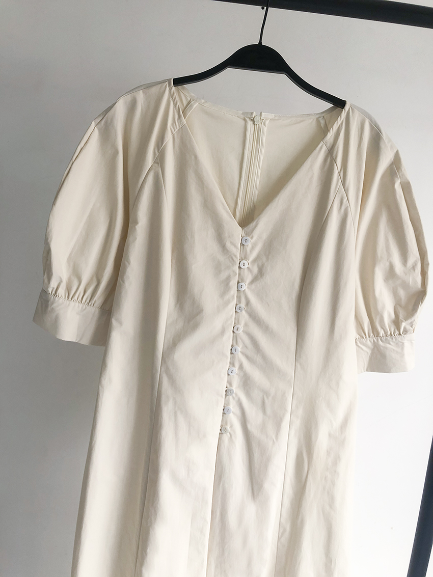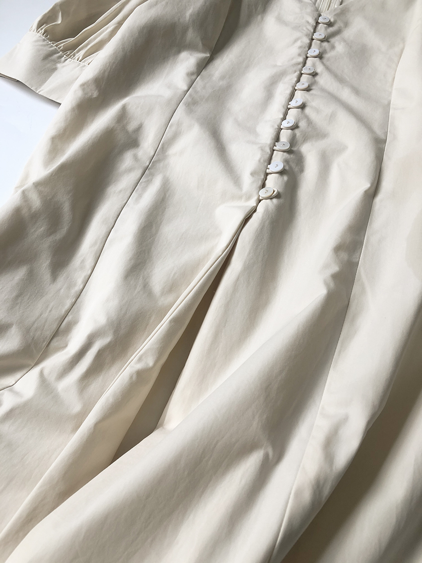 鬆本惠奈設計師款宮廷復古V領泡泡袖排扣高腰開叉洋裝米色長裙