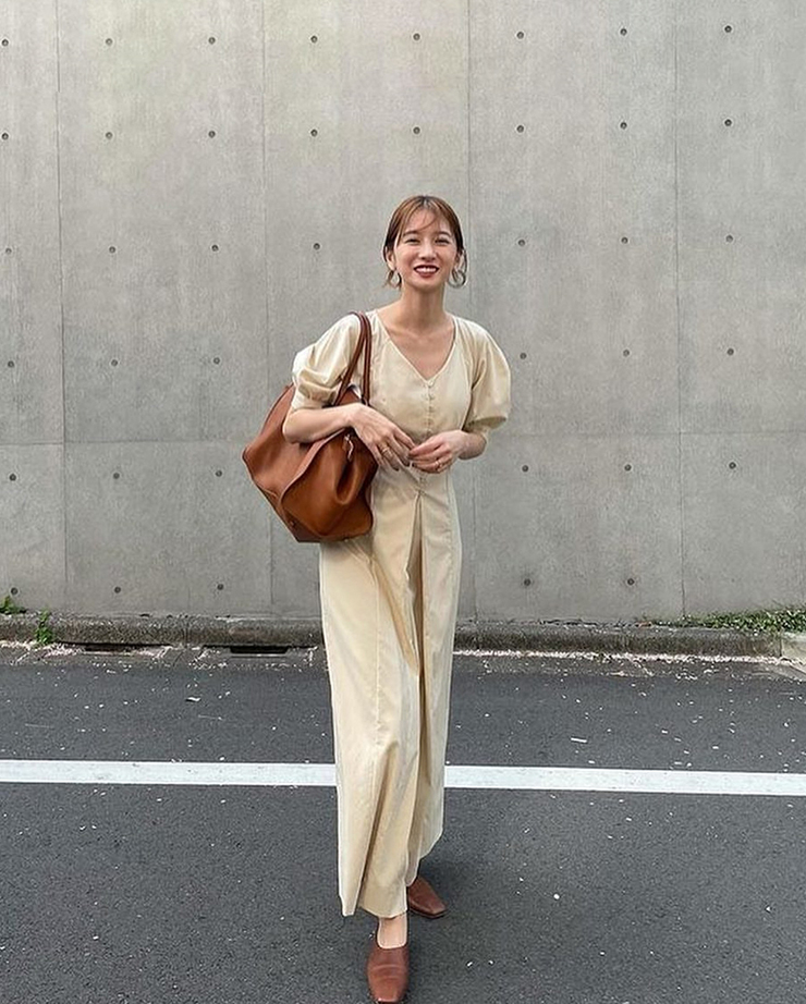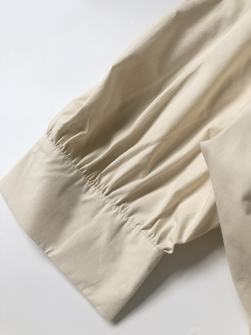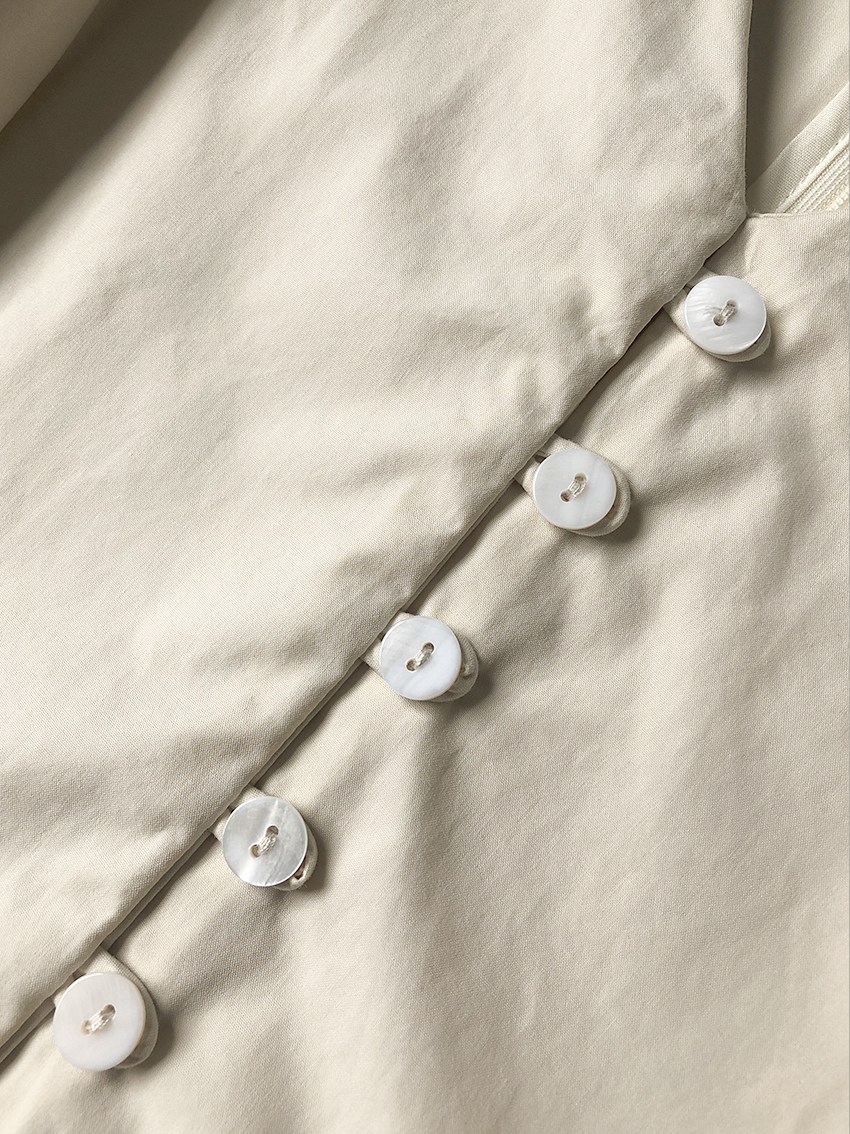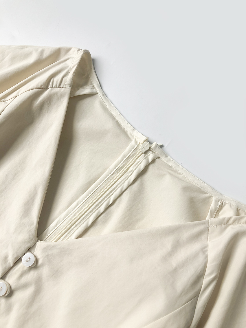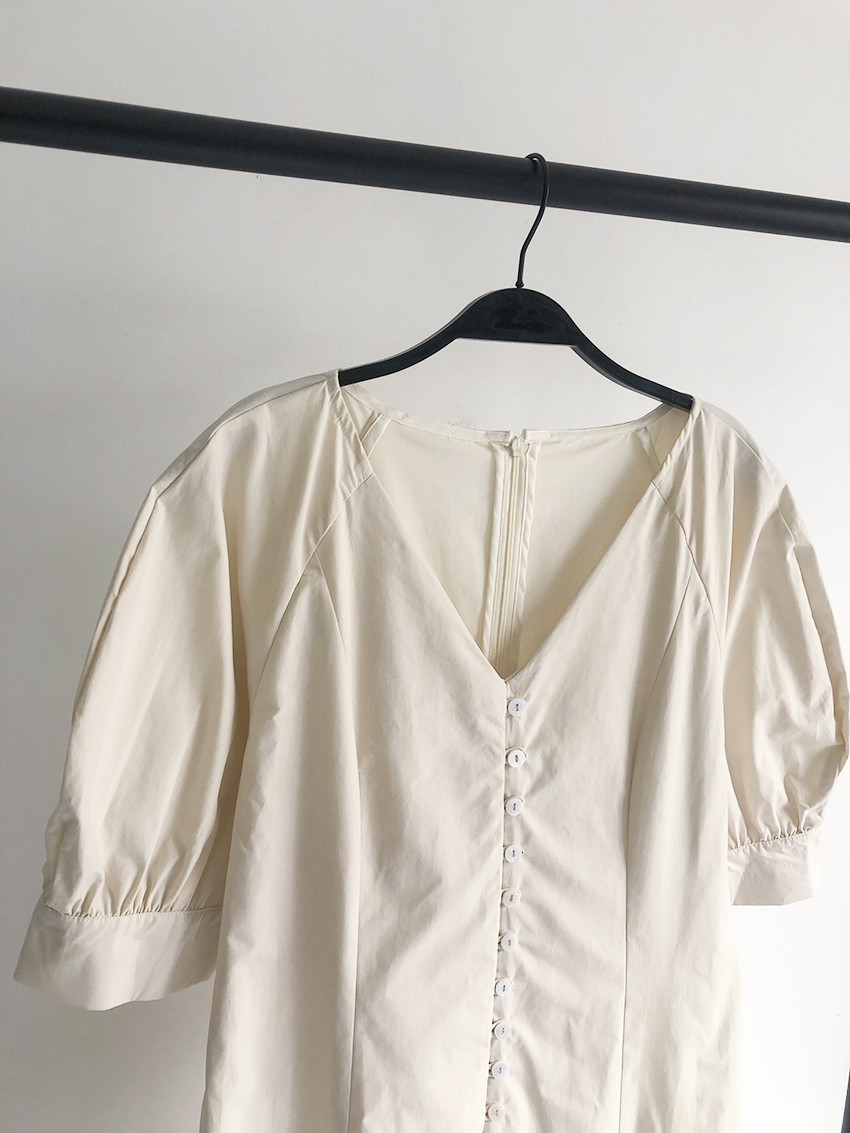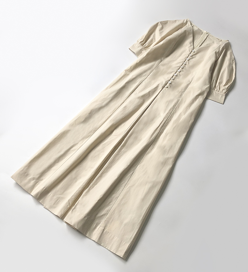 鬆本惠奈設計師款宮廷復古V領泡泡袖排扣高腰開叉洋裝米色長裙