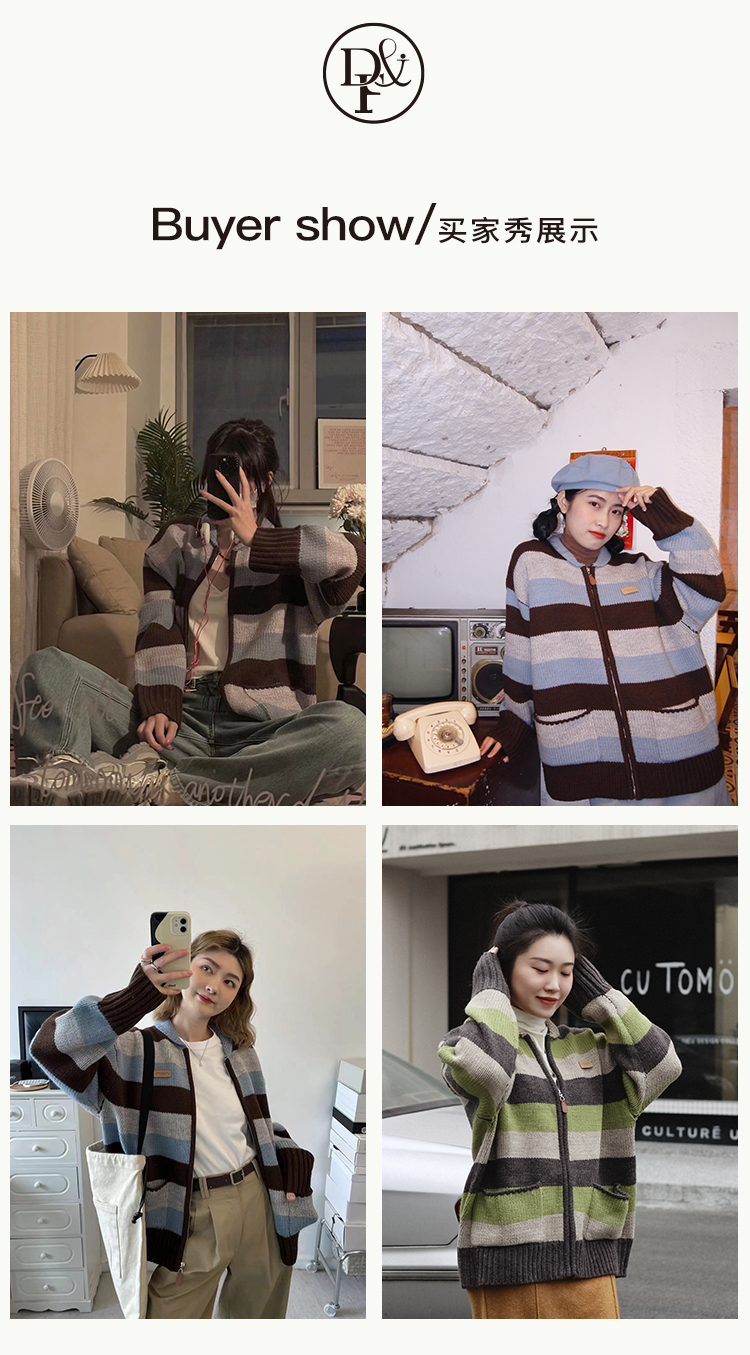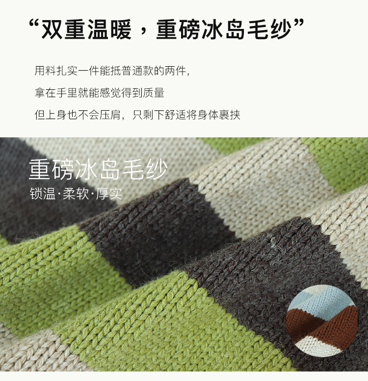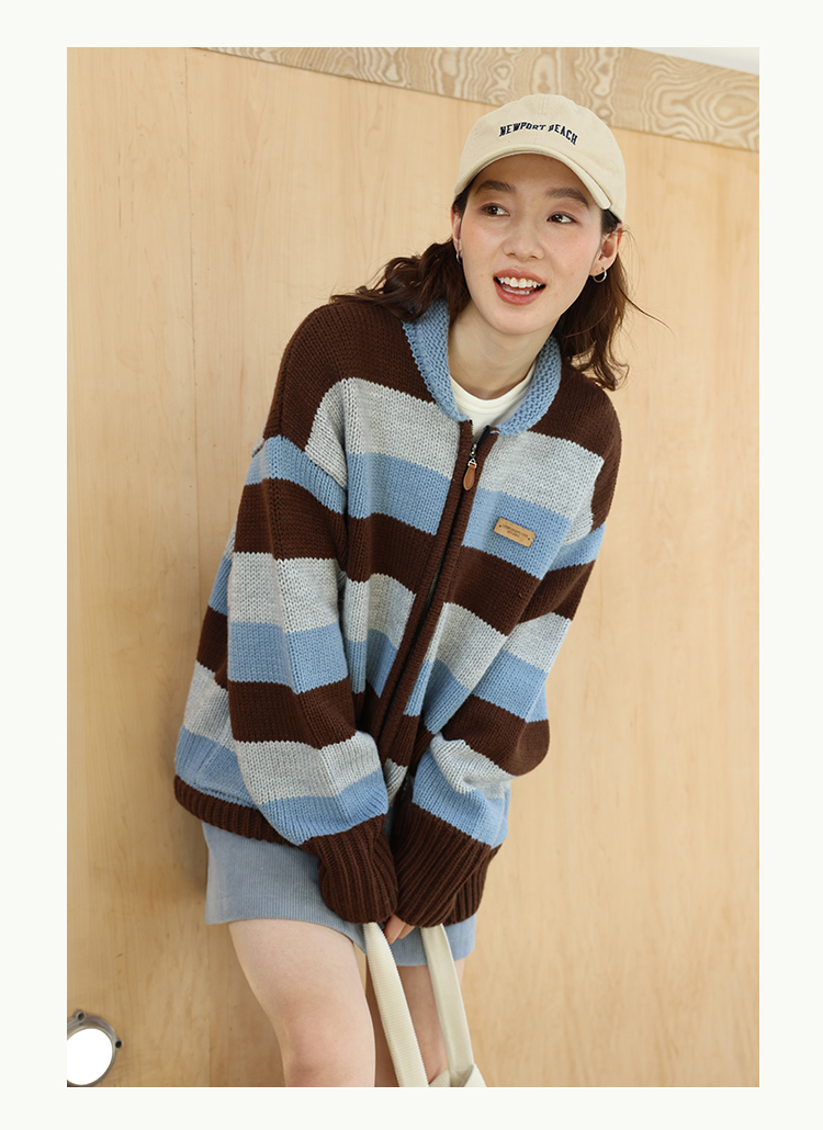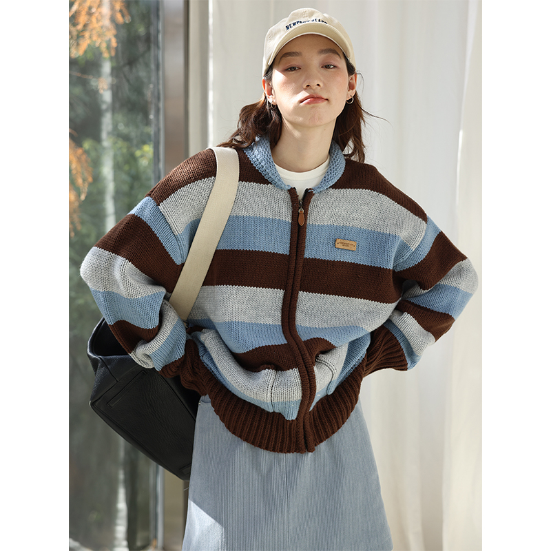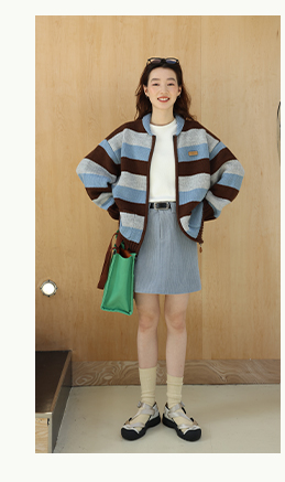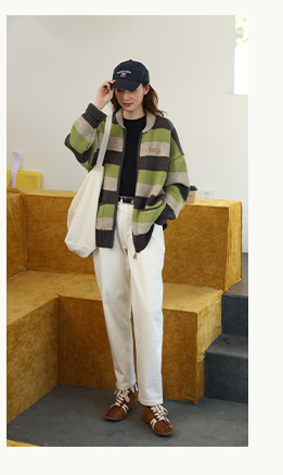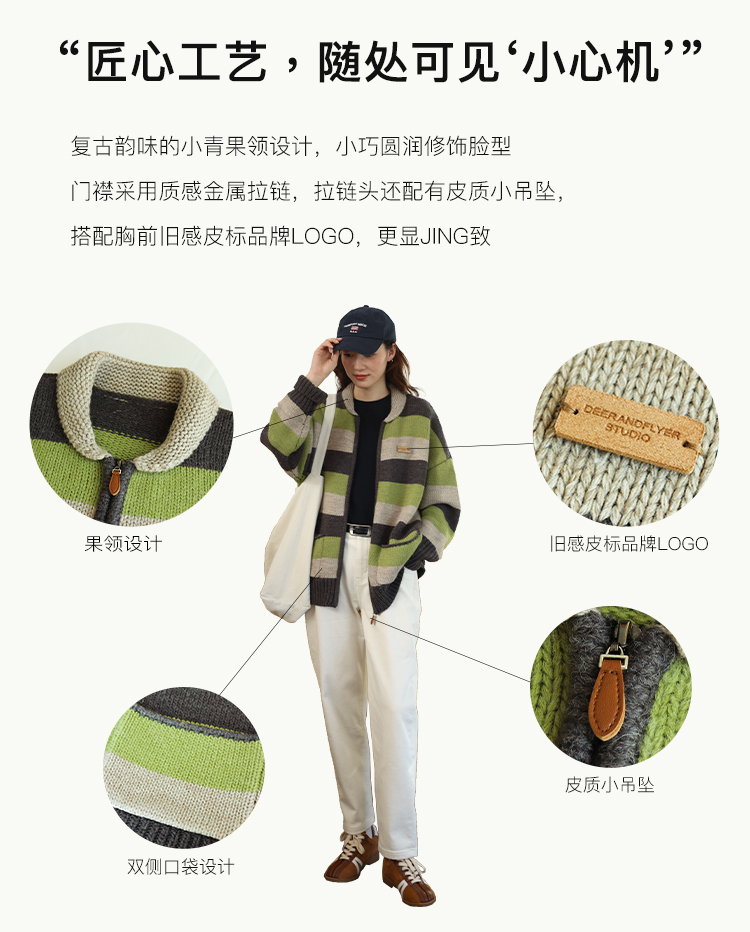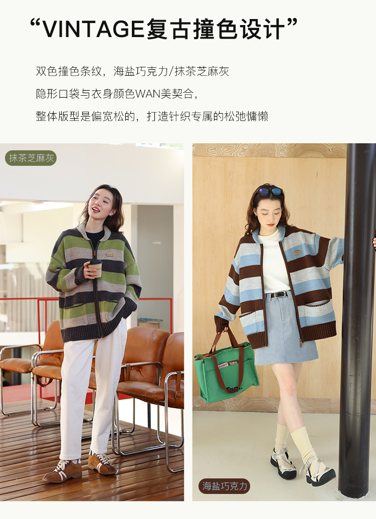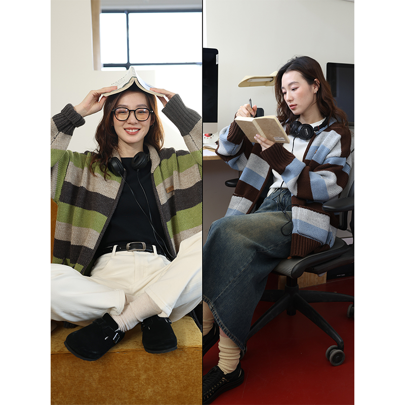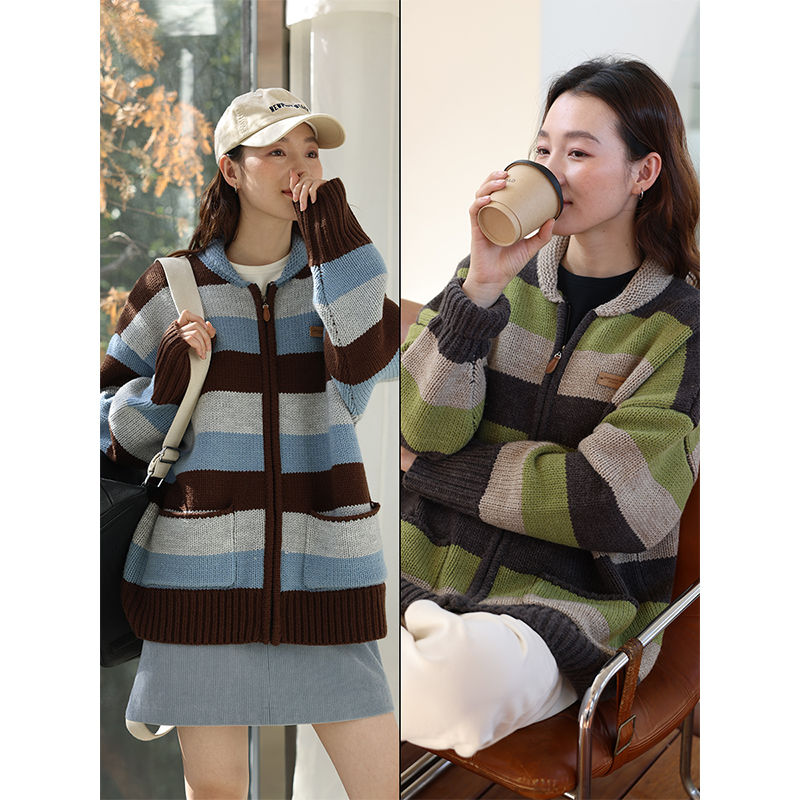 鹿與飛鳥“海鹽與抹茶”羊毛撞色寬條紋冰島紗毛衫外套4816