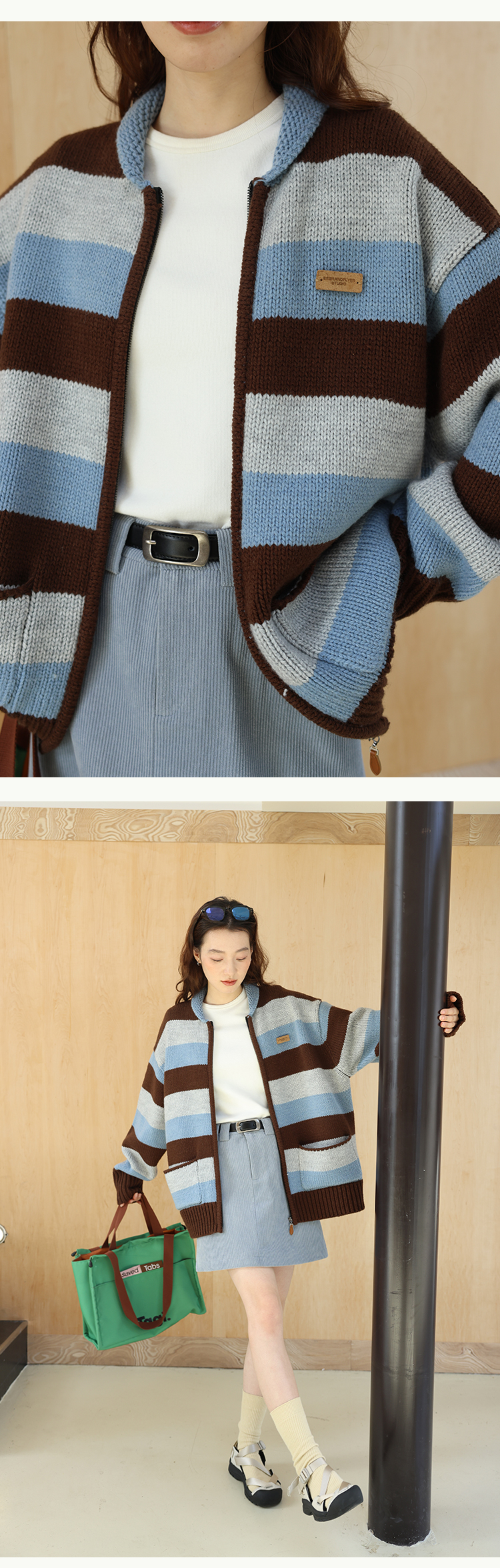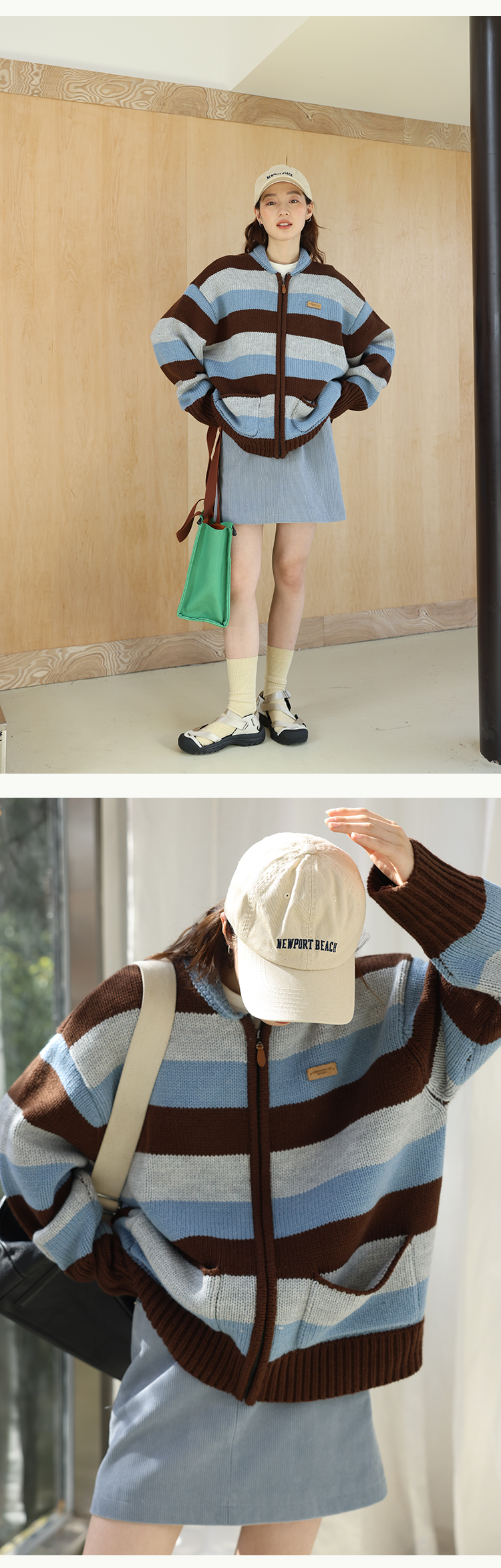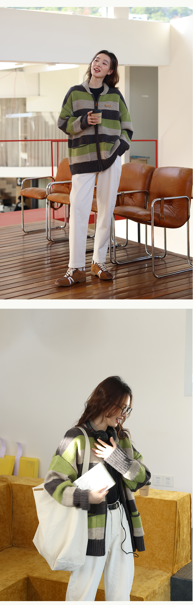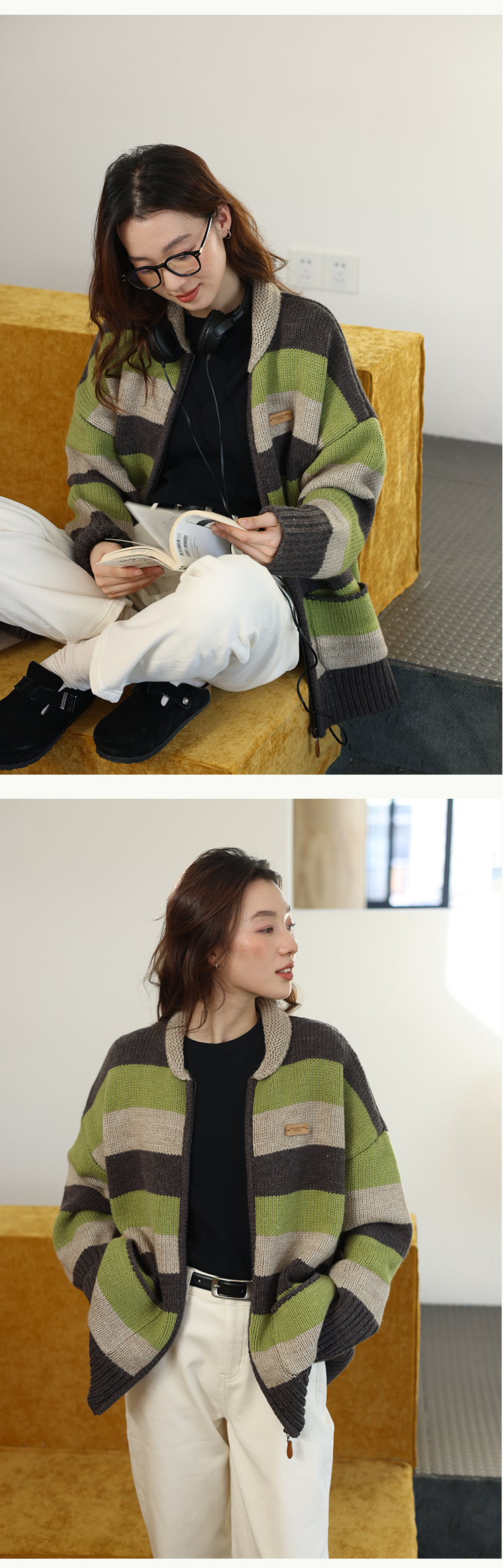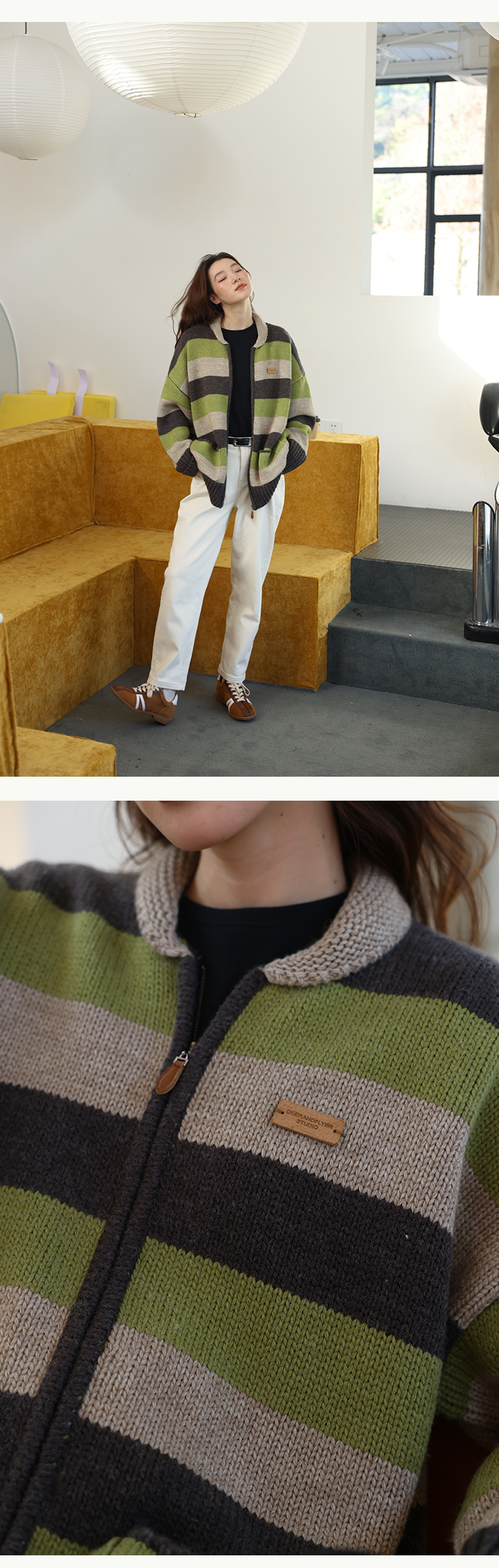 鹿與飛鳥“海鹽與抹茶”羊毛撞色寬條紋冰島紗毛衫外套4816