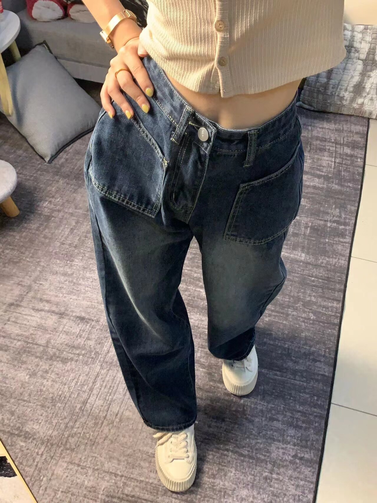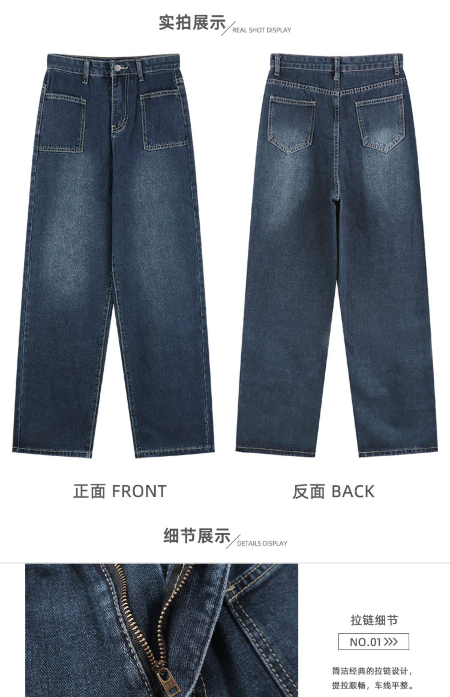 復古藍闊腿牛仔褲女秋季小眾設計ins潮高腰顯瘦直筒垂感拖地長褲