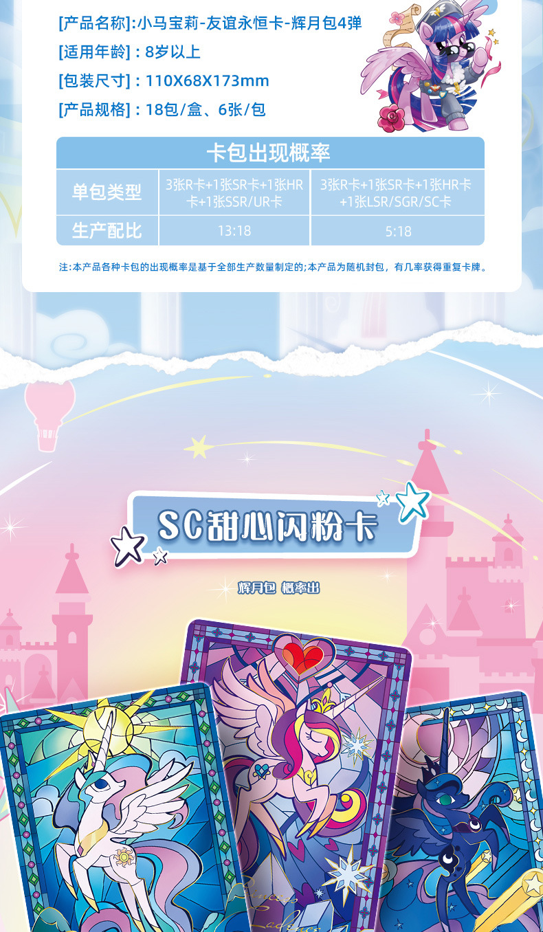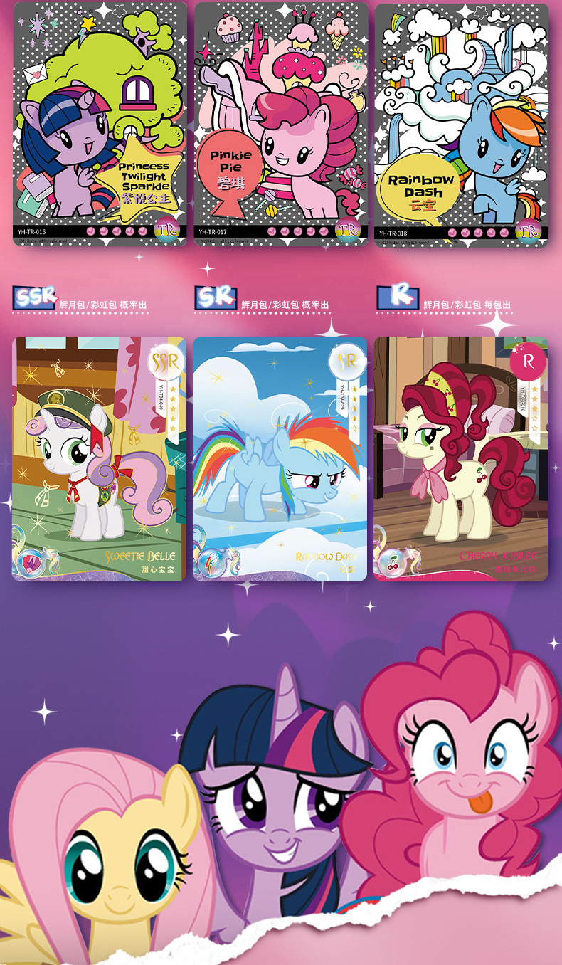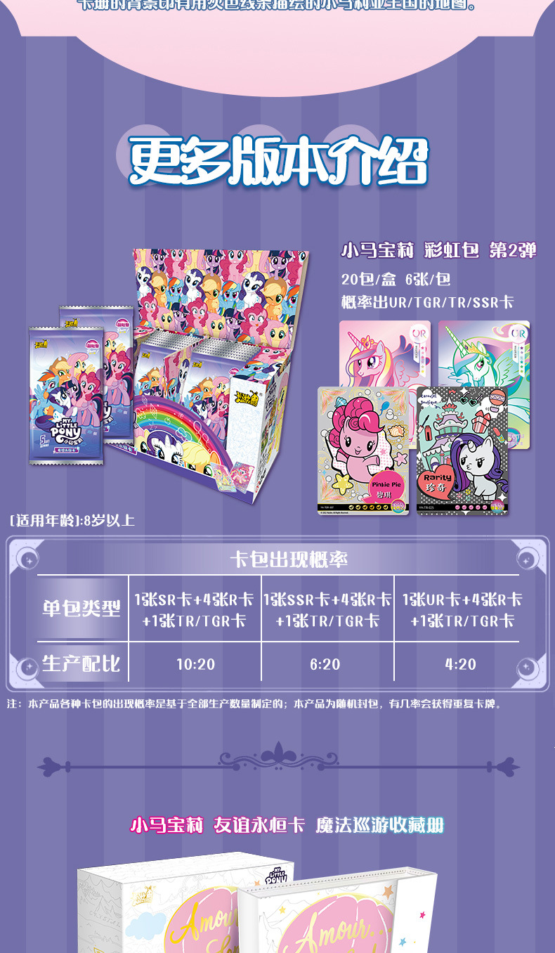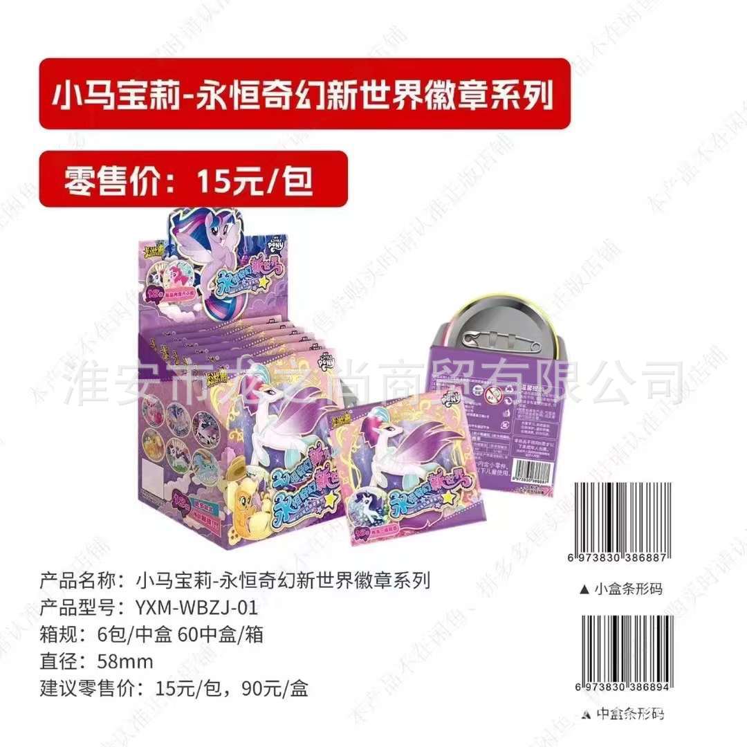 颜色 小马宝莉5元彩虹包1包(需要一盒数量拍20),小马宝莉2元趣影包1包(需要一盒数量拍30),小马宝莉10元辉月包5弹1包(需要一盒数量拍18),永恒奇幻新世界徽章1个(需要整合按6的倍数拍)
