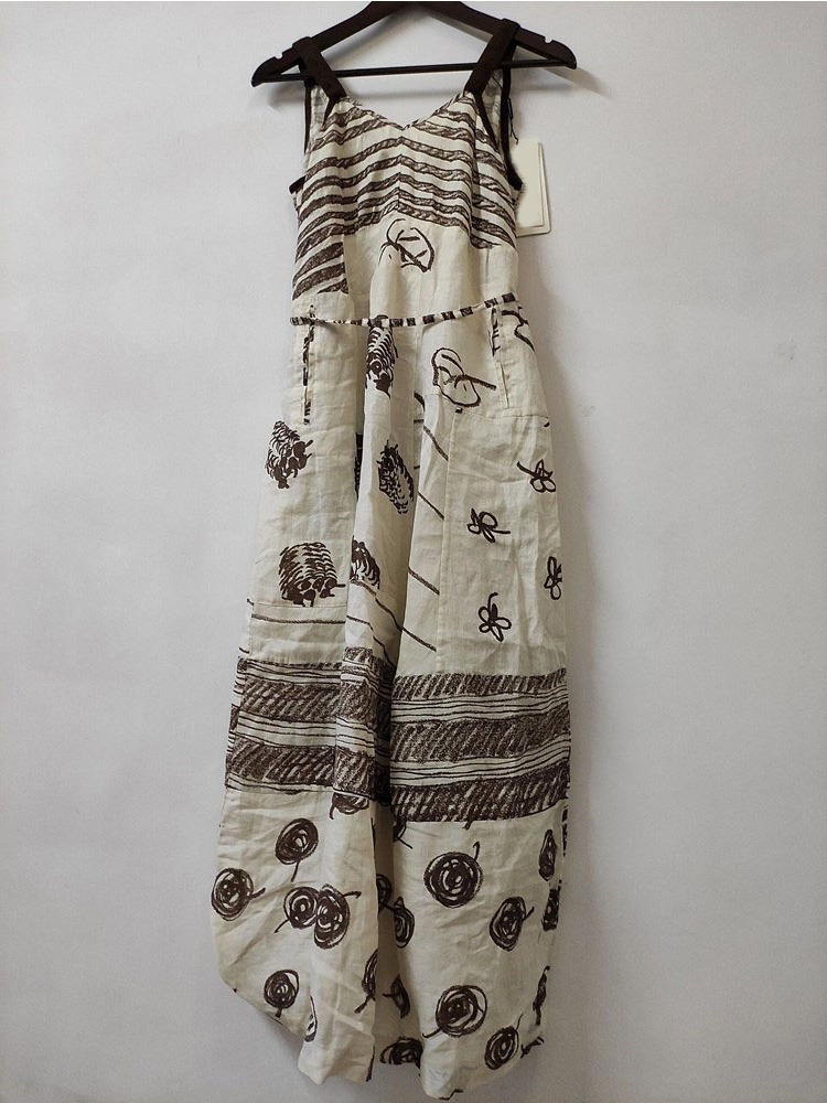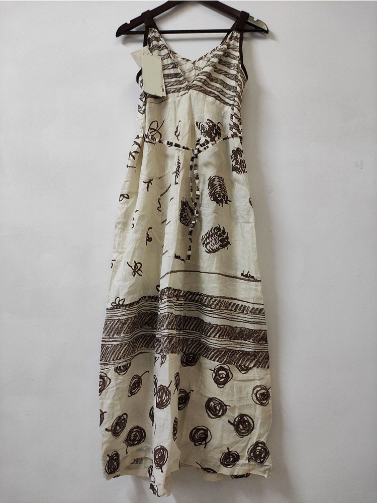 古著vintage設計感小眾獨特減齡復古文藝範印花棉麻吊帶洋裝子