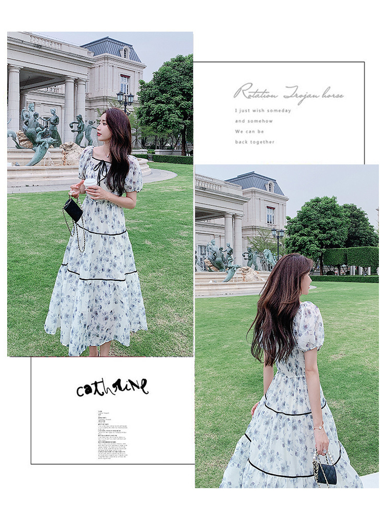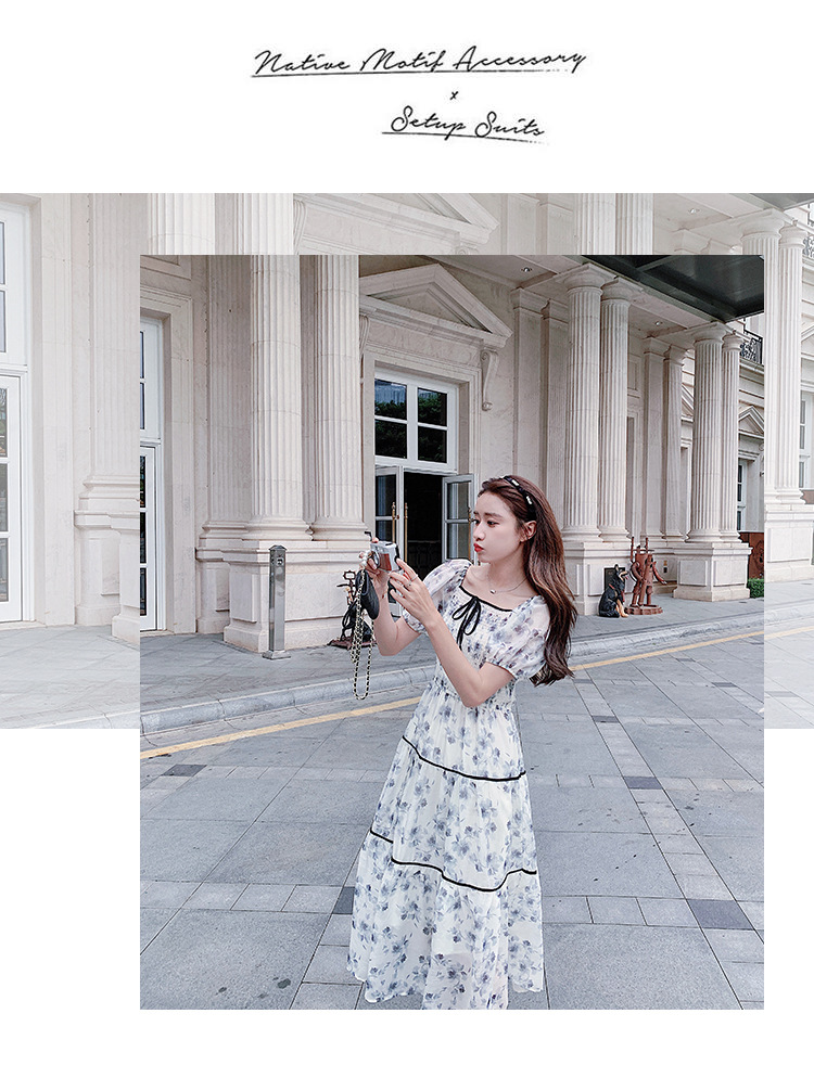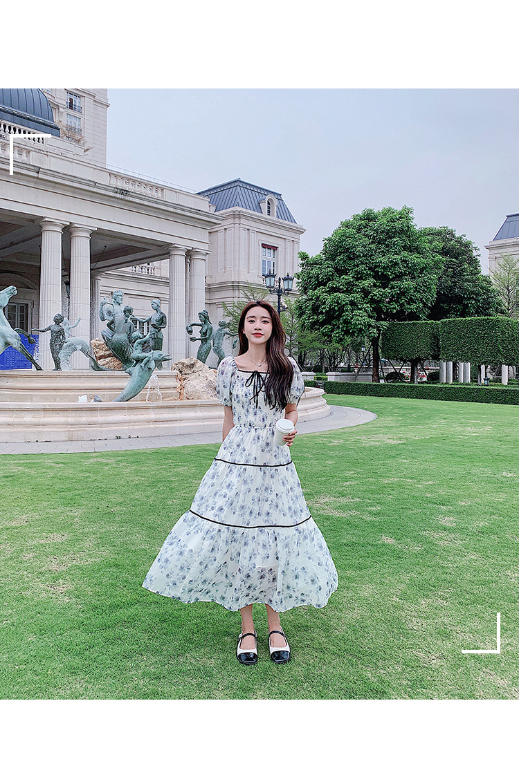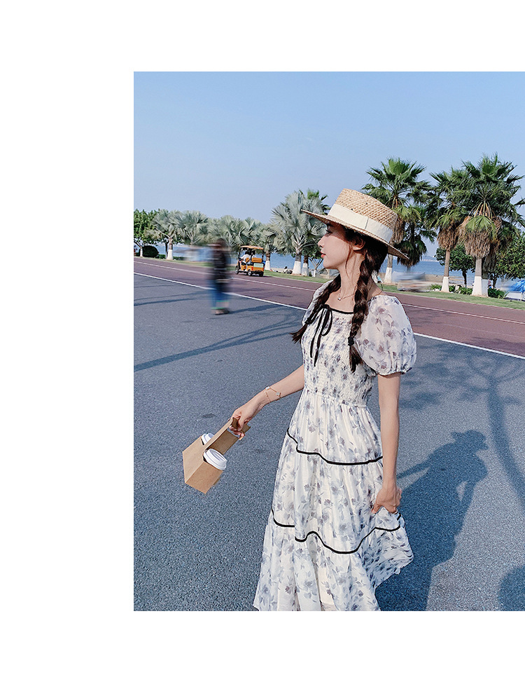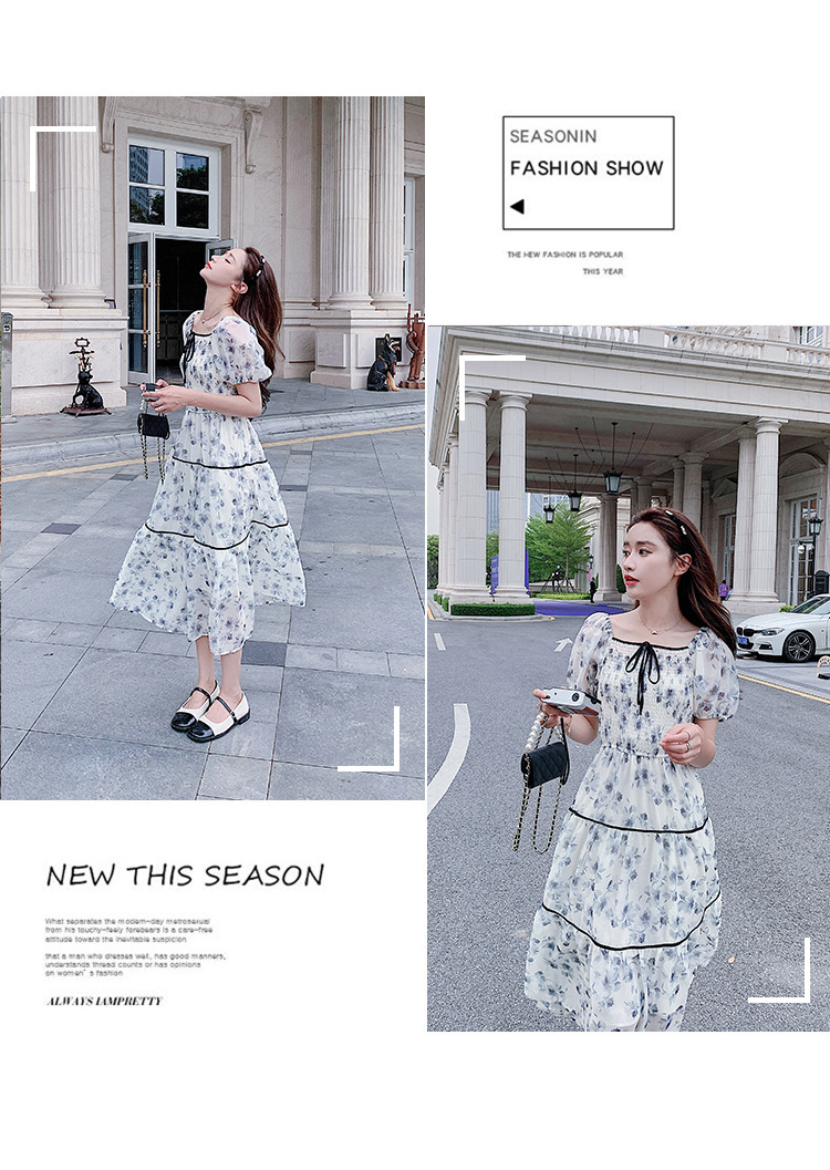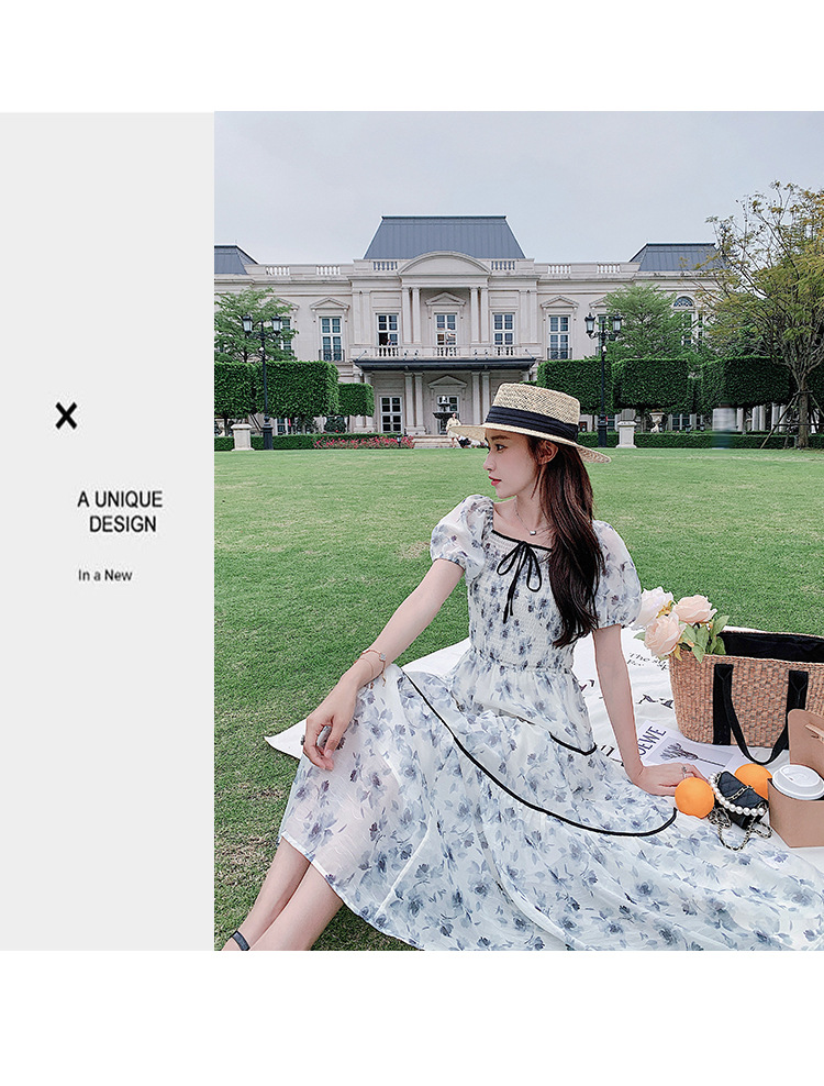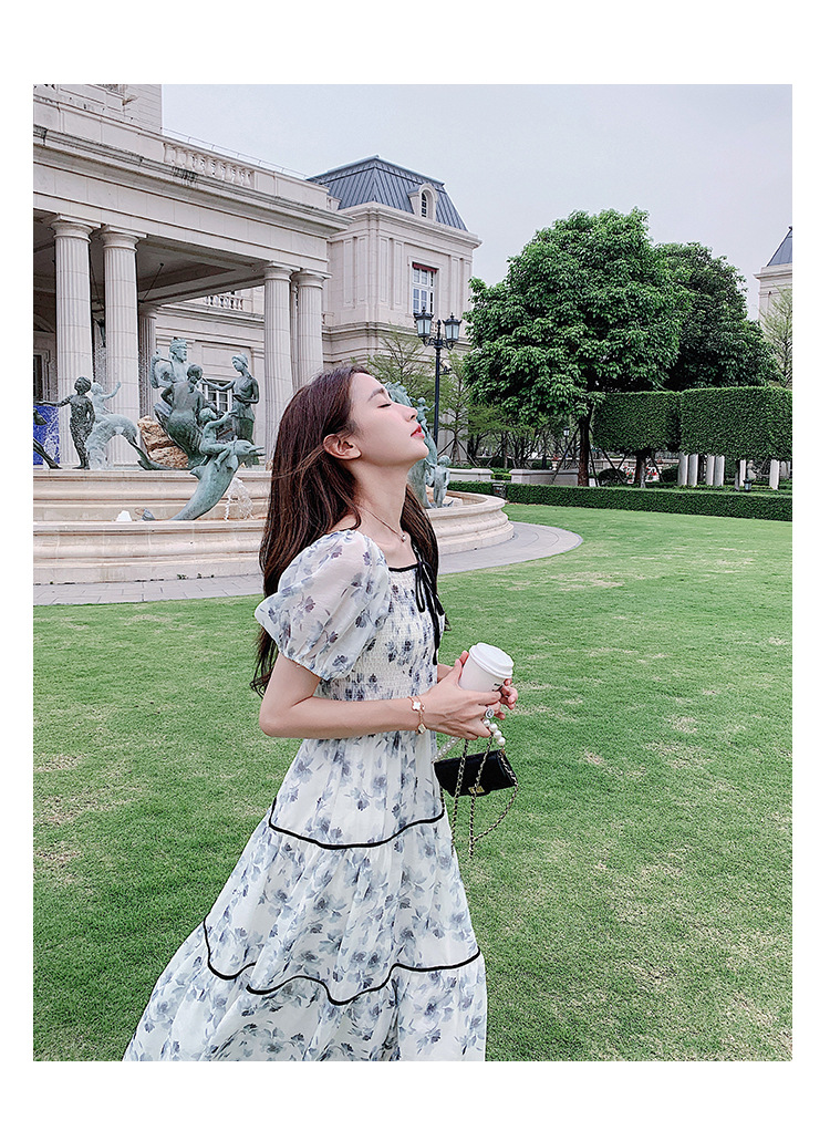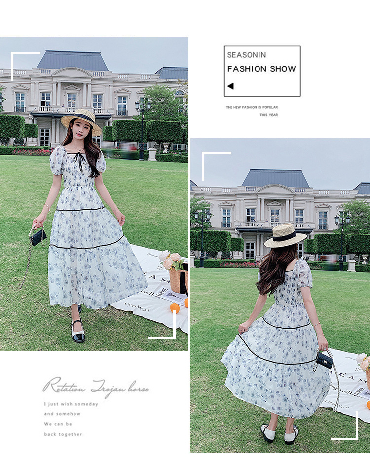 雪纺气质碎花长裙2023夏季新款收腰显瘦方领连衣裙茶歇法式仙女裙