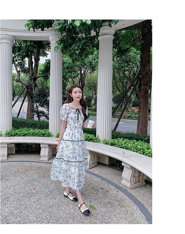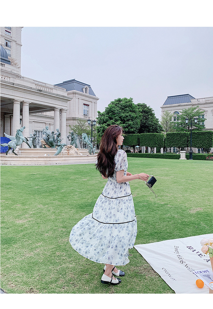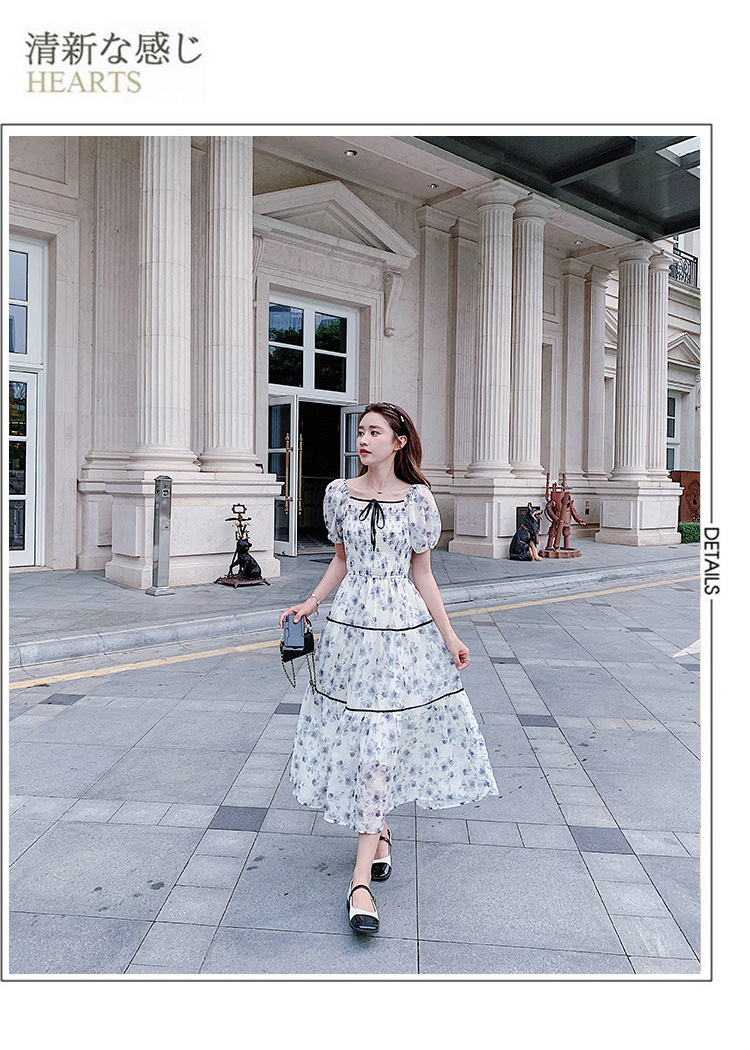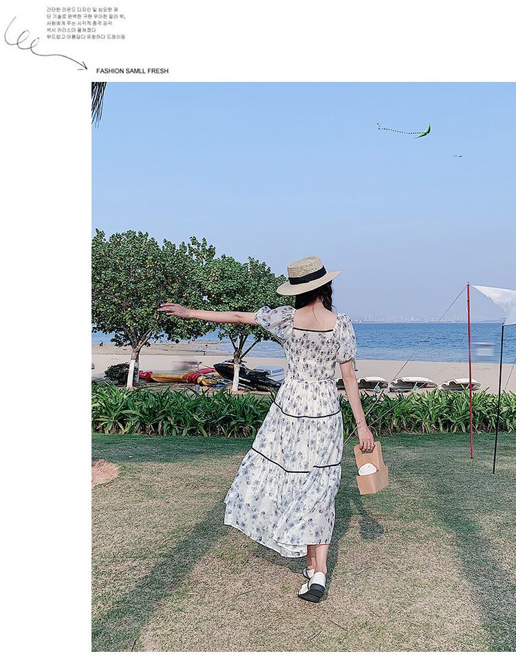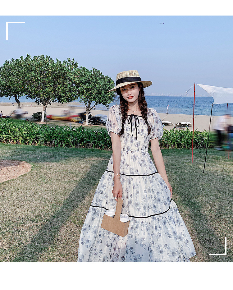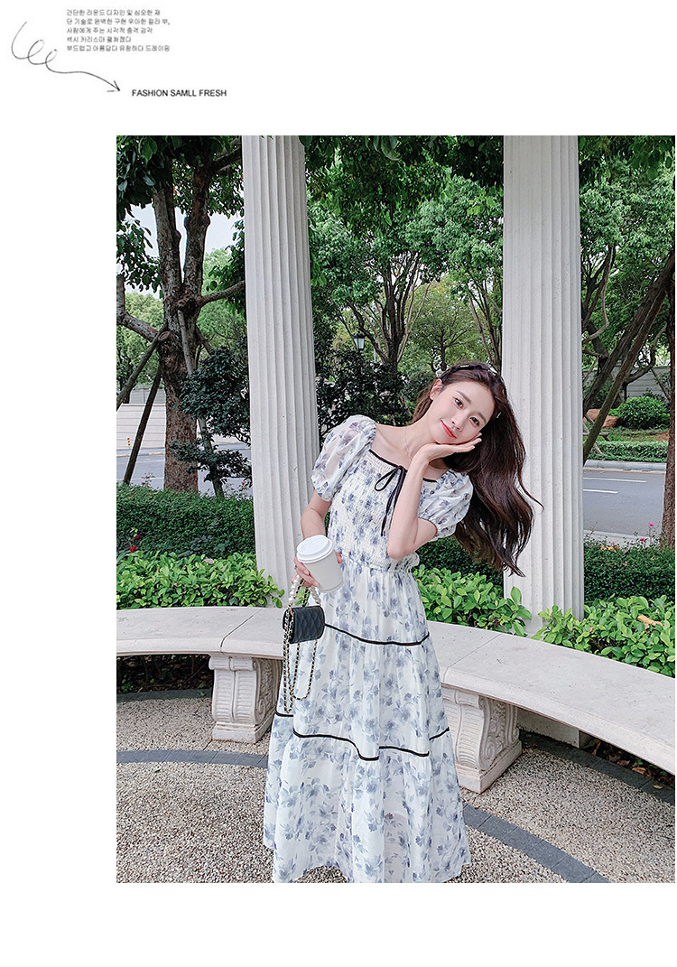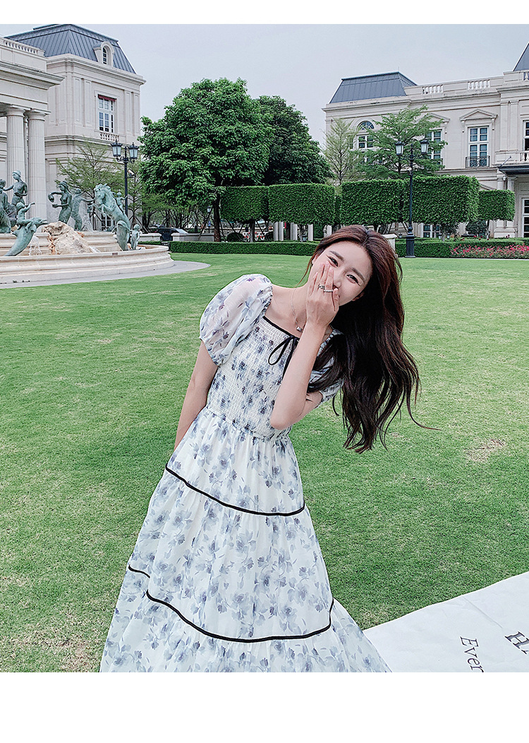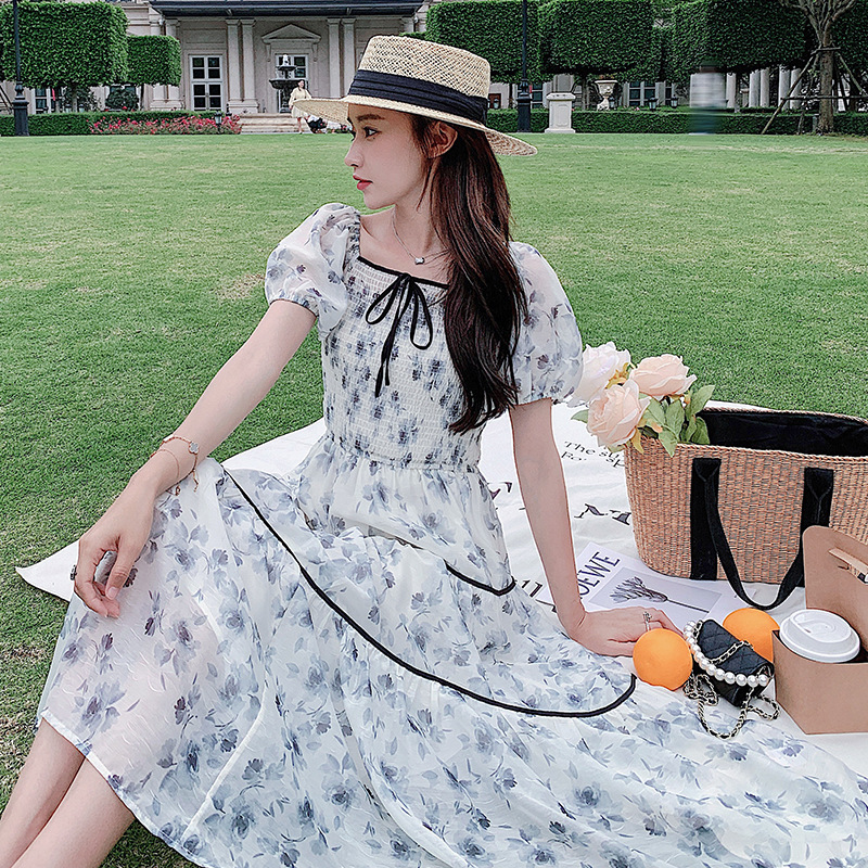 雪纺气质碎花长裙2023夏季新款收腰显瘦方领连衣裙茶歇法式仙女裙
