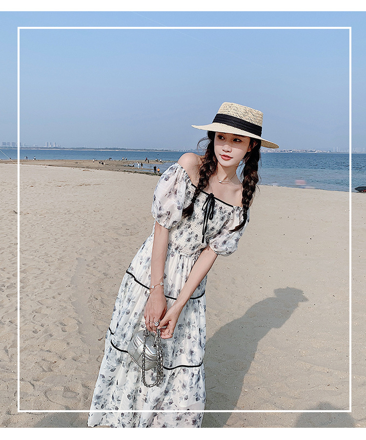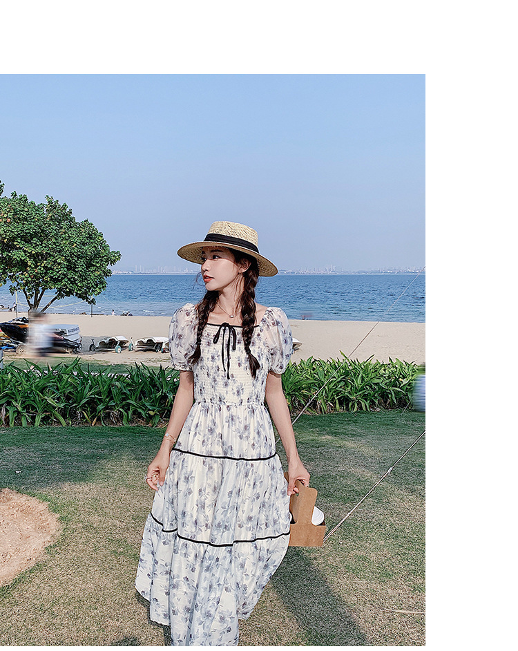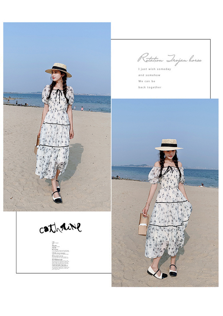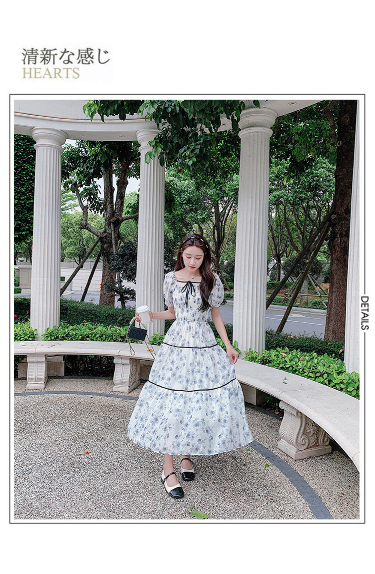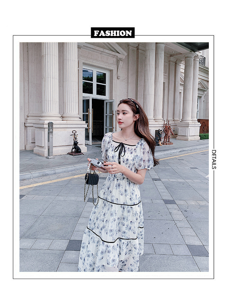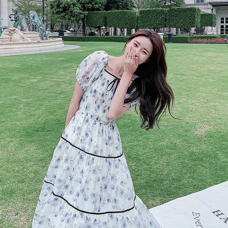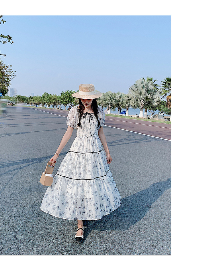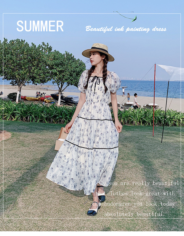雪纺气质碎花长裙2023夏季新款收腰显瘦方领连衣裙茶歇法式仙女裙