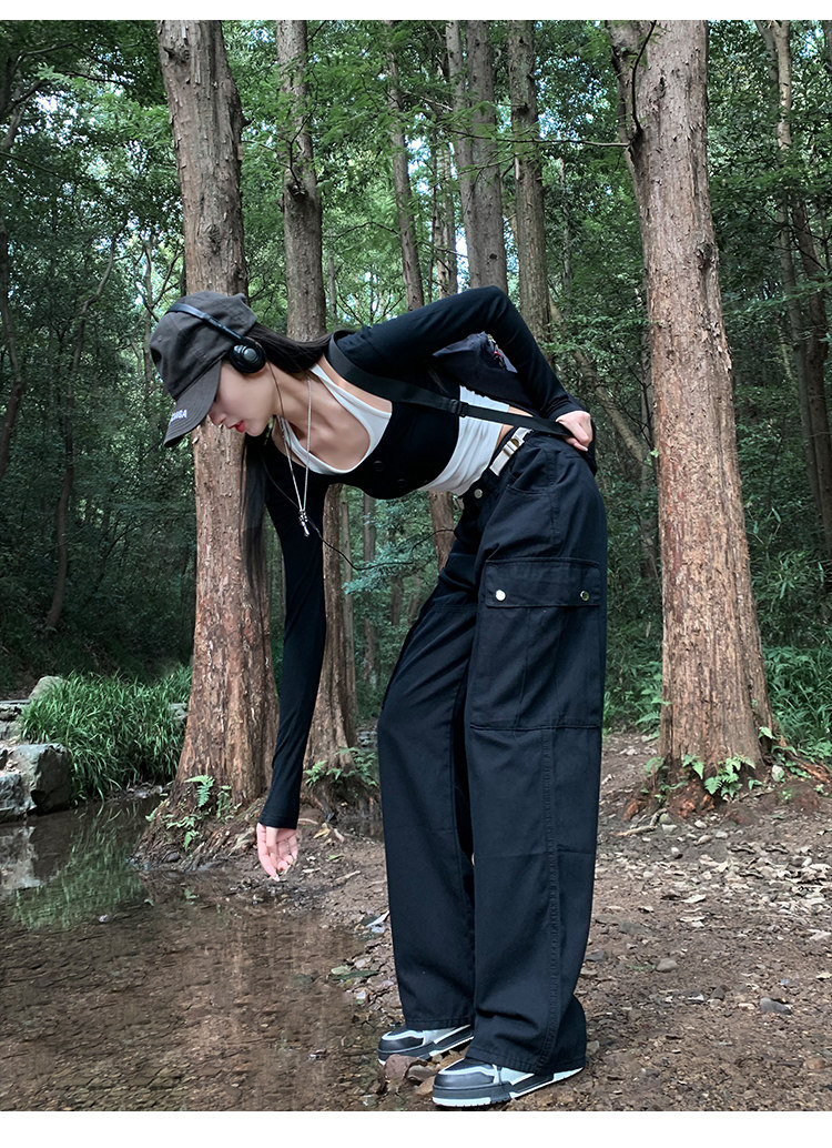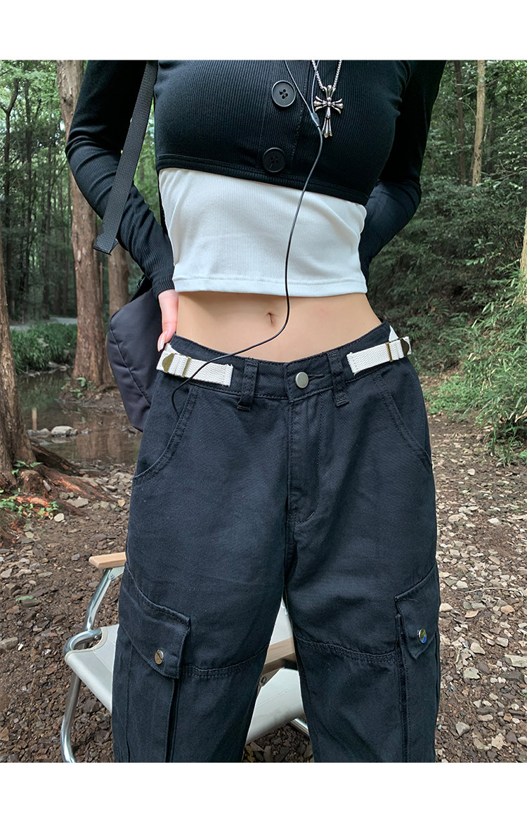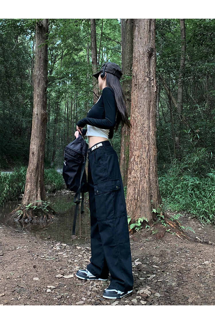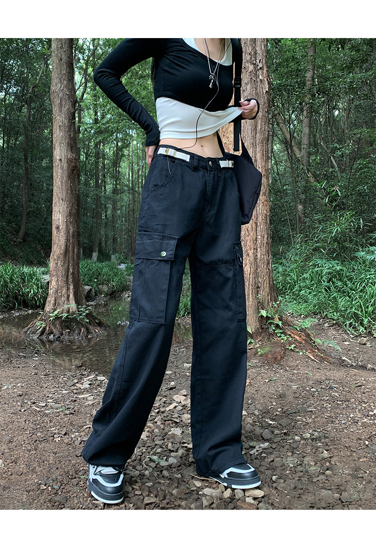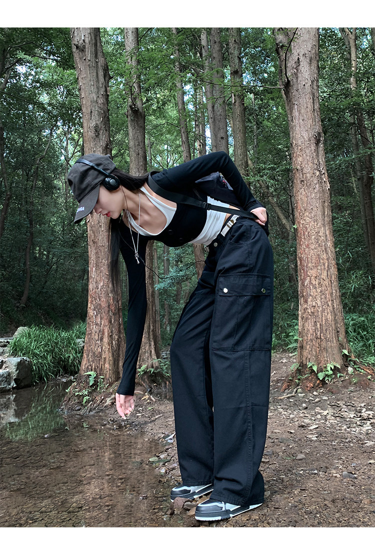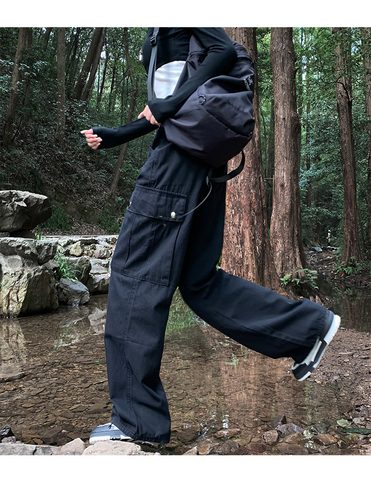 美式露營機能口袋工裝褲女春顯瘦闊腿褲設計感可調節高腰直筒長褲