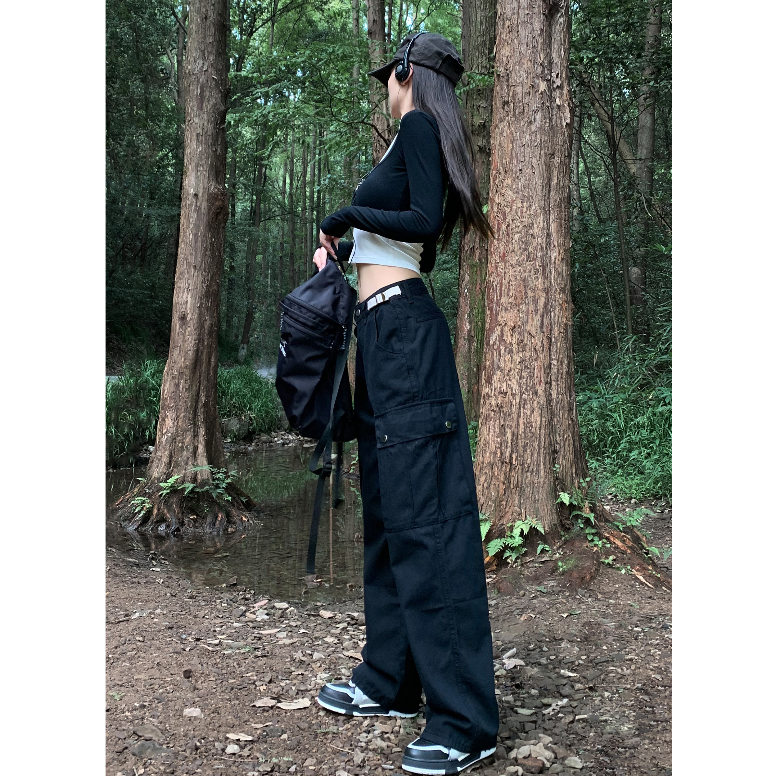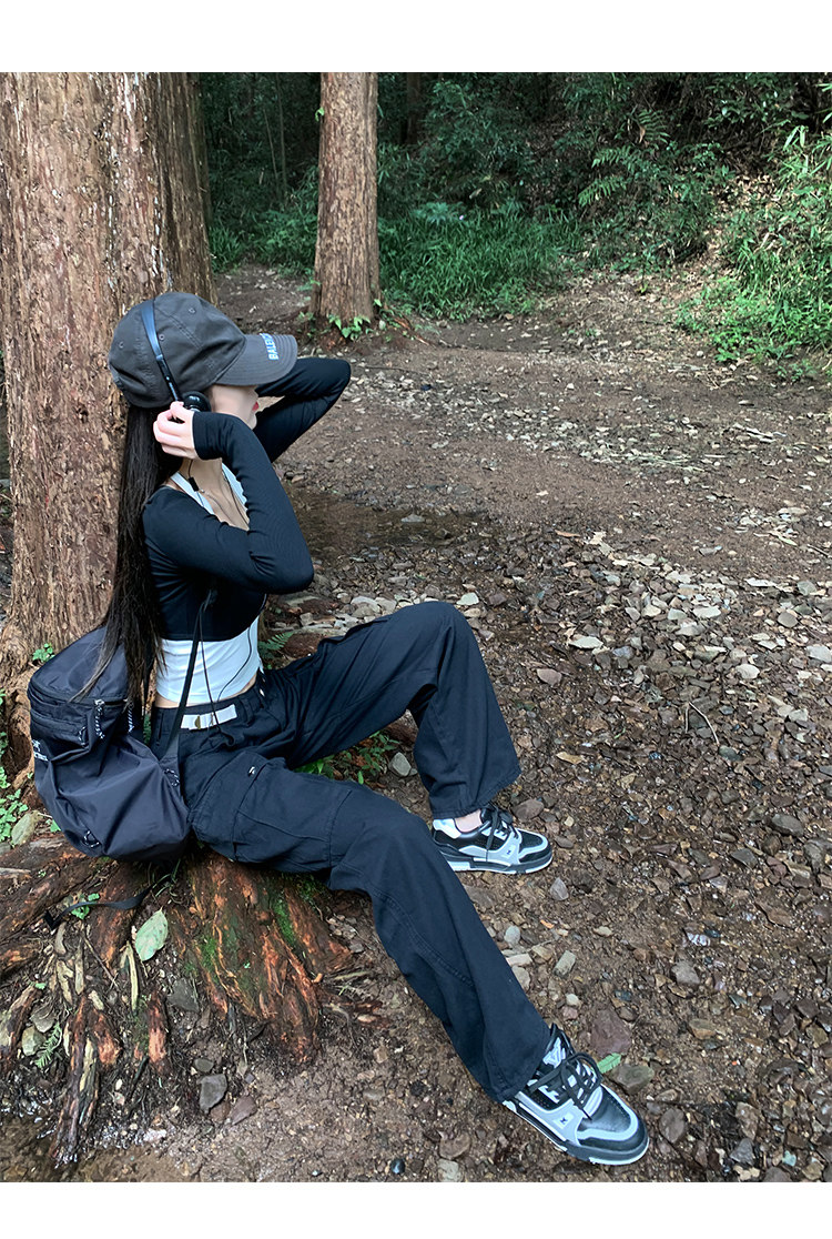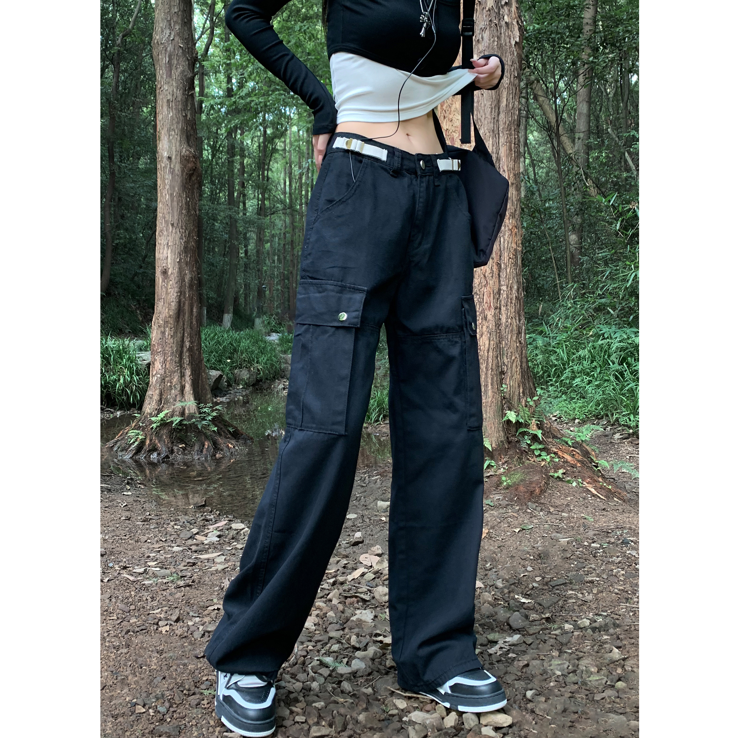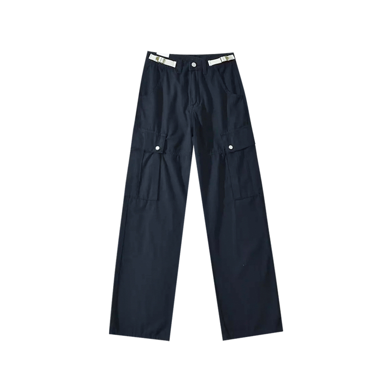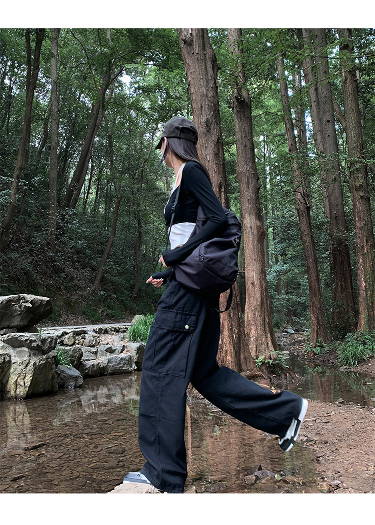 美式露營機能口袋工裝褲女春顯瘦闊腿褲設計感可調節高腰直筒長褲