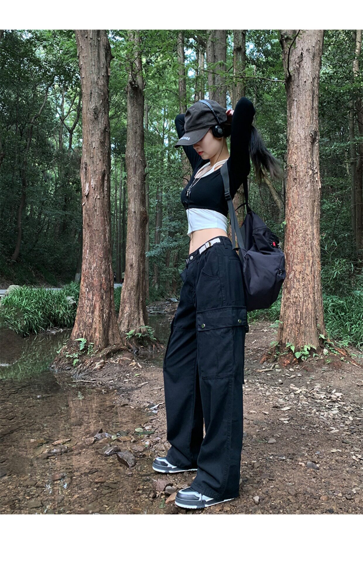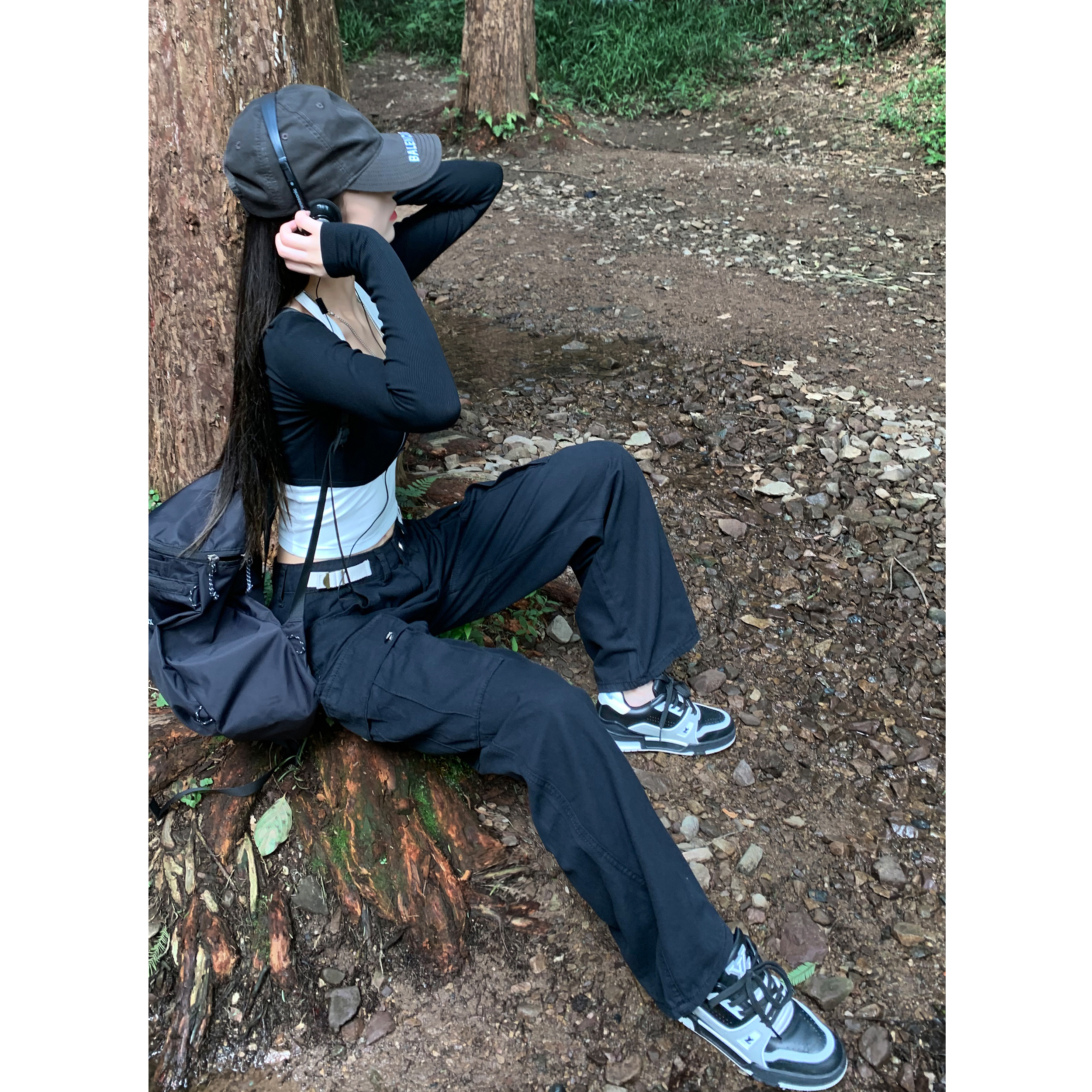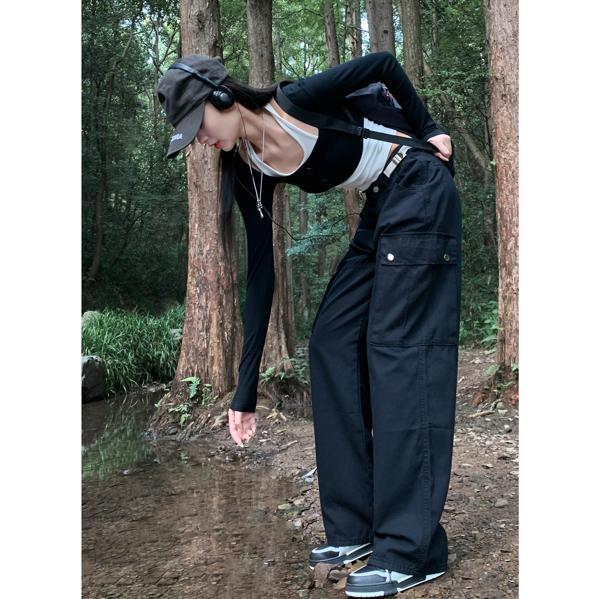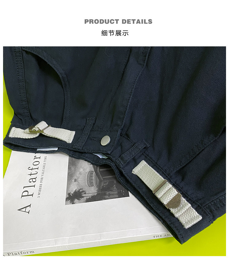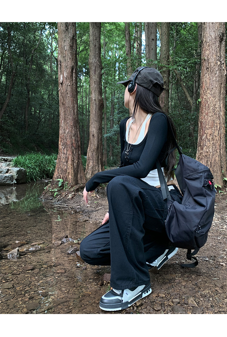 美式露營機能口袋工裝褲女春顯瘦闊腿褲設計感可調節高腰直筒長褲