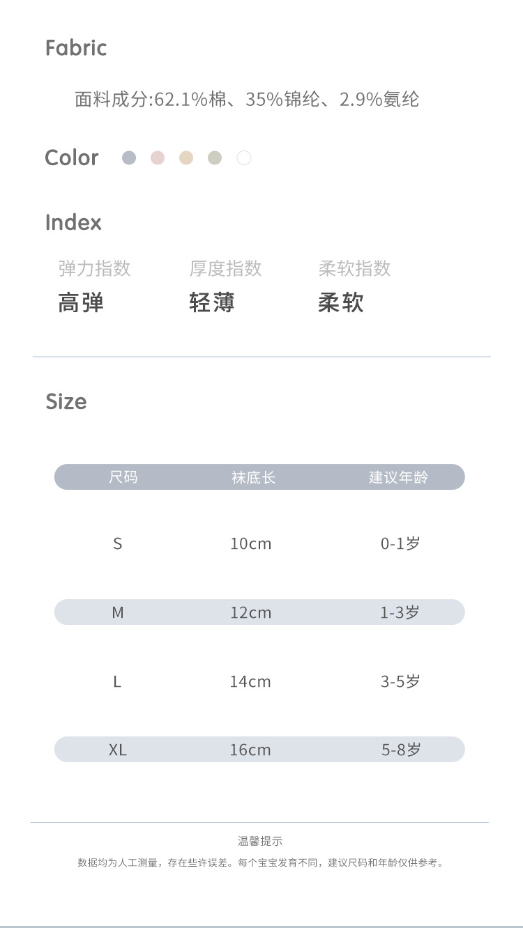童袜尺码 S 0-1岁,M 1-3岁,L 3-5岁,XL 5-8岁