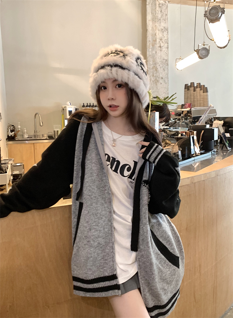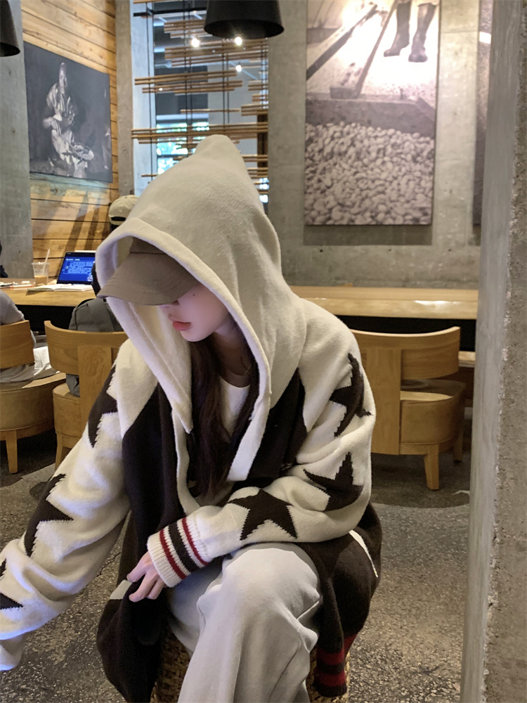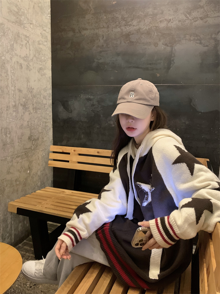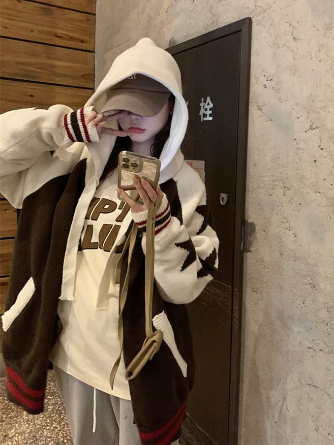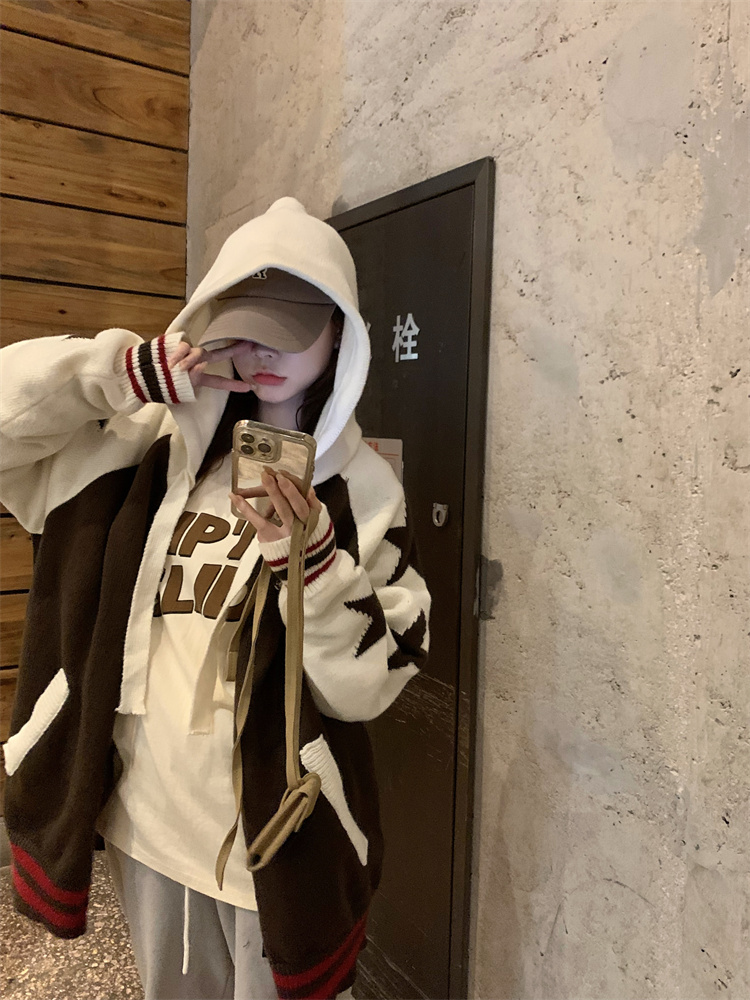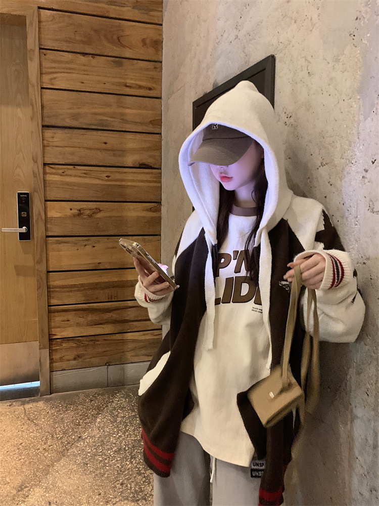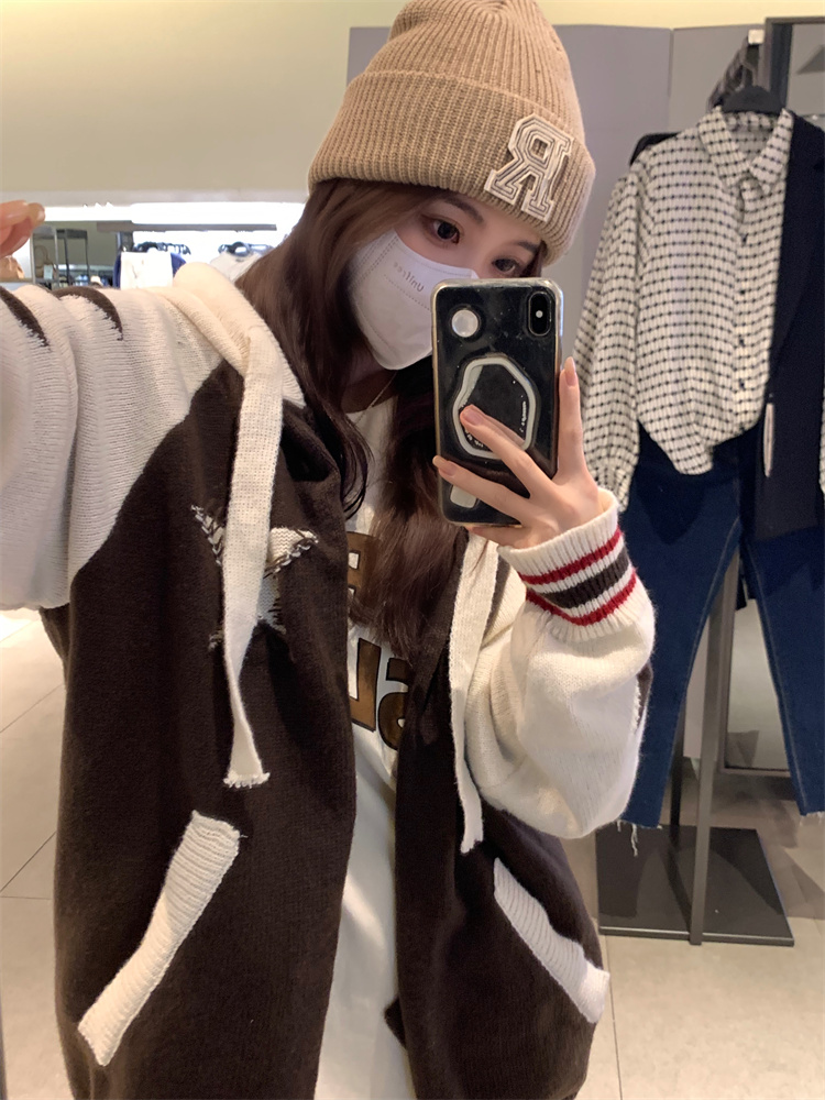 連帽針織衫開衫毛衣女秋冬慵懶風復古撞色拼接設計感小眾寬鬆外套