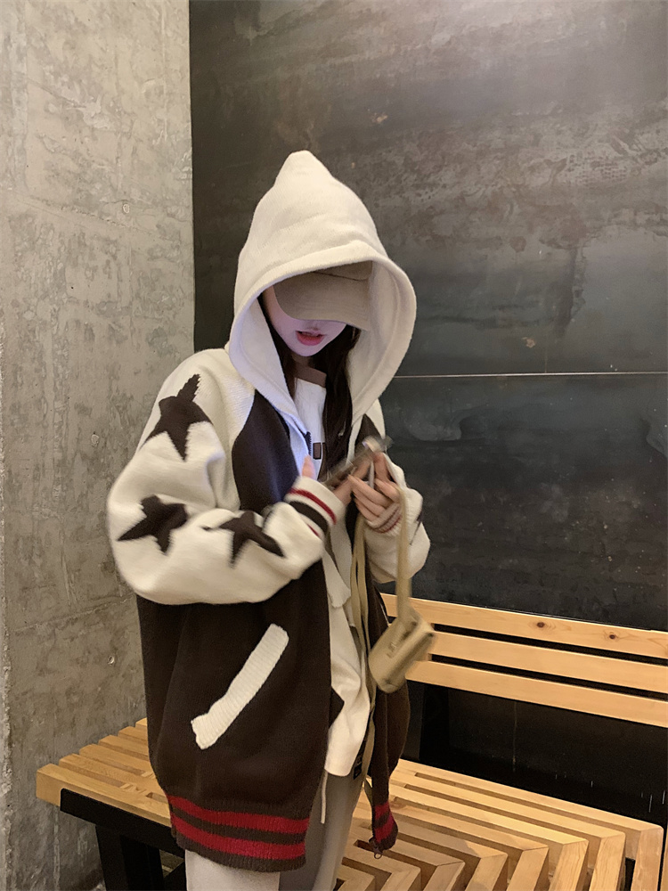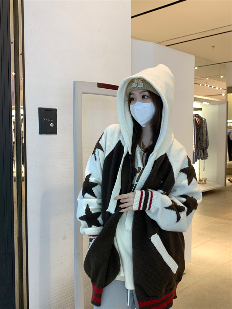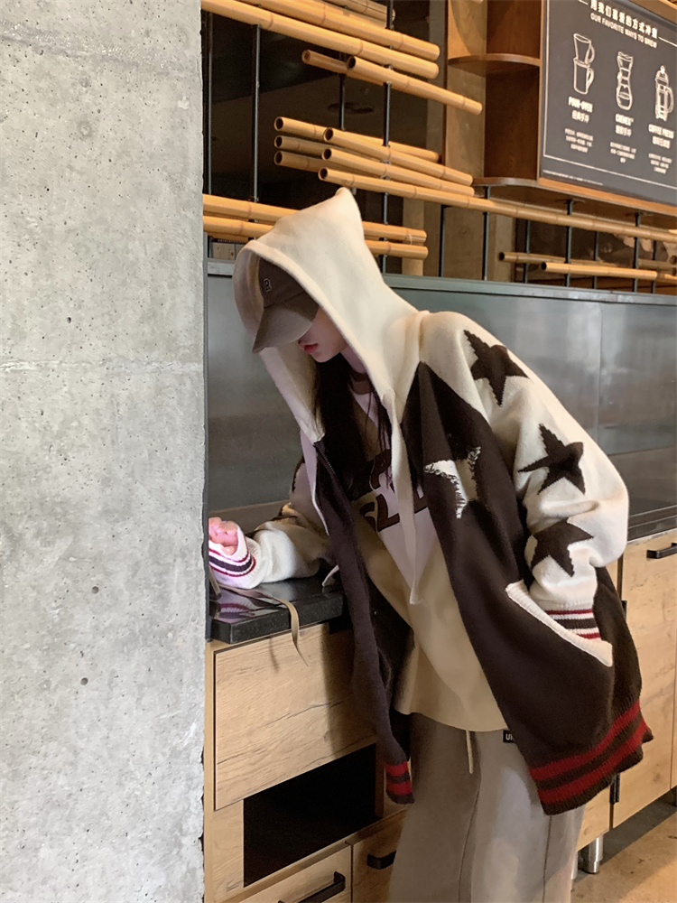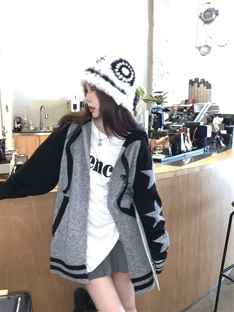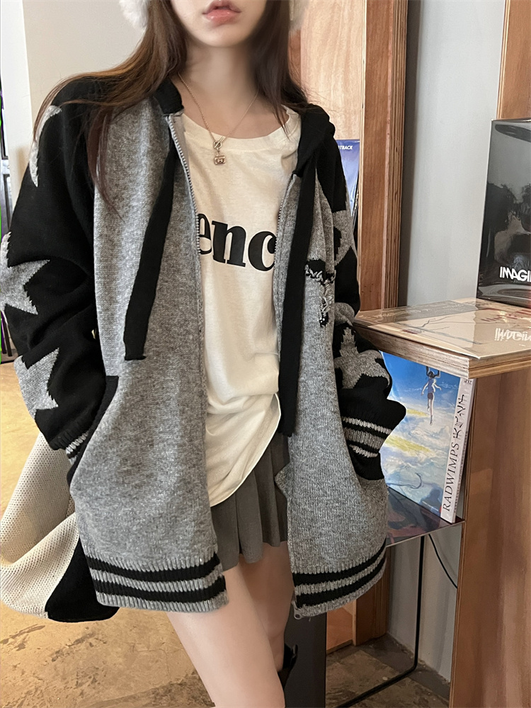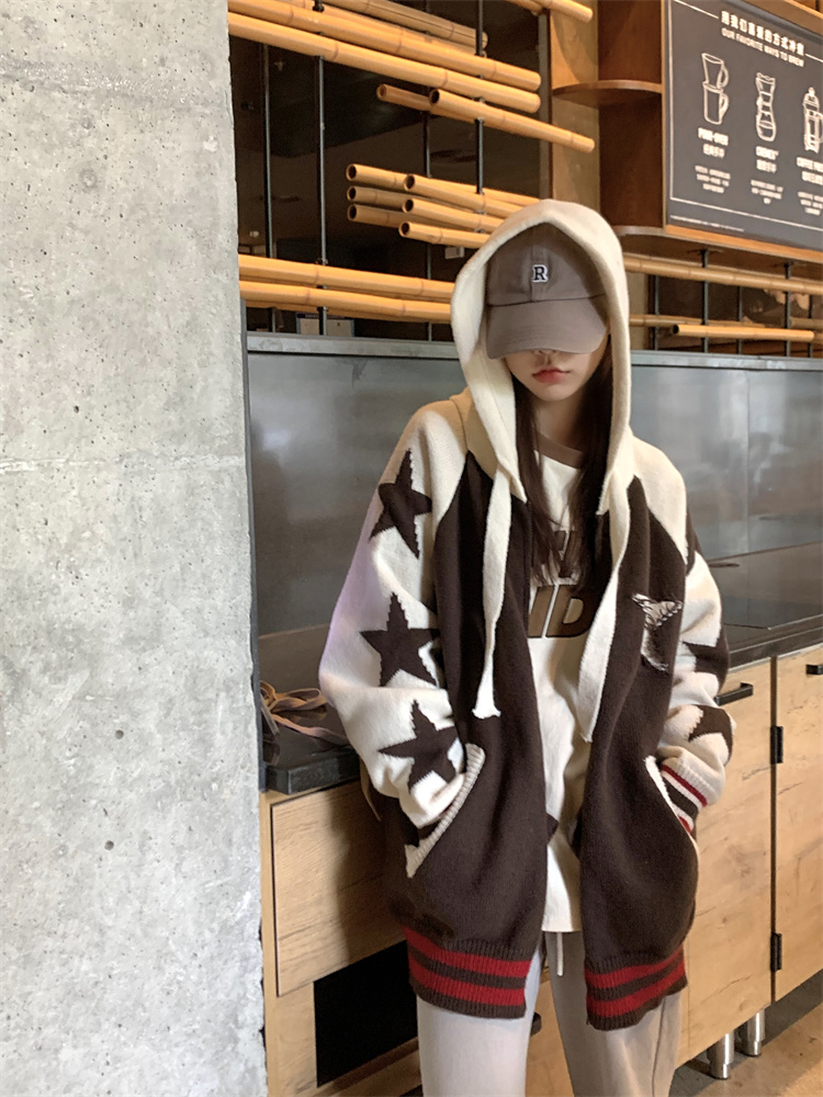連帽針織衫開衫毛衣女秋冬慵懶風復古撞色拼接設計感小眾寬鬆外套