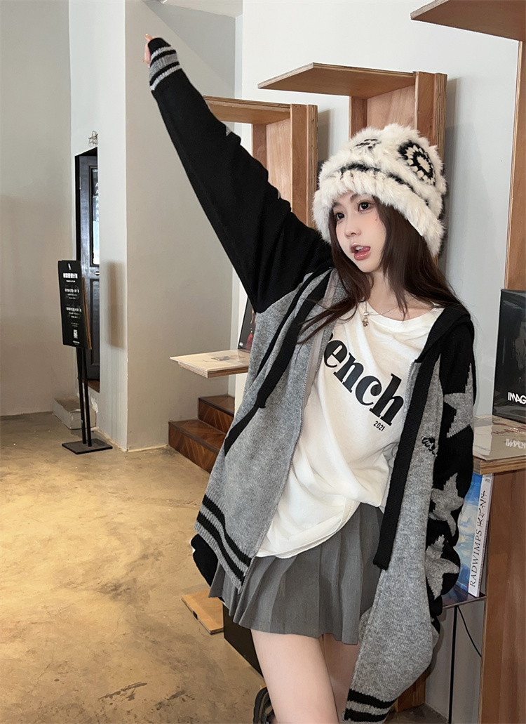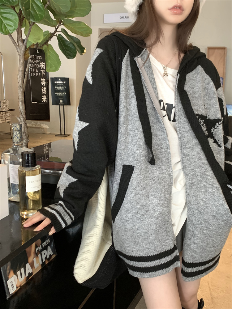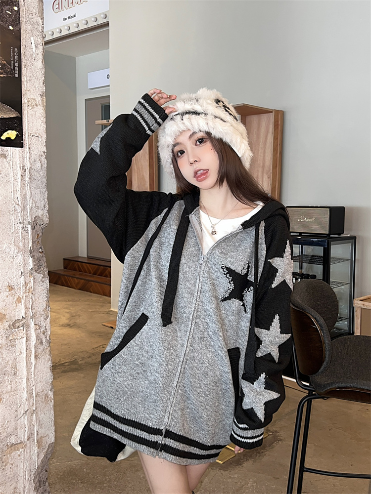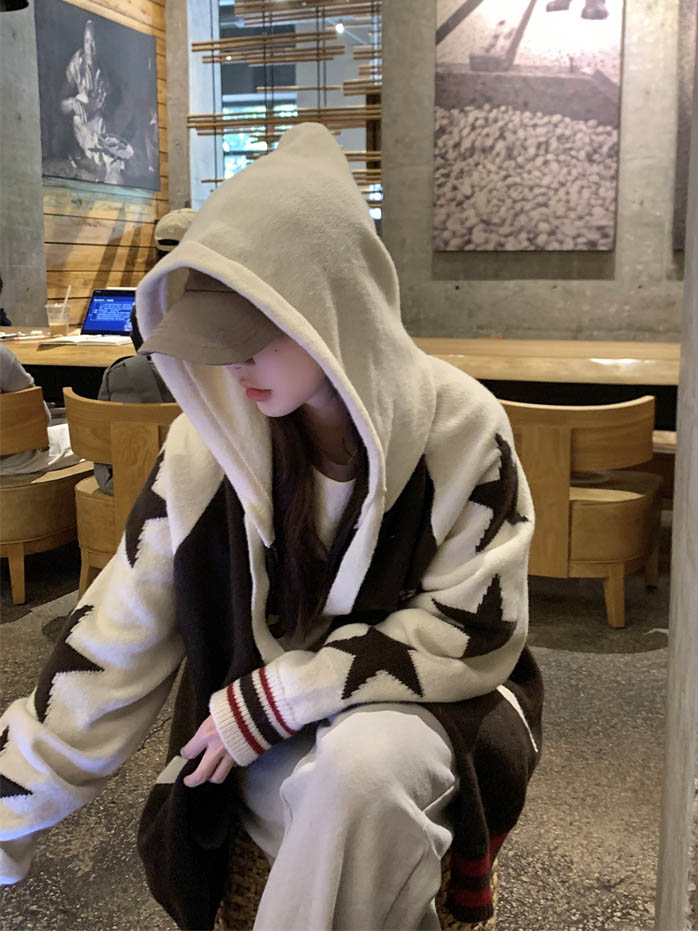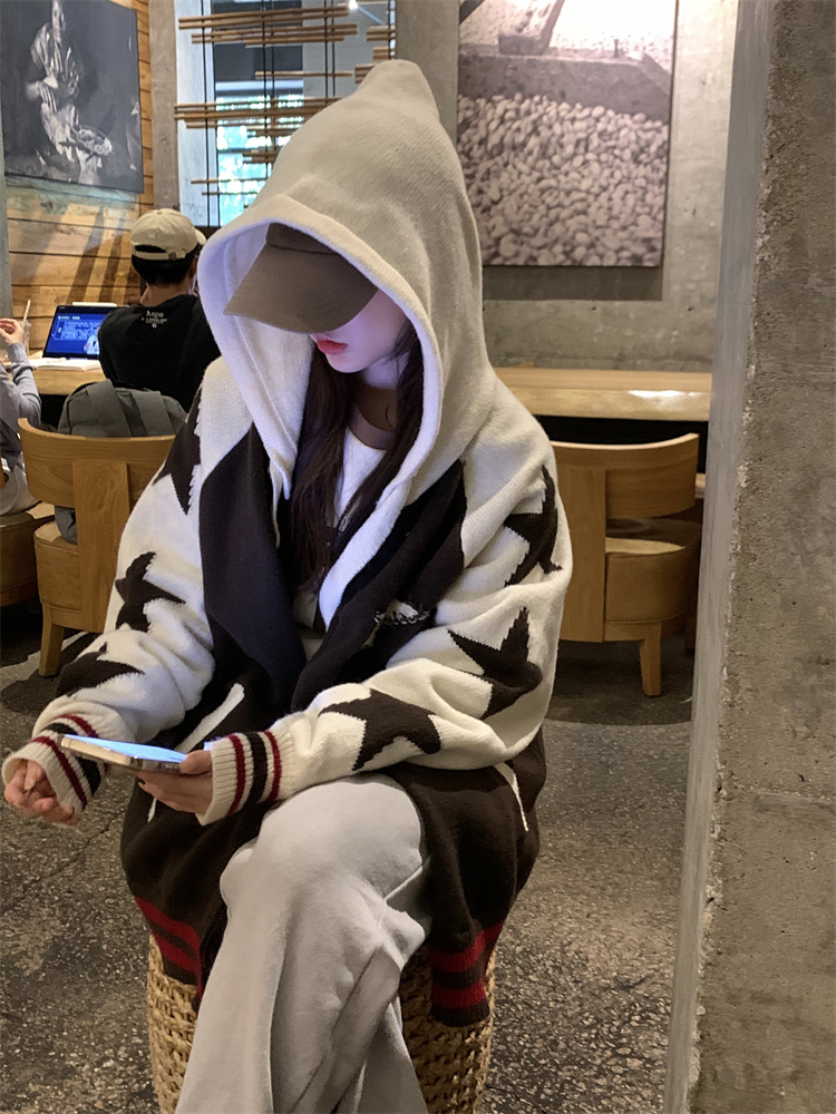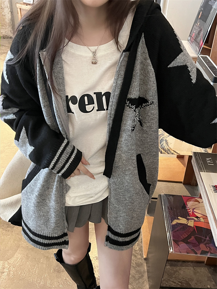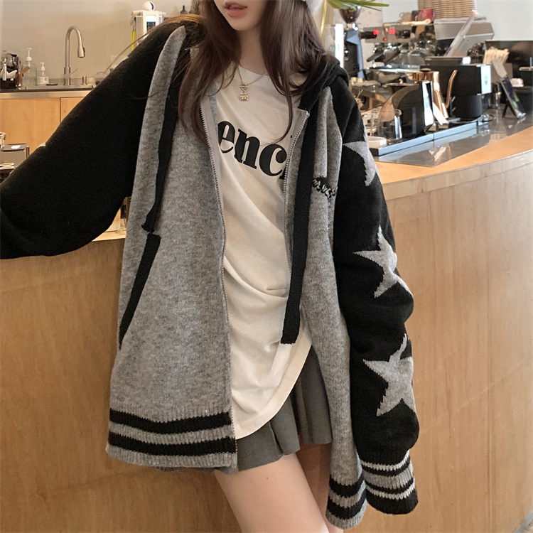 連帽針織衫開衫毛衣女秋冬慵懶風復古撞色拼接設計感小眾寬鬆外套