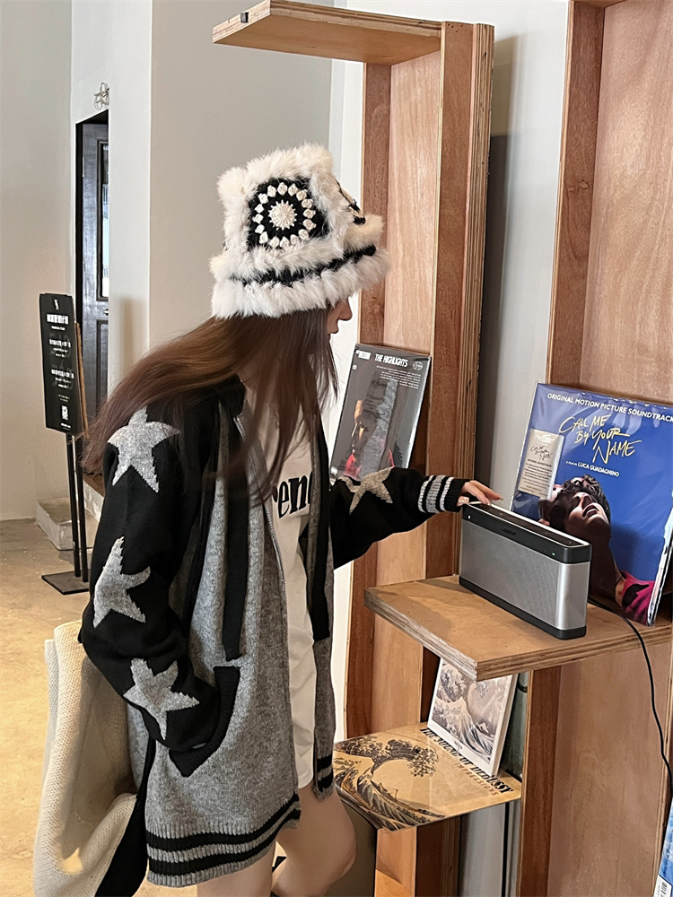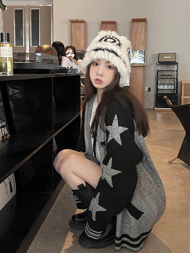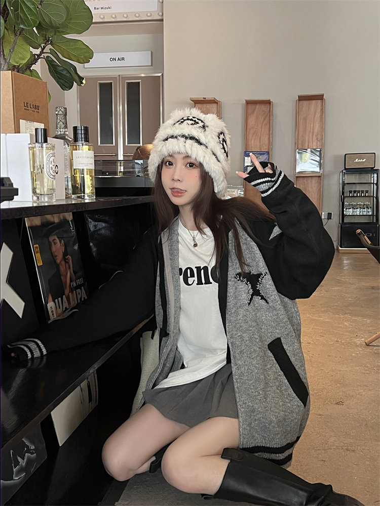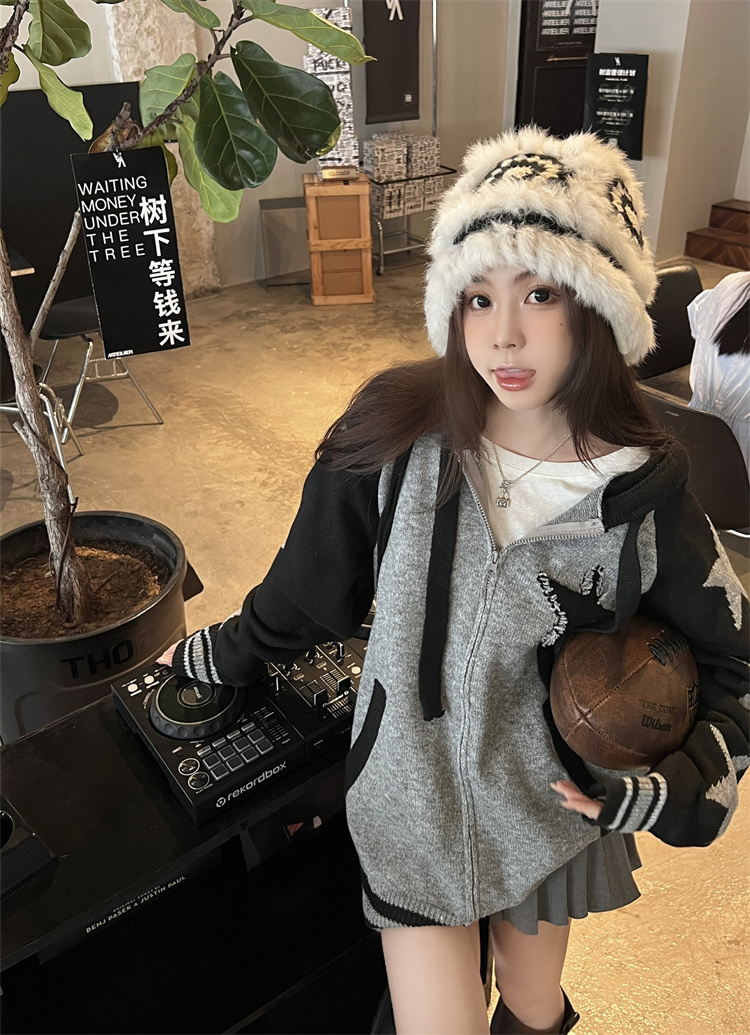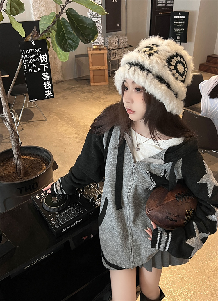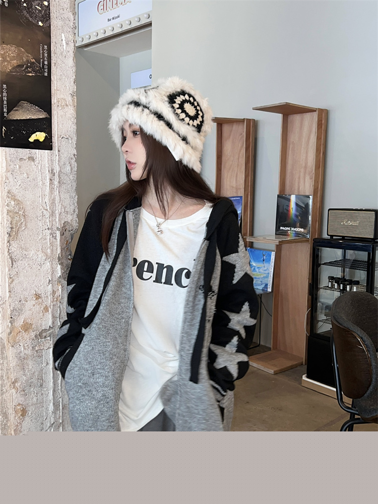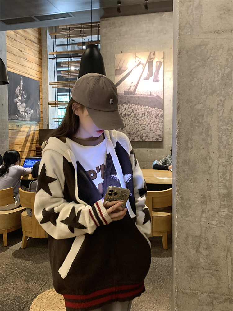 連帽針織衫開衫毛衣女秋冬慵懶風復古撞色拼接設計感小眾寬鬆外套