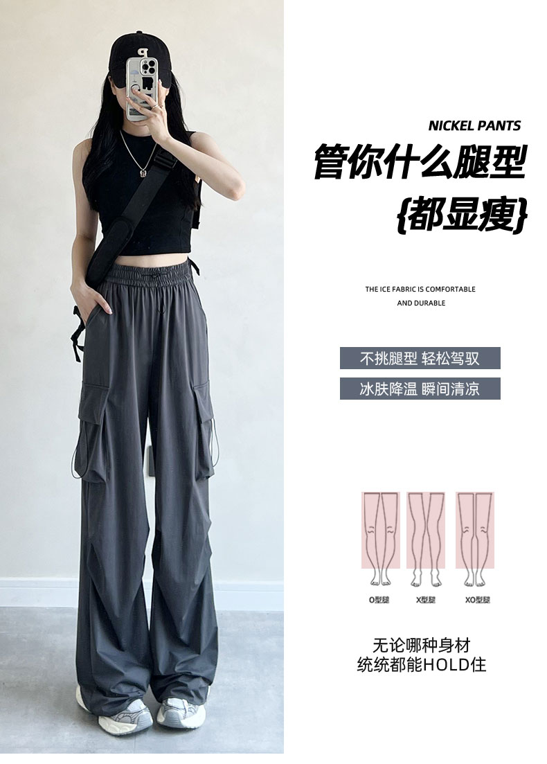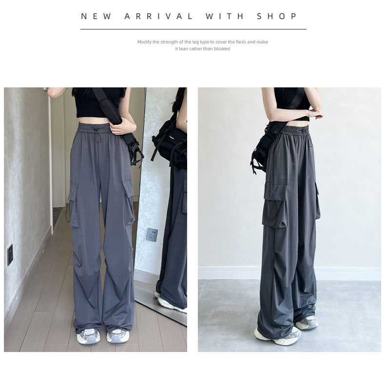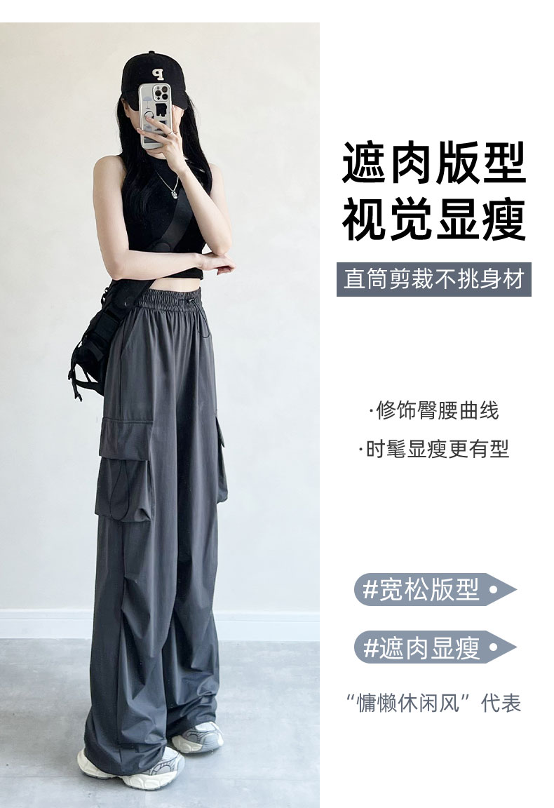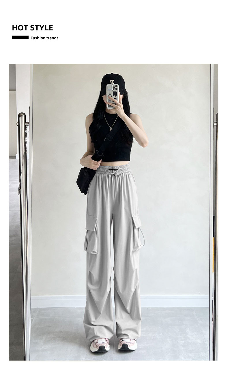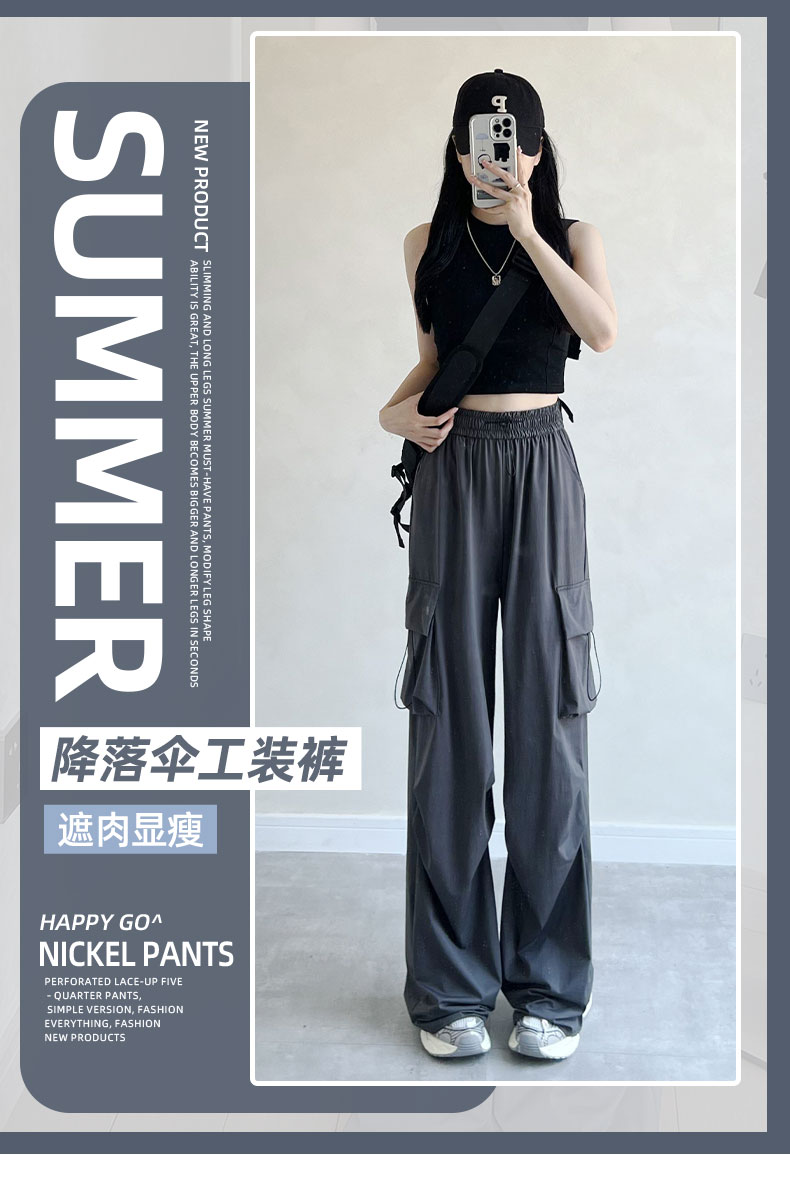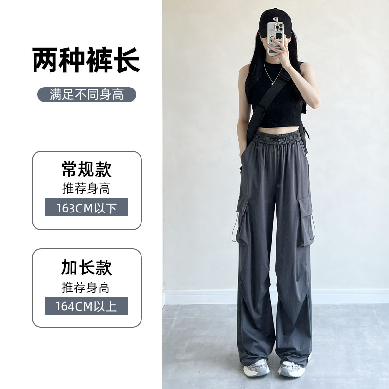 灰色工裝褲女夏季2023新款高腰降落傘褲休閒寬褲速乾美式運動褲