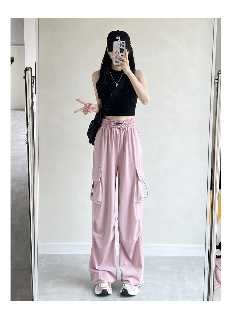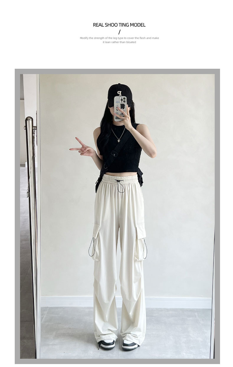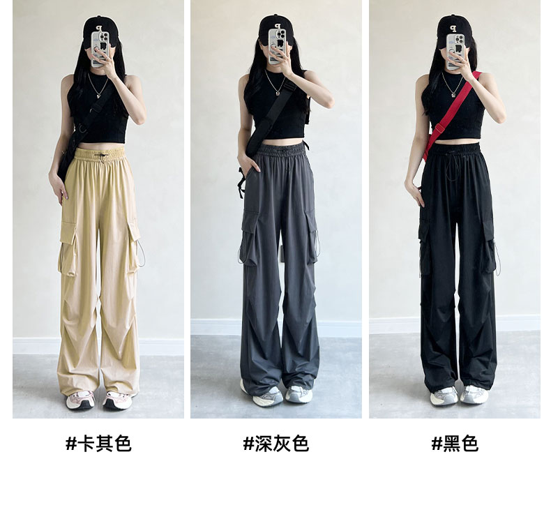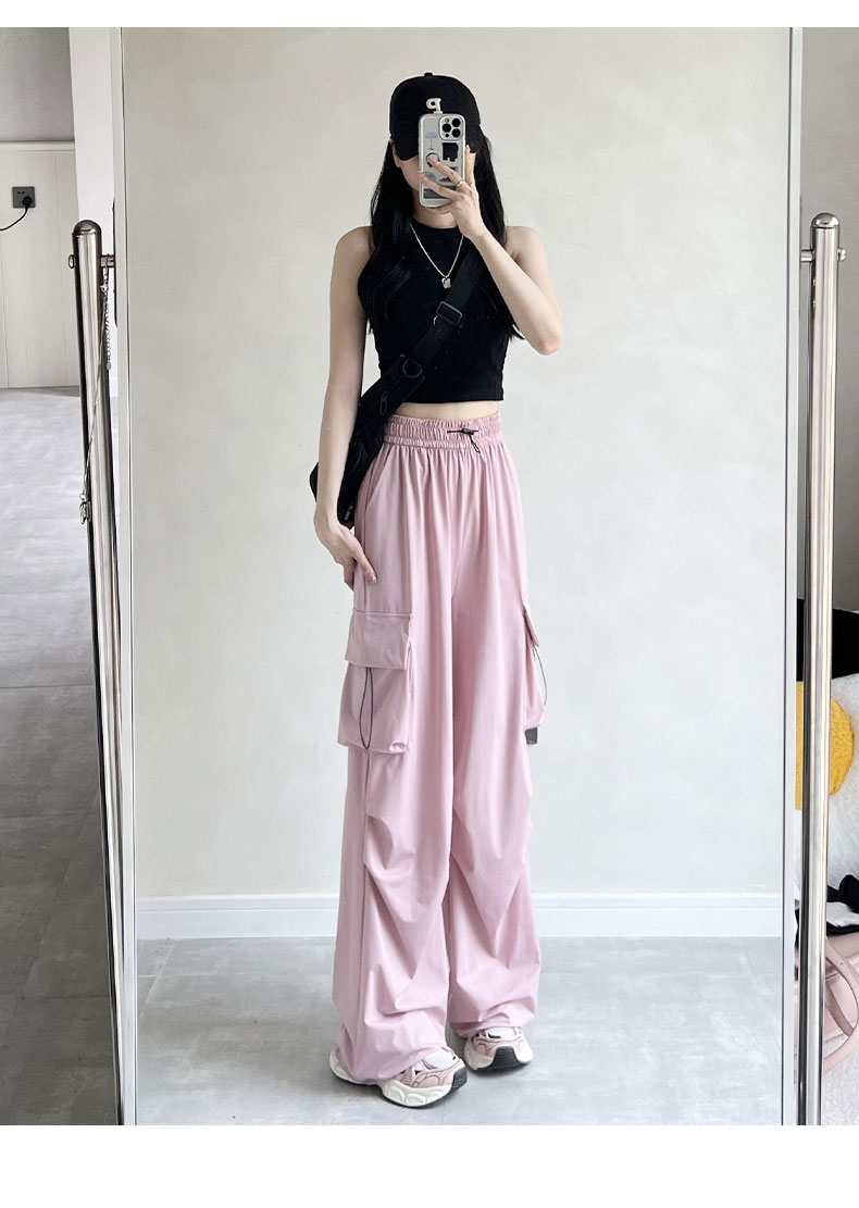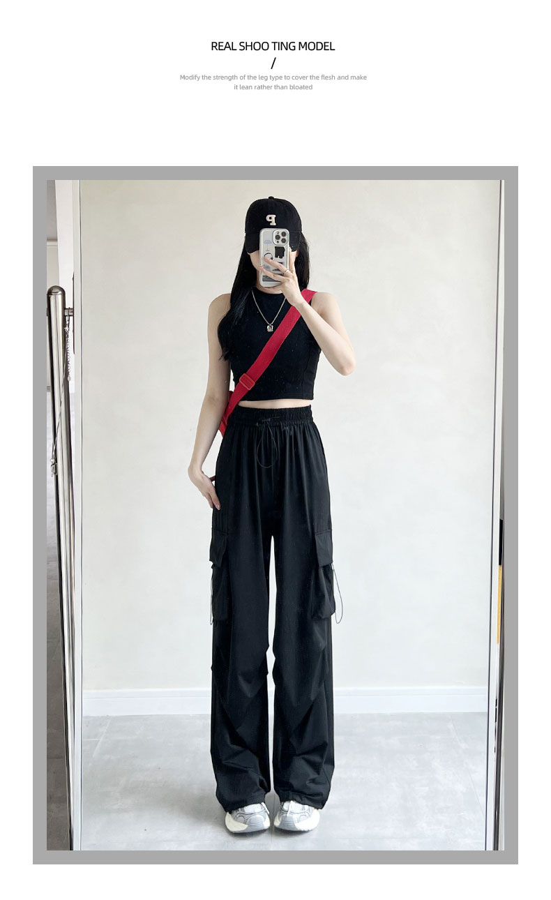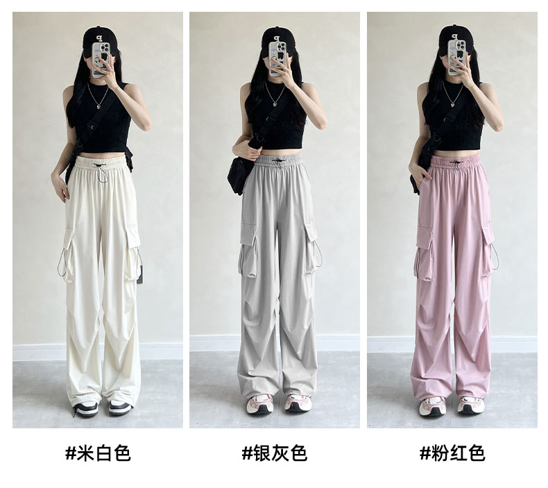 灰色工裝褲女夏季2023新款高腰降落傘褲休閒寬褲速乾美式運動褲