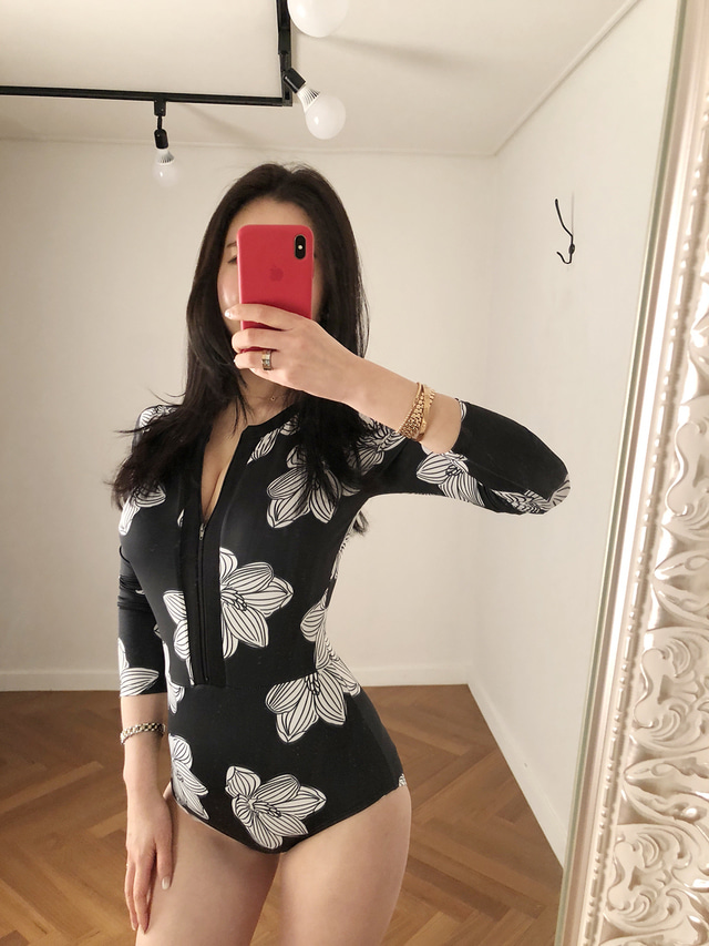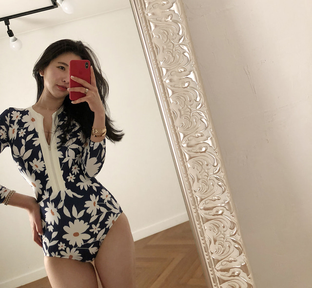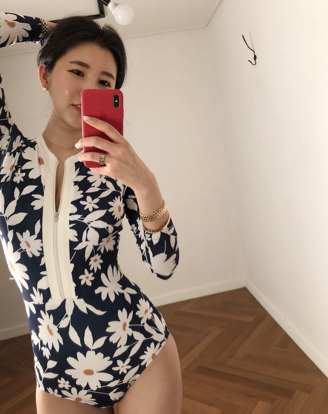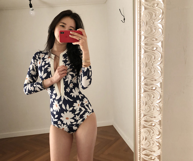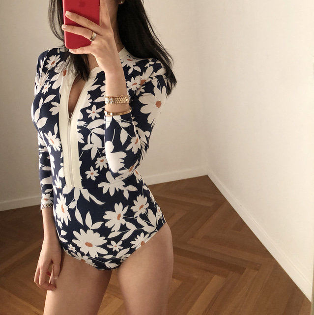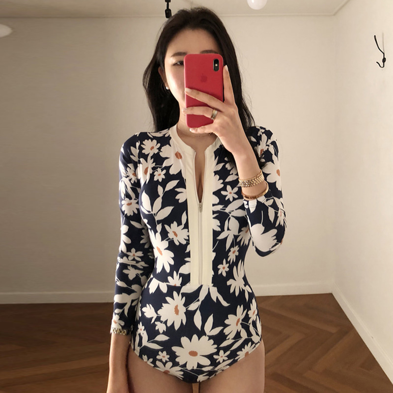 韓國潛水服女度假網紅防曬長袖泳衣女拉鍊印花修身速乾衝浪水母衣