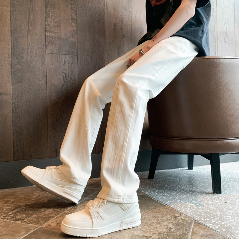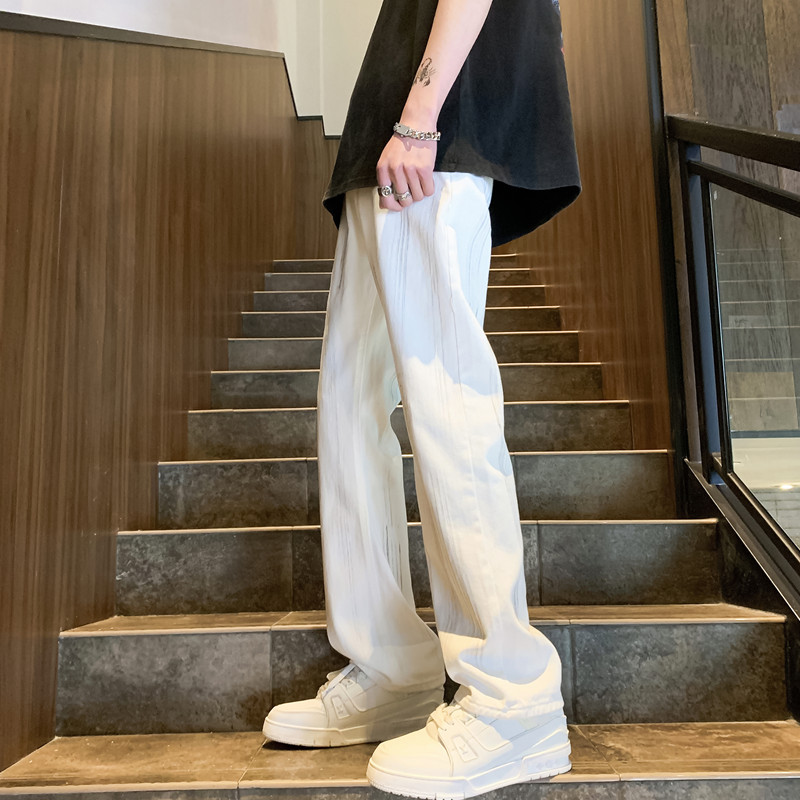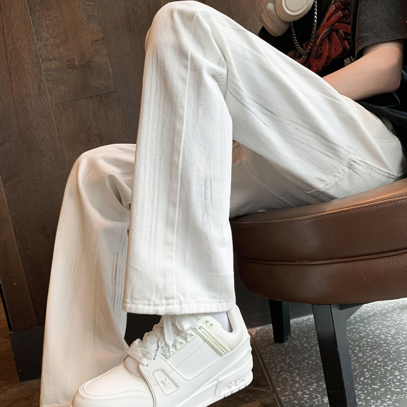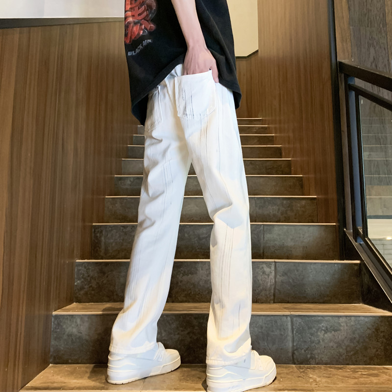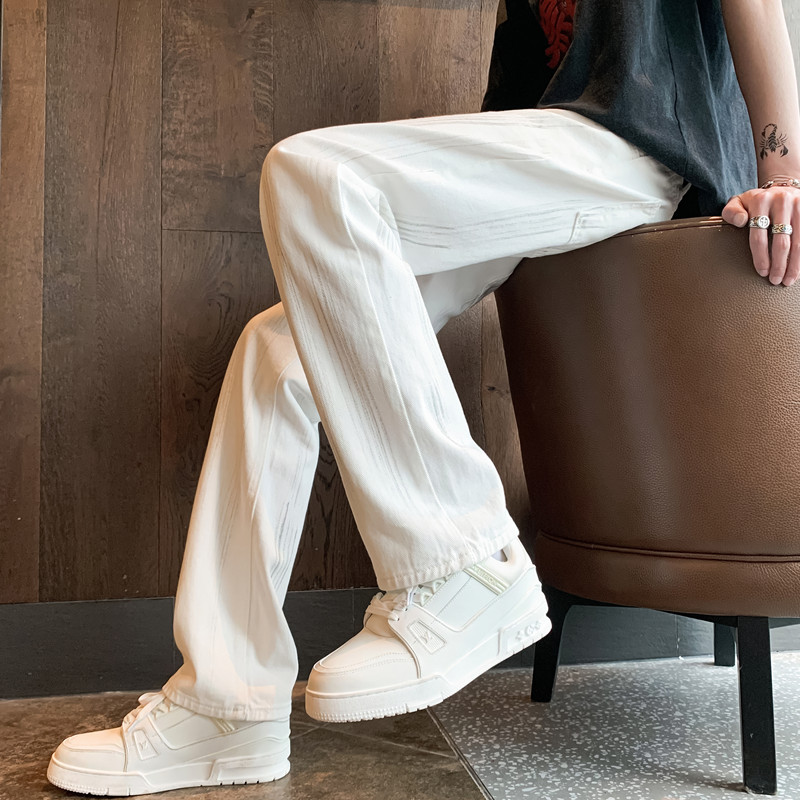 白色紮染牛仔褲夏季薄款高級感痞帥直筒褲子美式高街微喇修身長褲