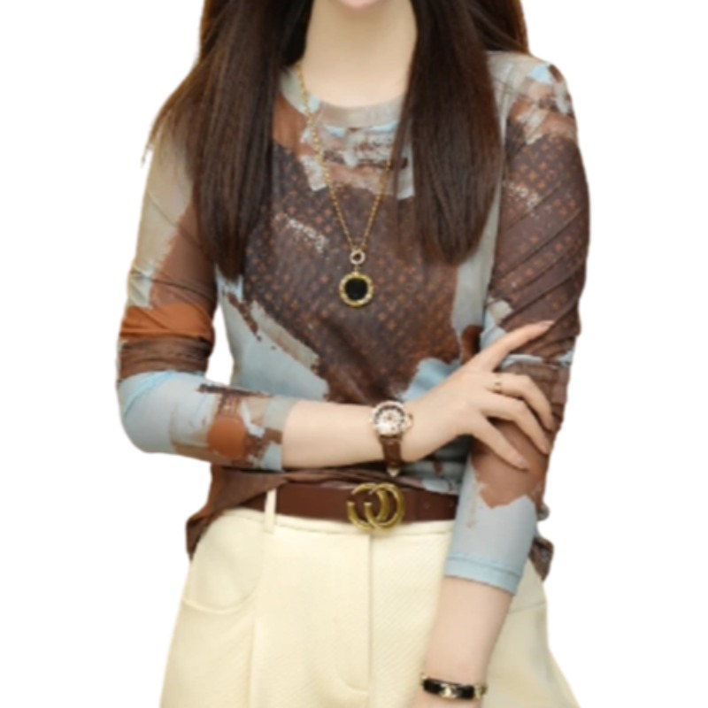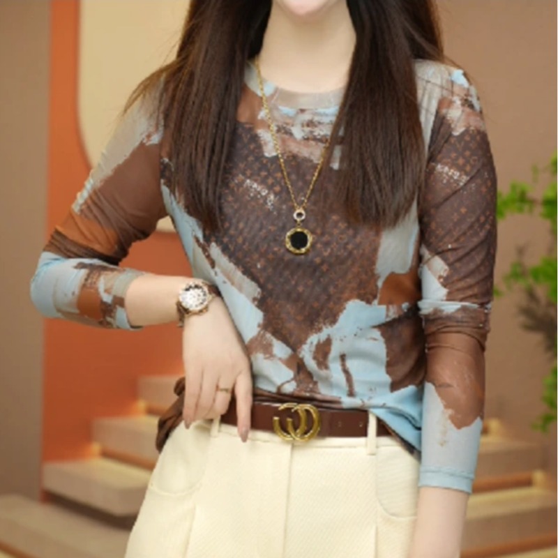 紮染網紗T恤長袖秋季2023新款高級感印花時尚內搭打底衫修身上衣