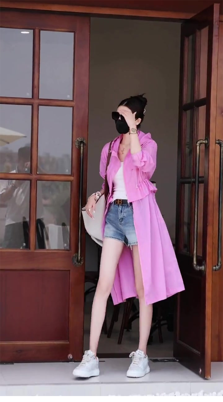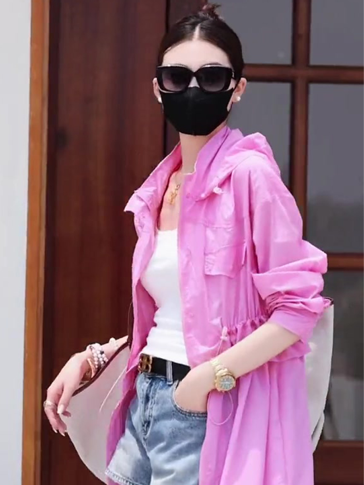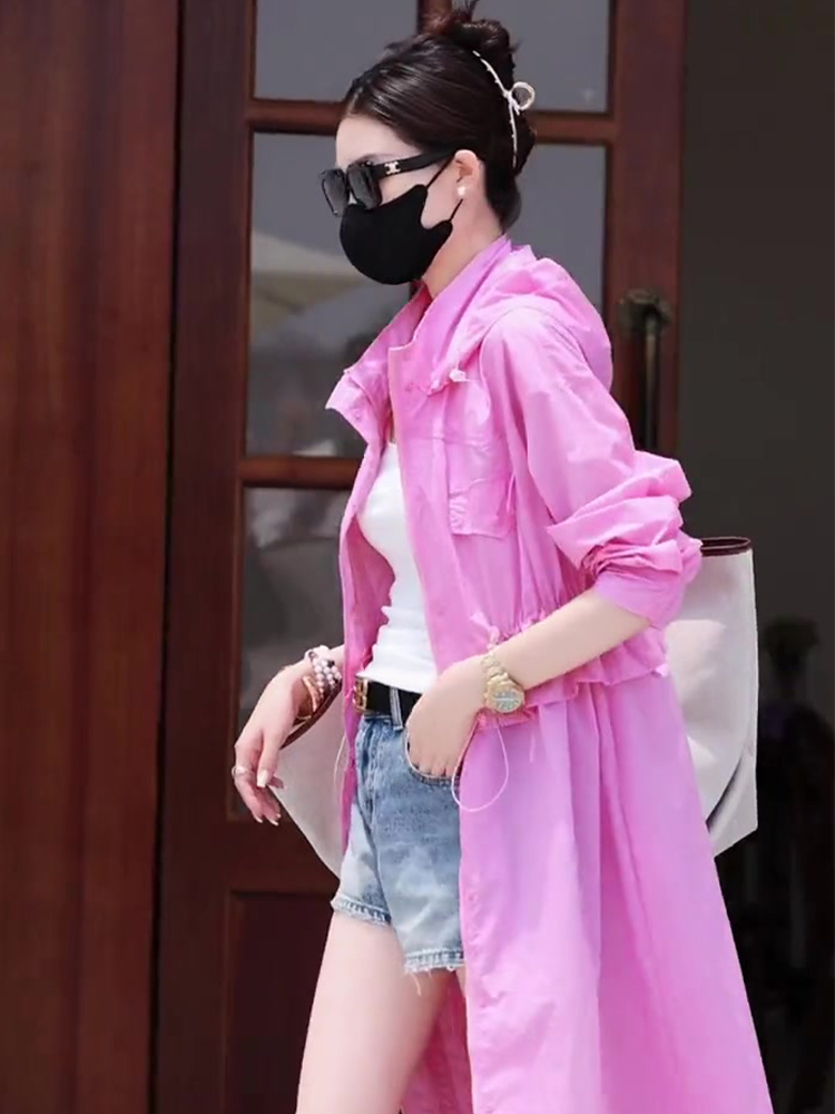 粉色可拆卸長版防曬衣夏季女裝2023新款小眾設計感連帽休閒防曬服