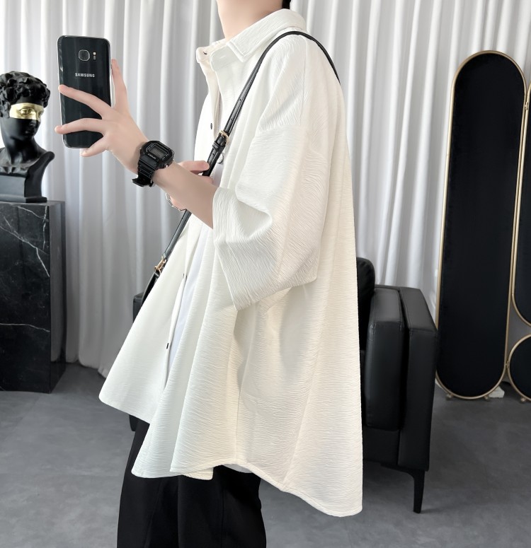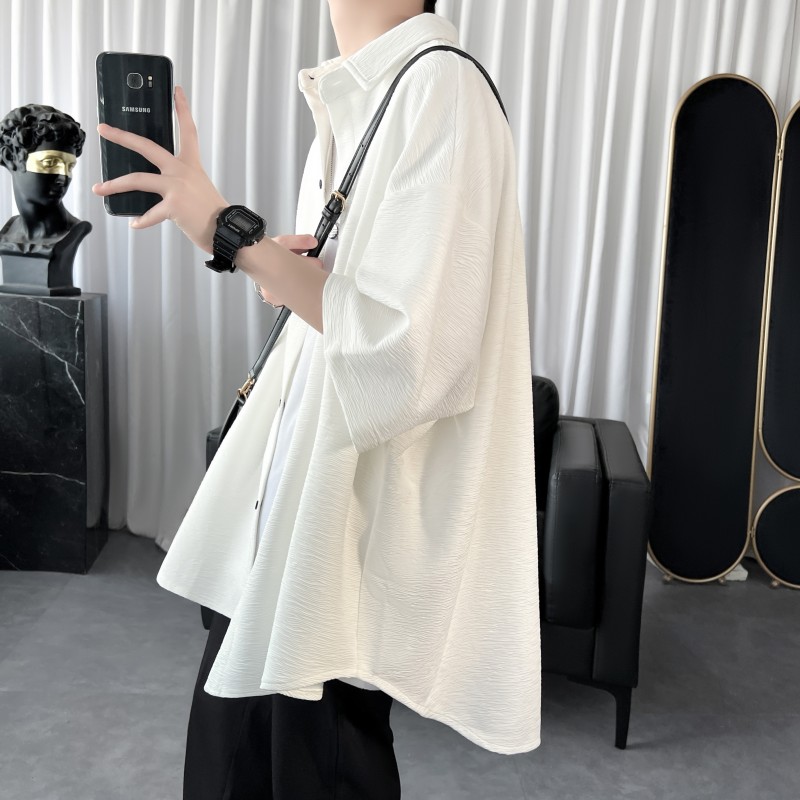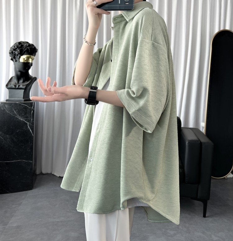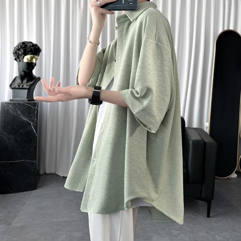 薄荷綠七分袖短袖襯衫夏季冷淡風男裝高級感褶皺冰絲襯衫半袖外套