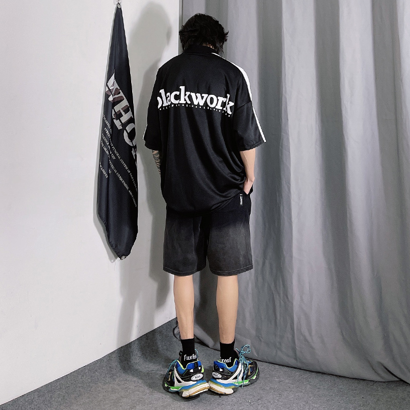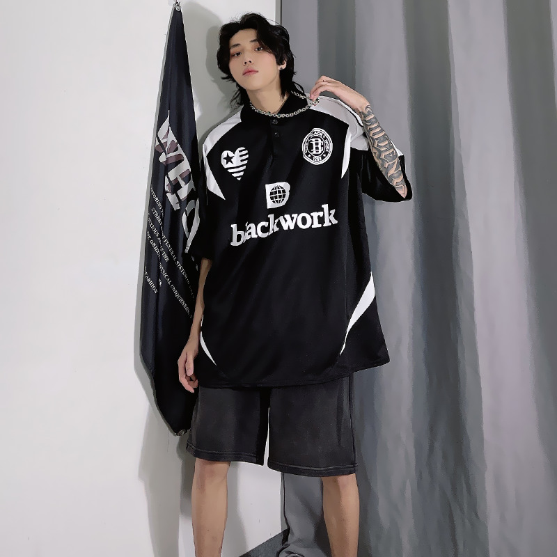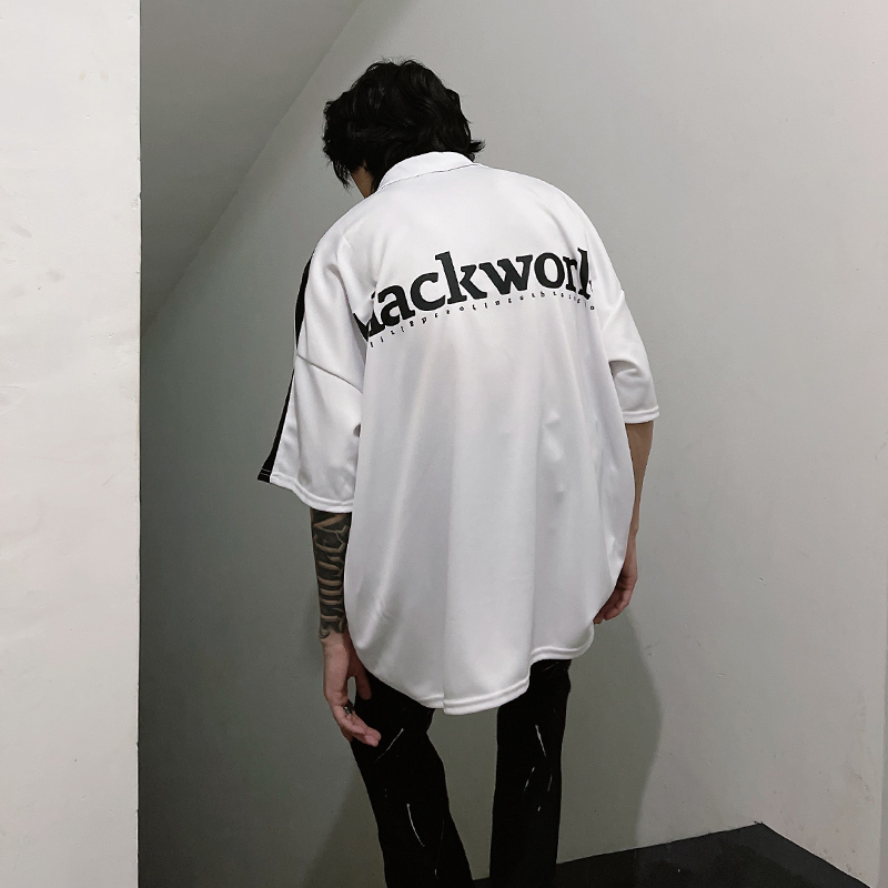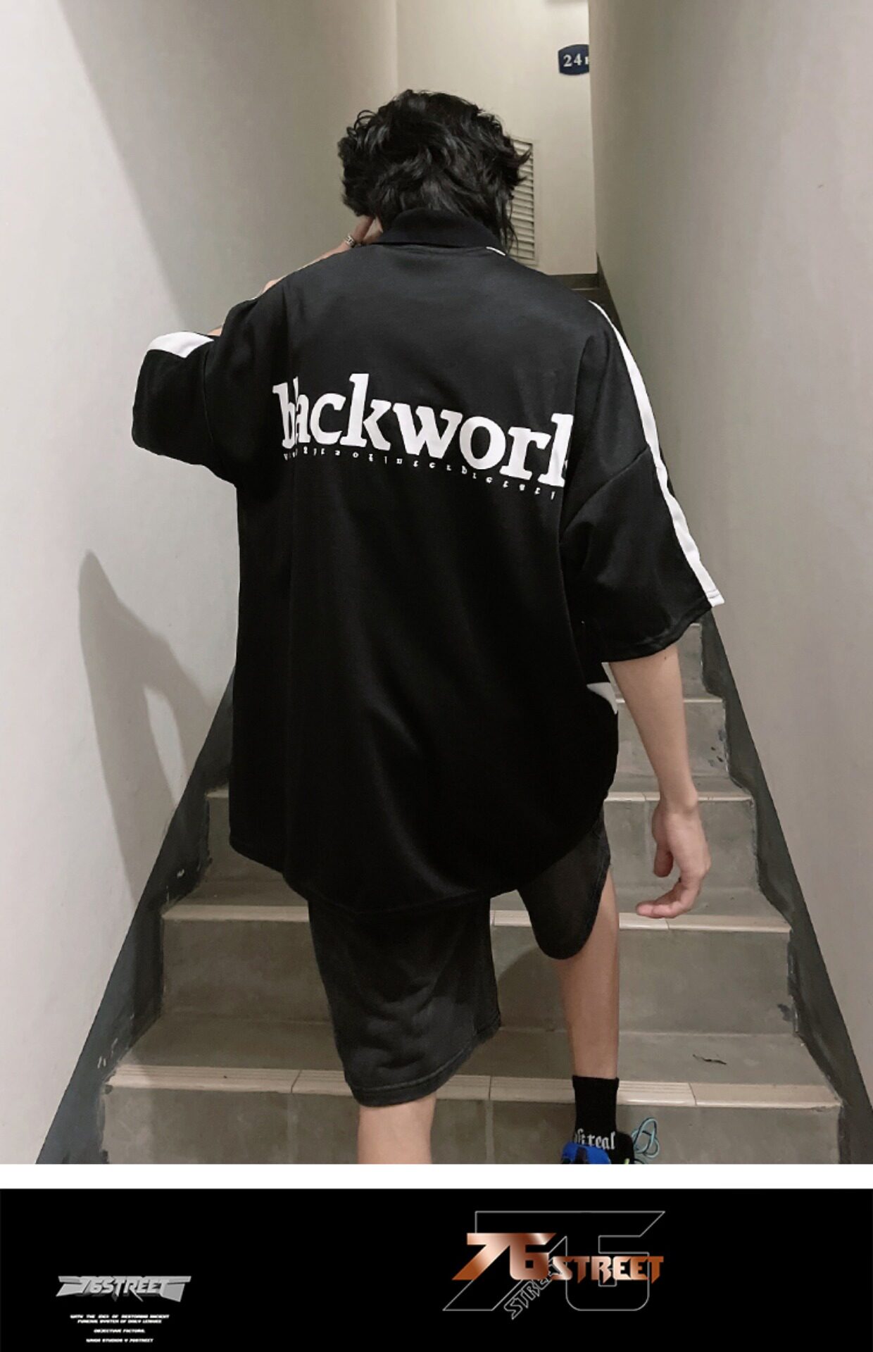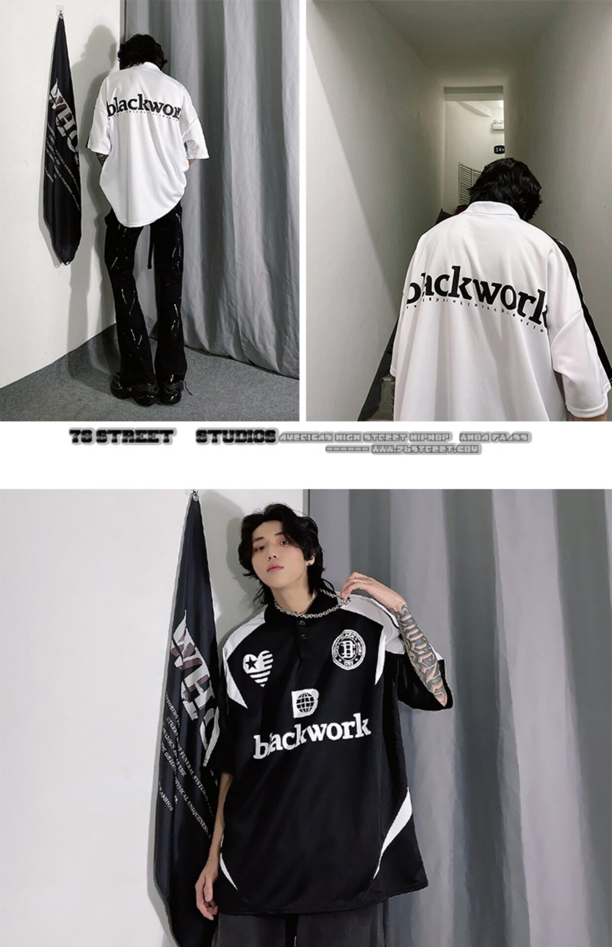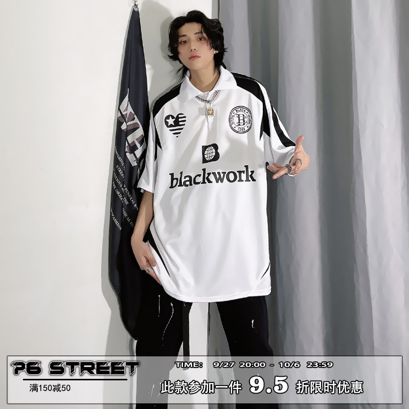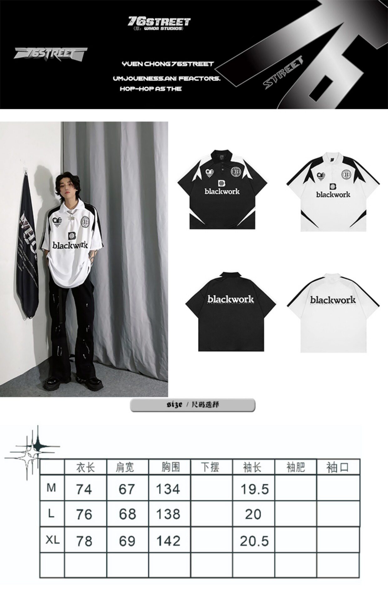 76美式復古短袖t恤男ins高街寬鬆拼接機車衣服印花情侶潮牌polo衫