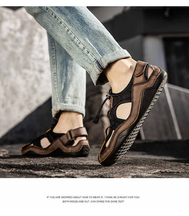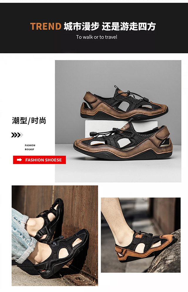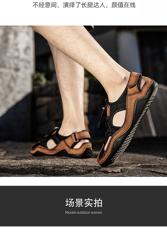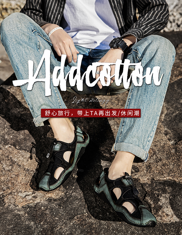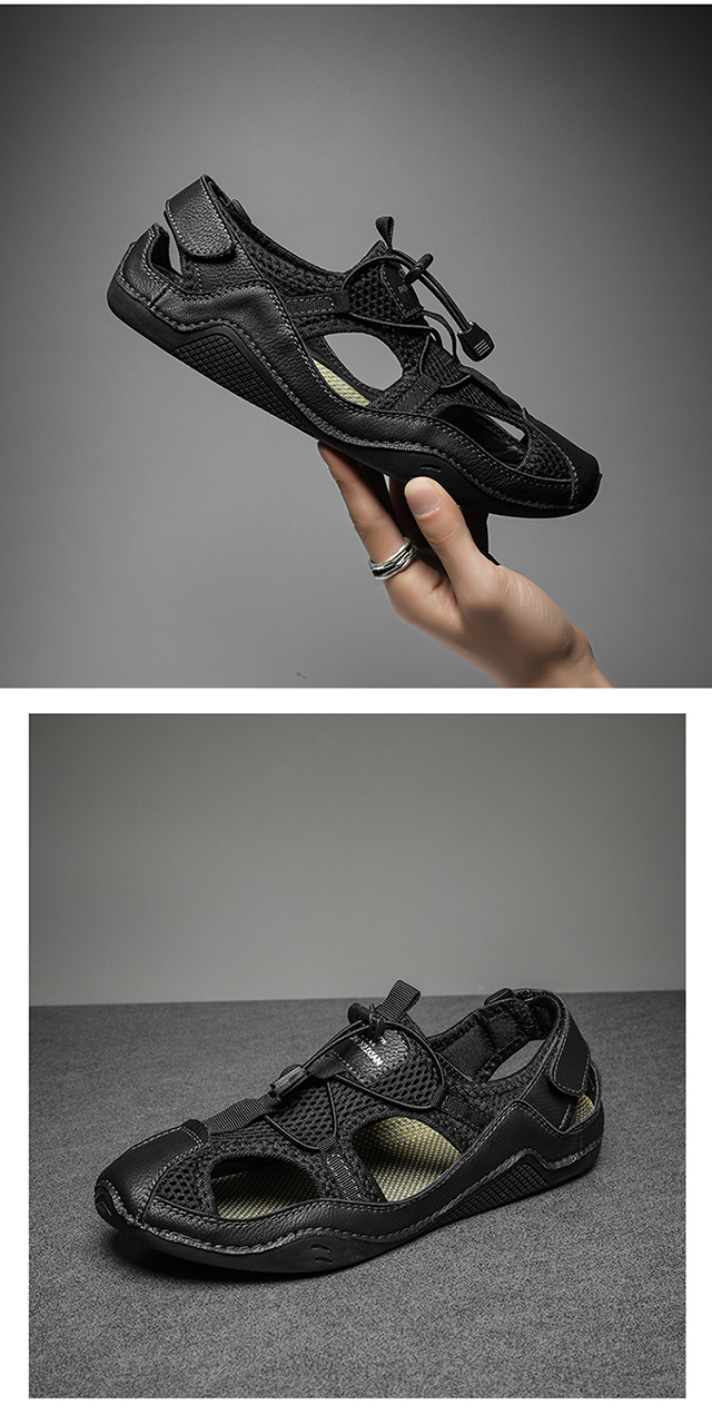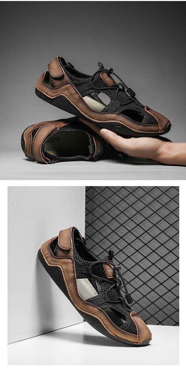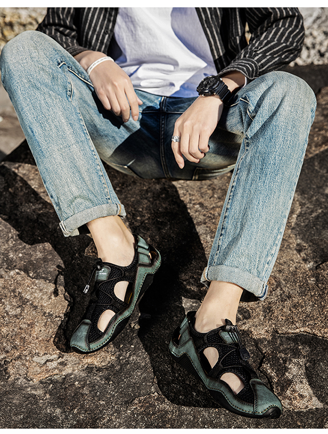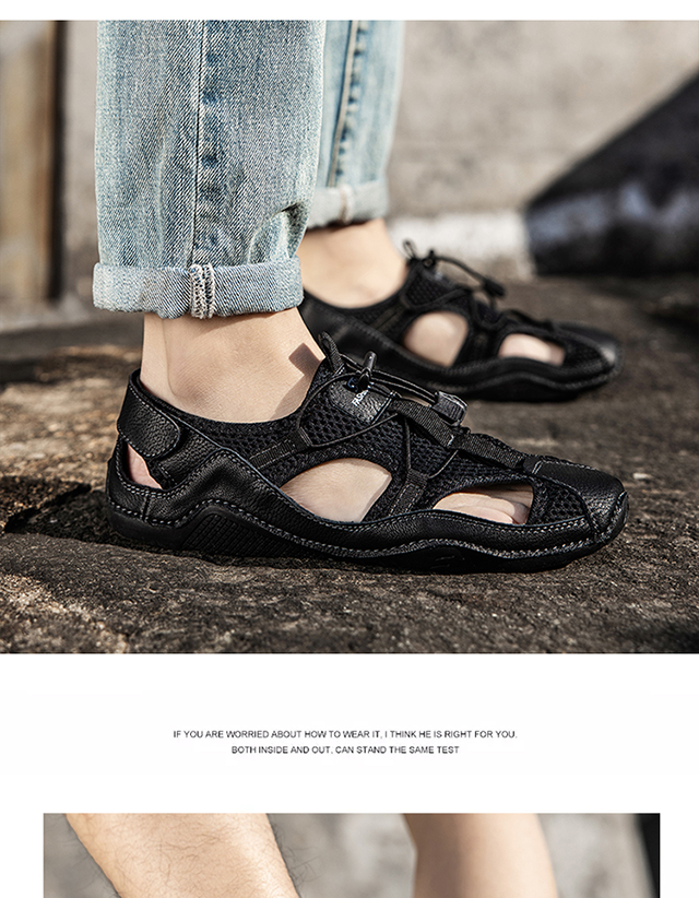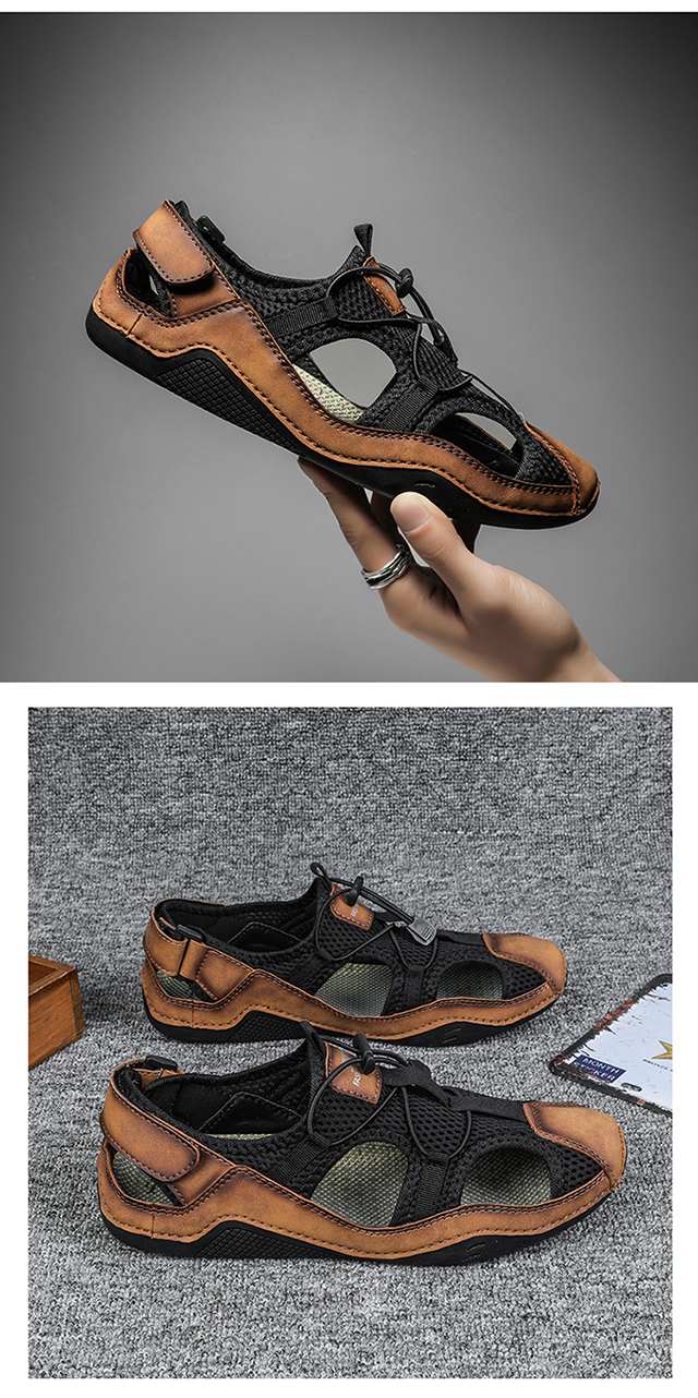 新款開車涼鞋男潮青年休閒透氣夏季2023網面手工縫線沙灘鞋男百搭