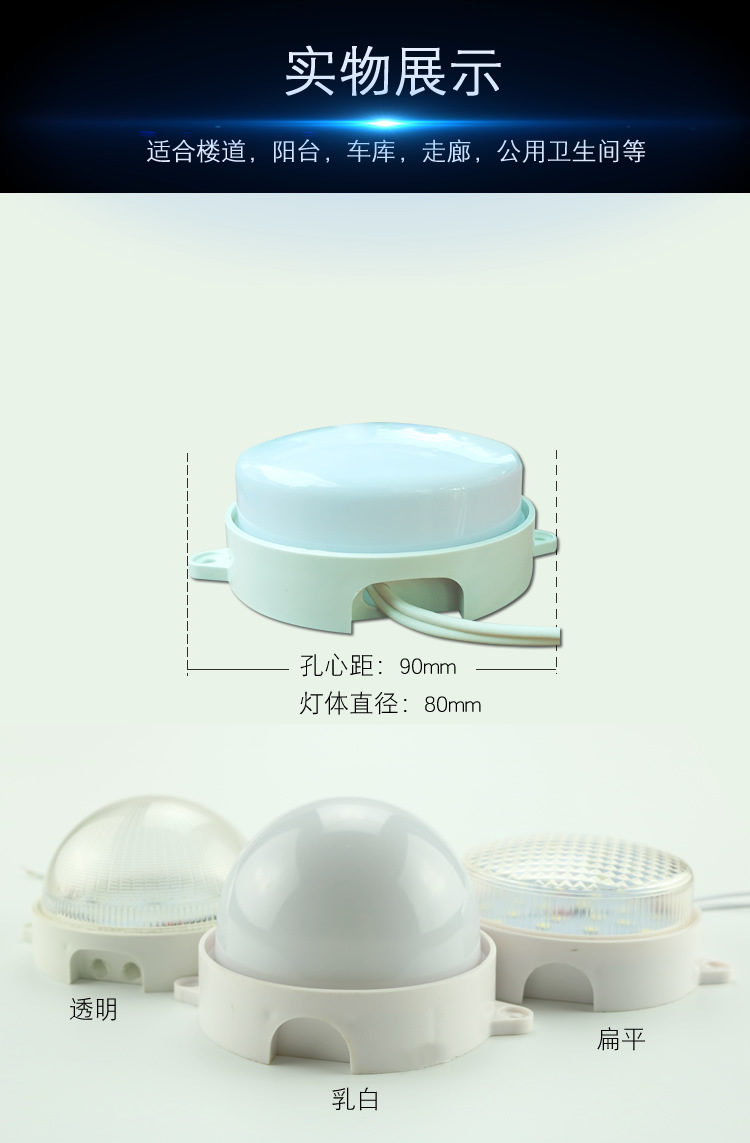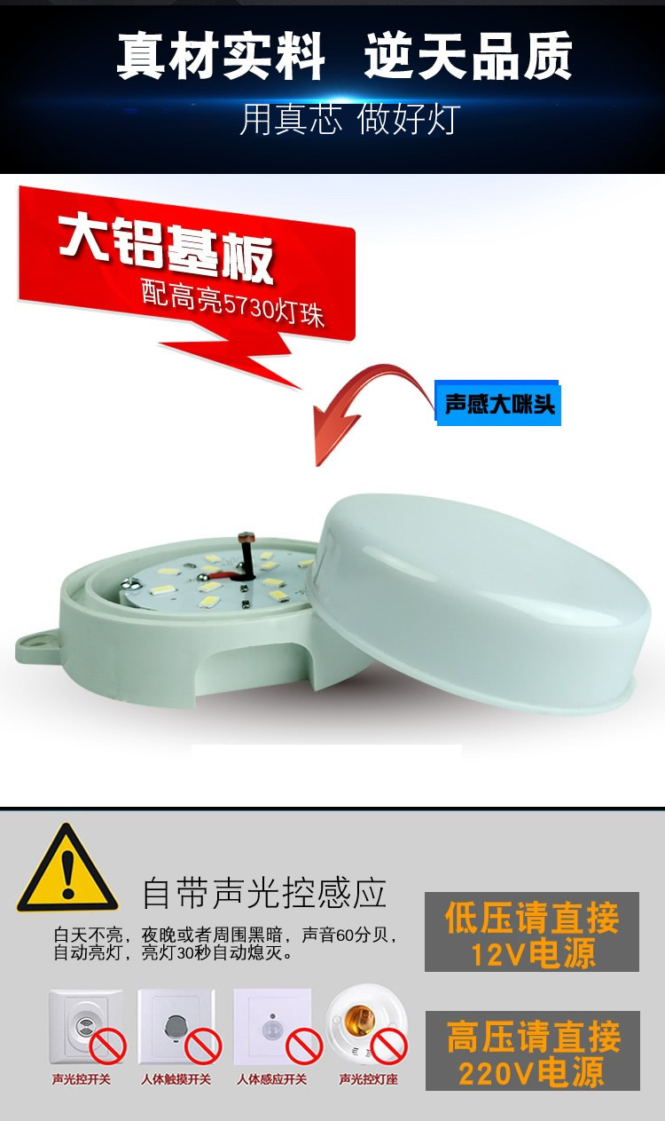 色温 乳白扁平罩声光控12V 只能接12V电源,乳白半圆罩声光控12V 只能接12V电源,透明扁平罩声光控220V 只能接220V电源,透明半圆罩声光控220V 只能接220V电源