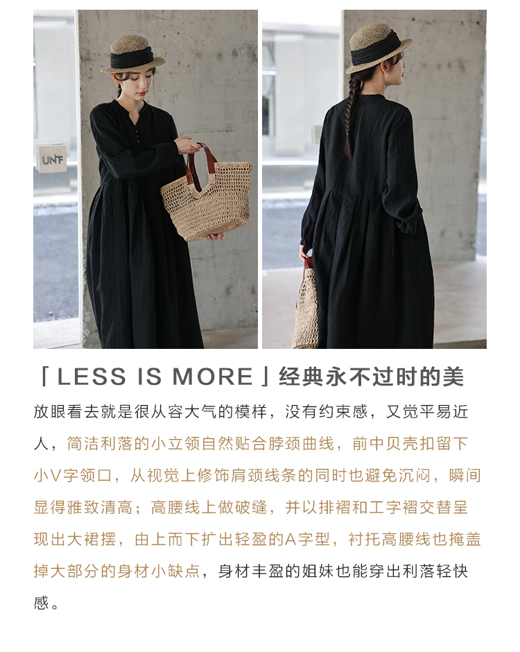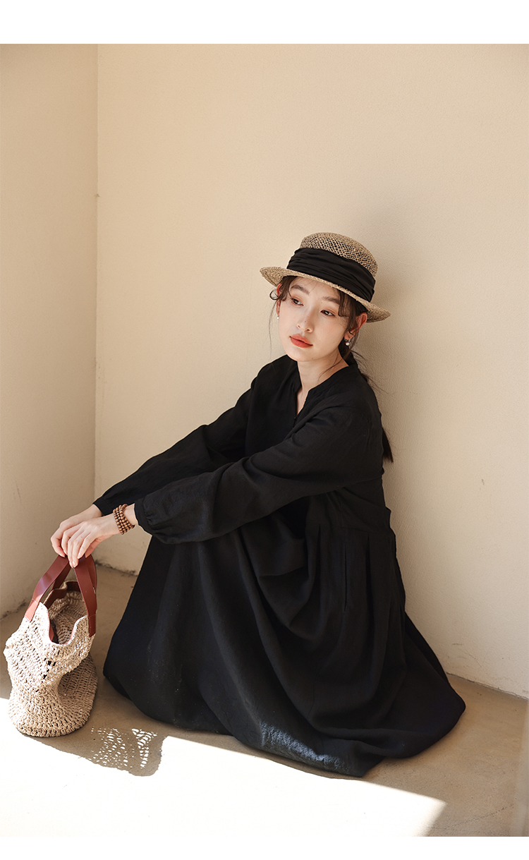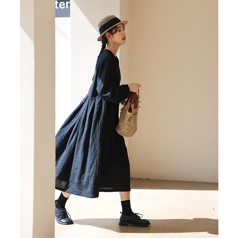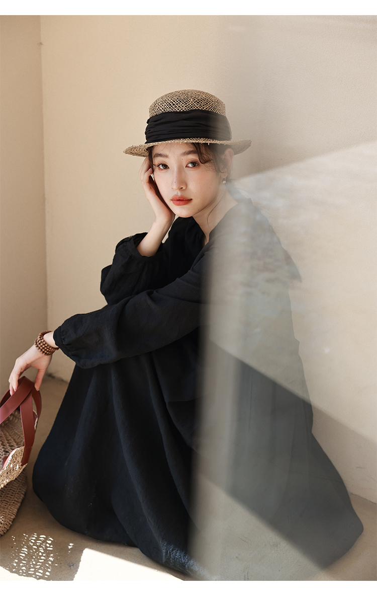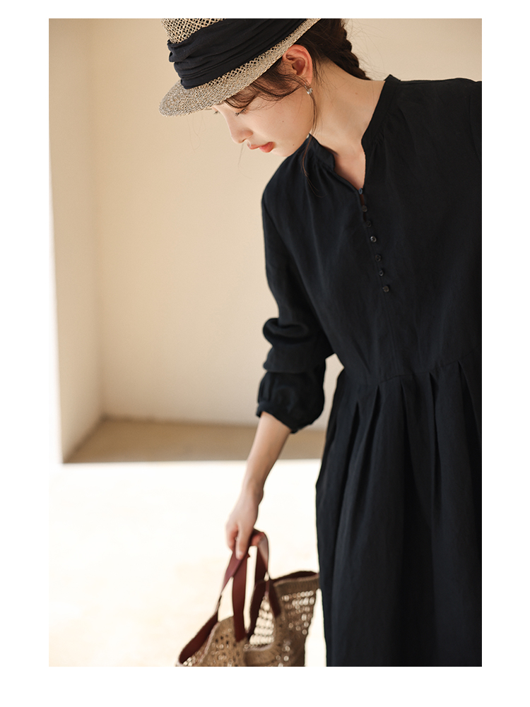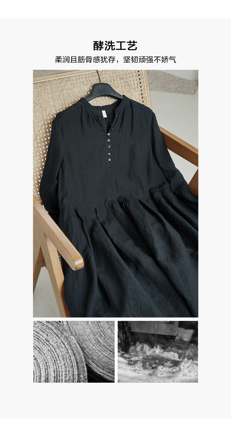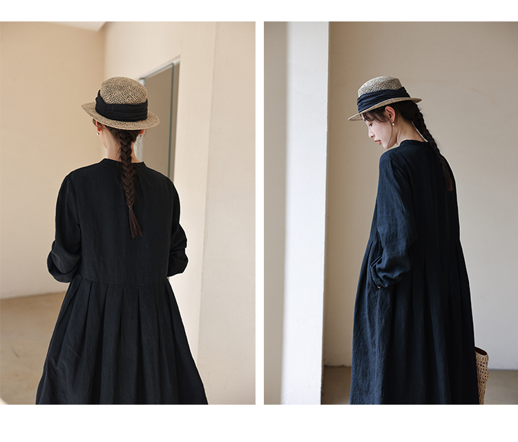 可然琉月 100%法國石紋褶皺亞麻2023秋季新款小黑裙中長版洋裝