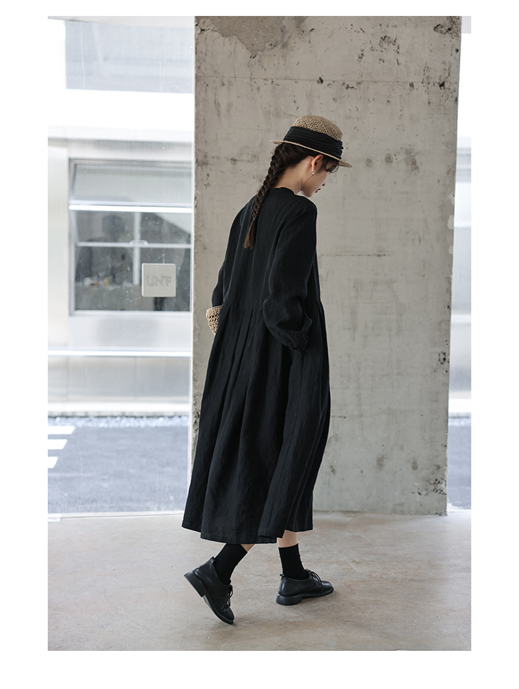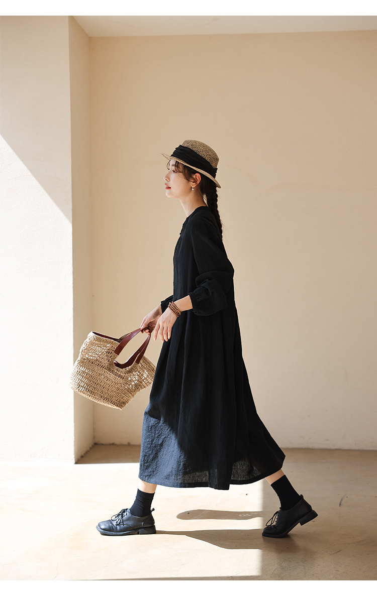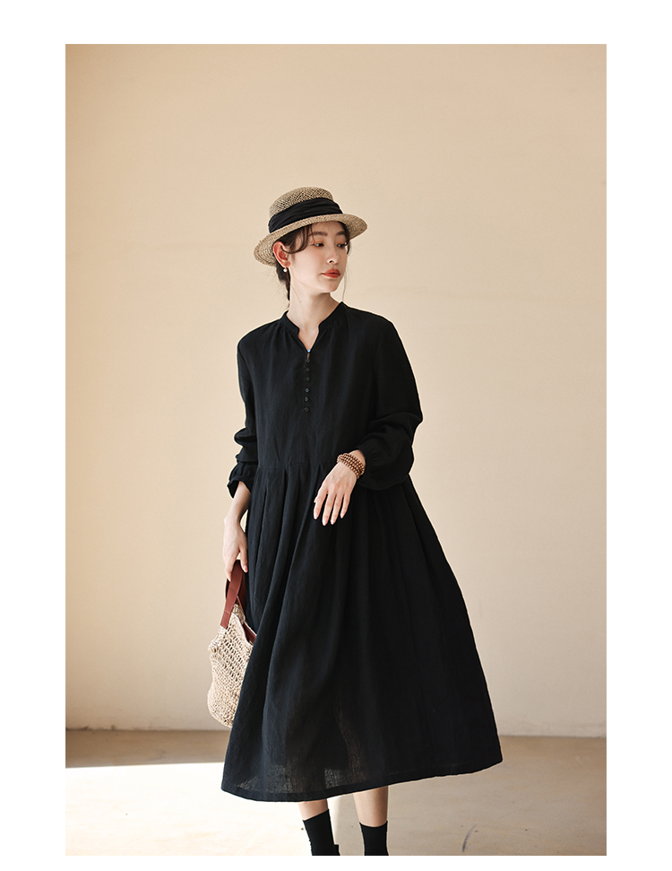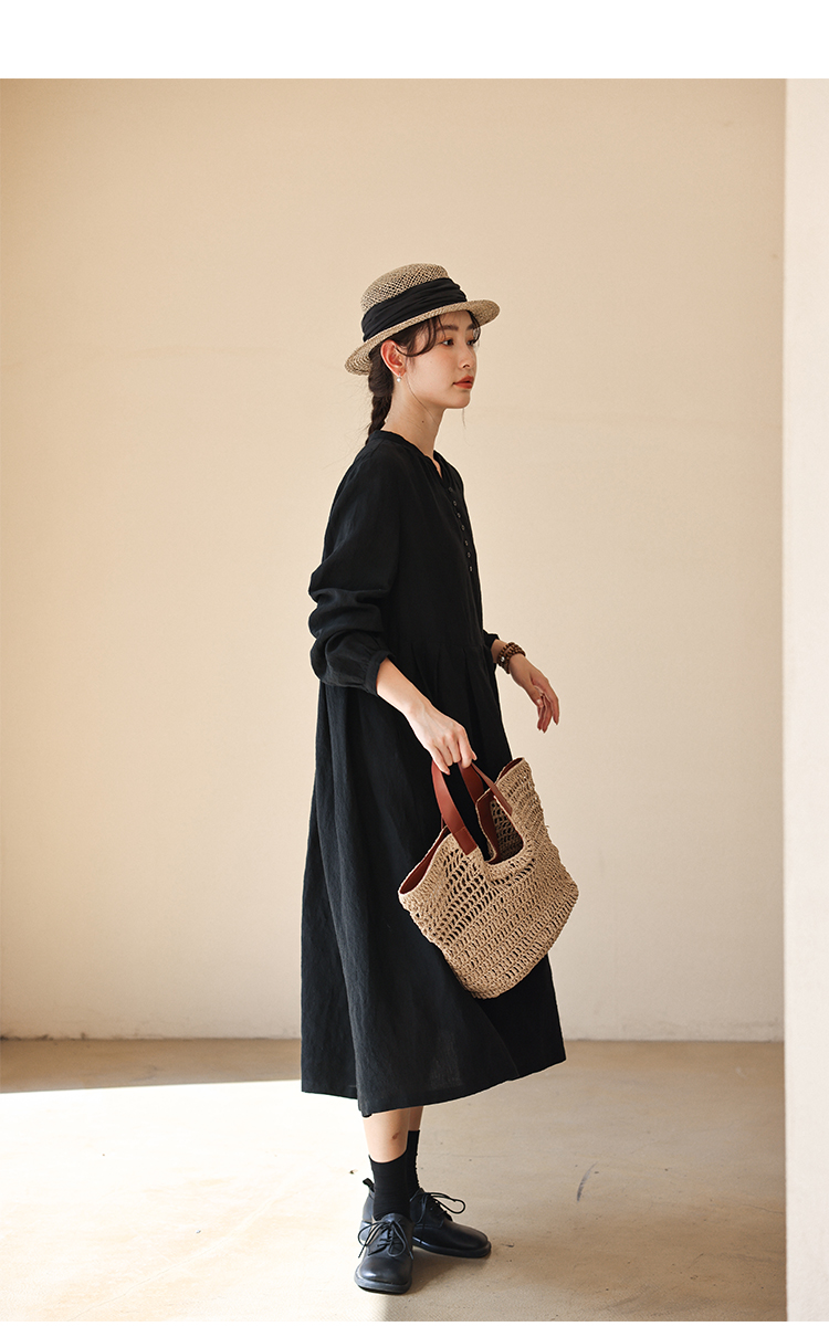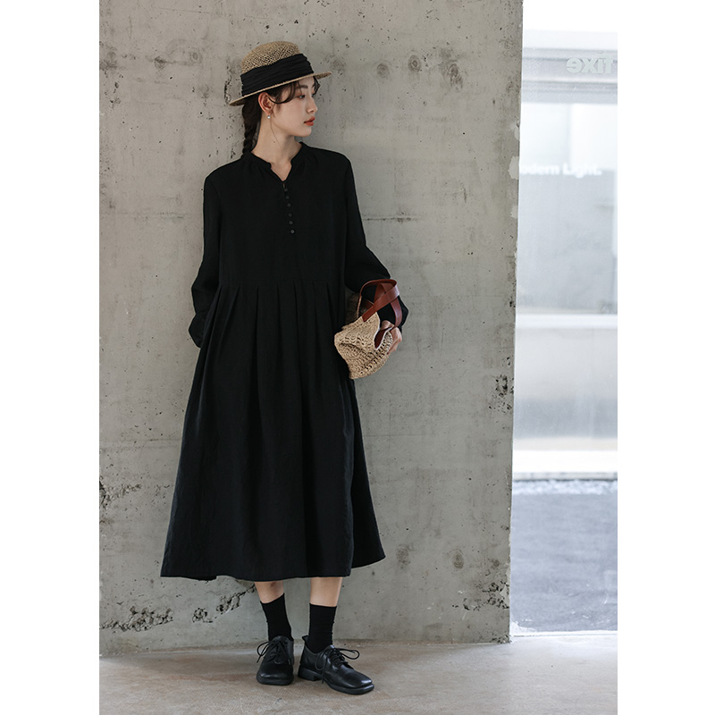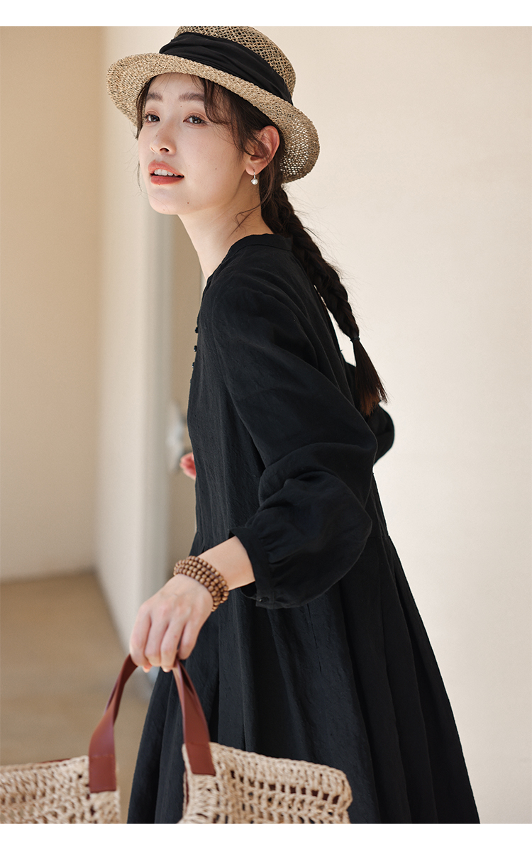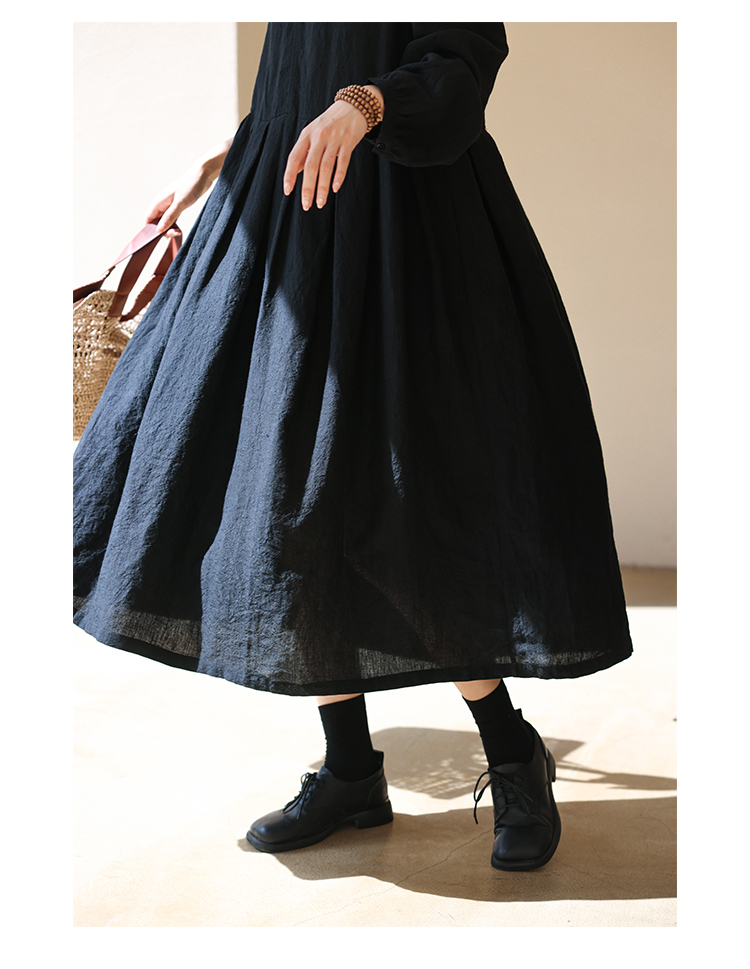 可然琉月 100%法國石紋褶皺亞麻2023秋季新款小黑裙中長版洋裝