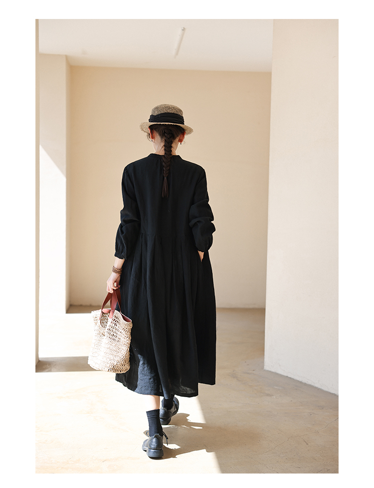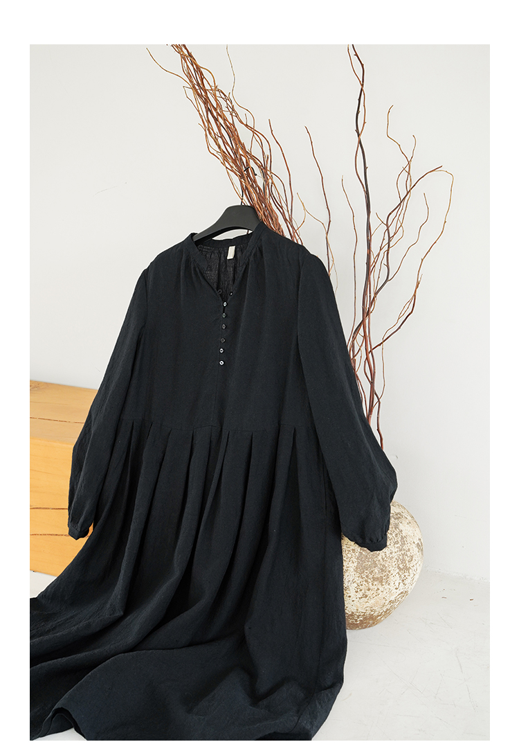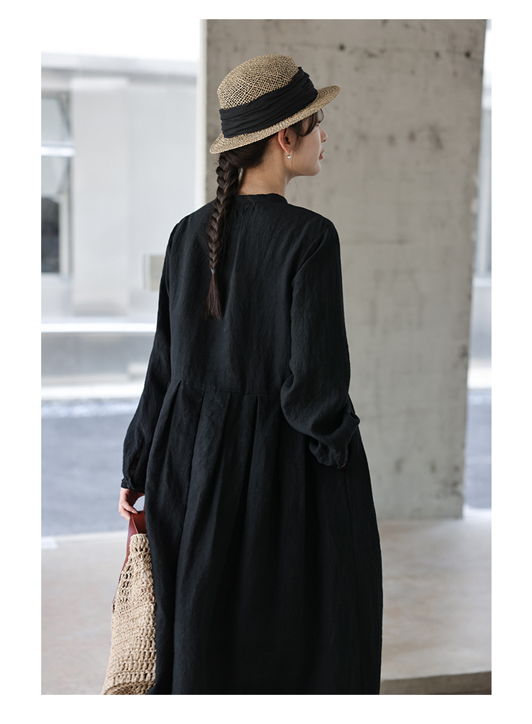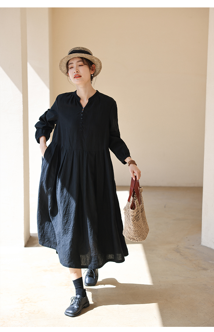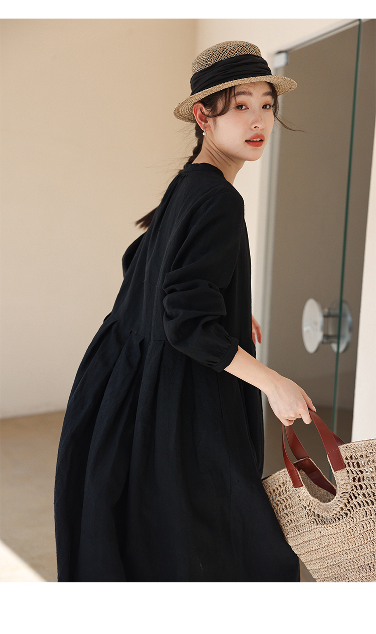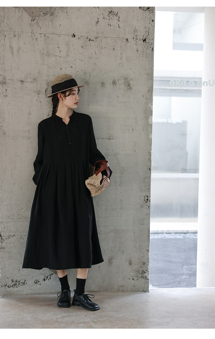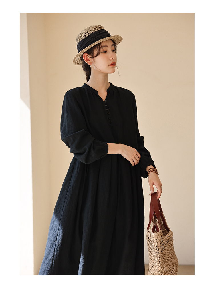 可然琉月 100%法國石紋褶皺亞麻2023秋季新款小黑裙中長版洋裝